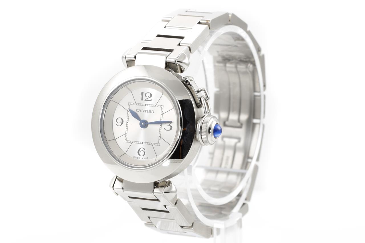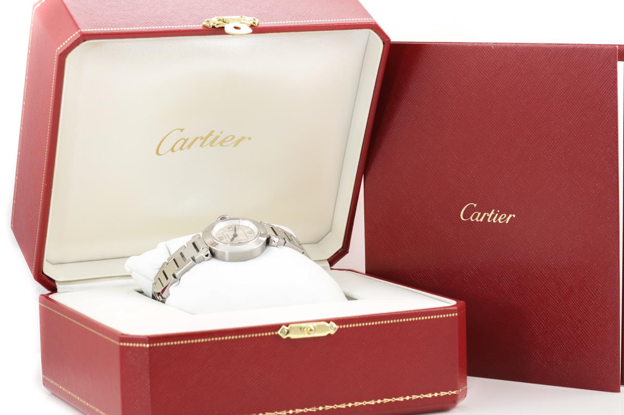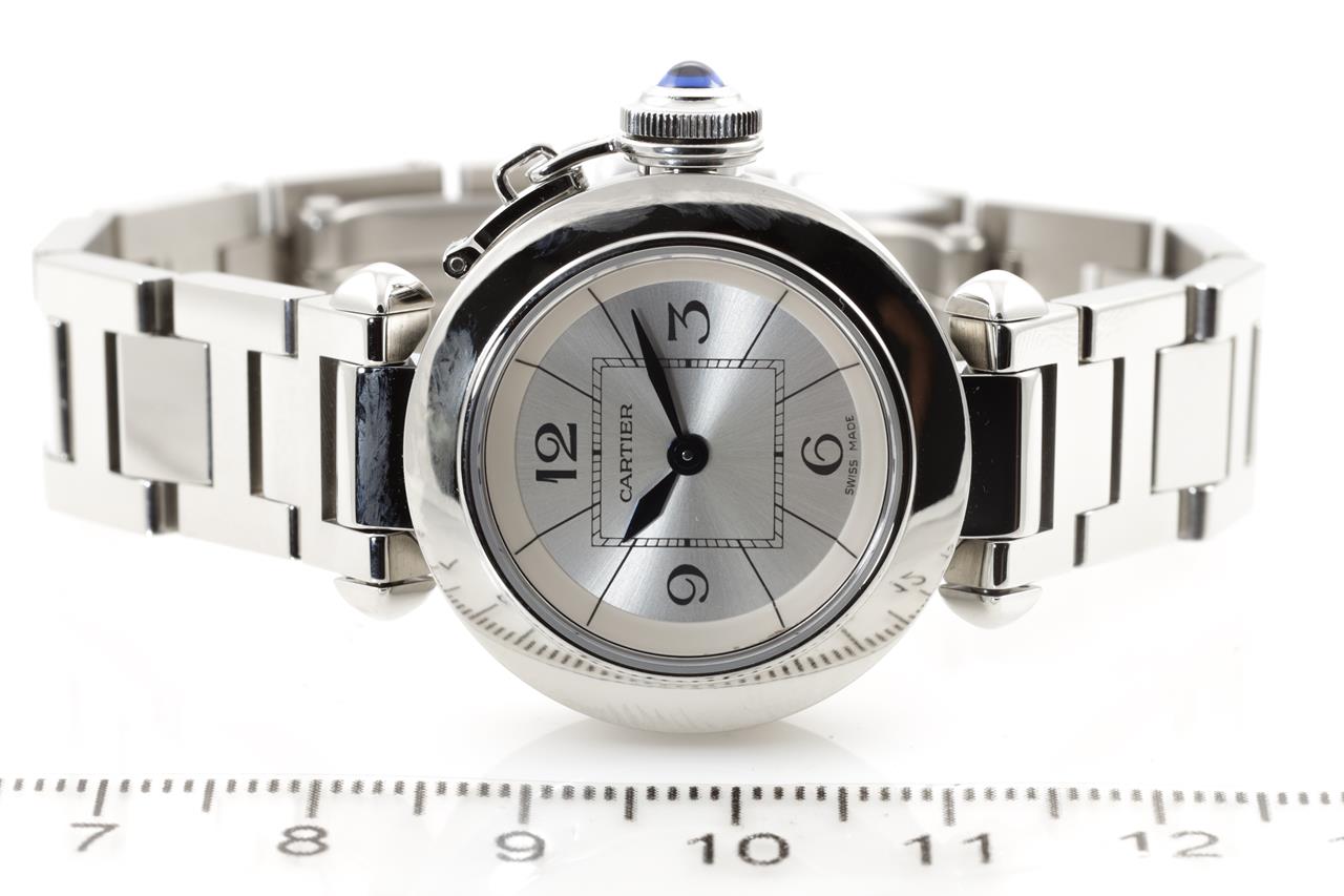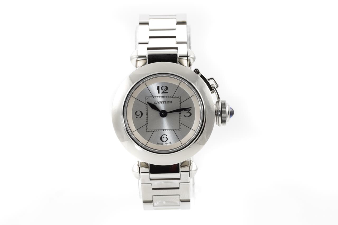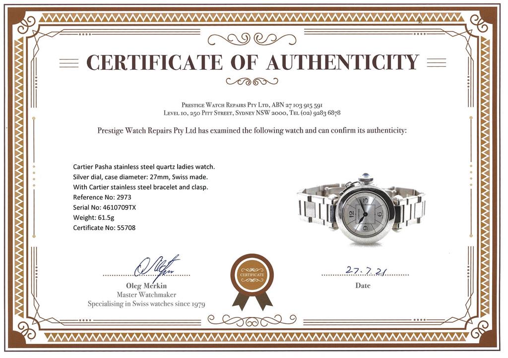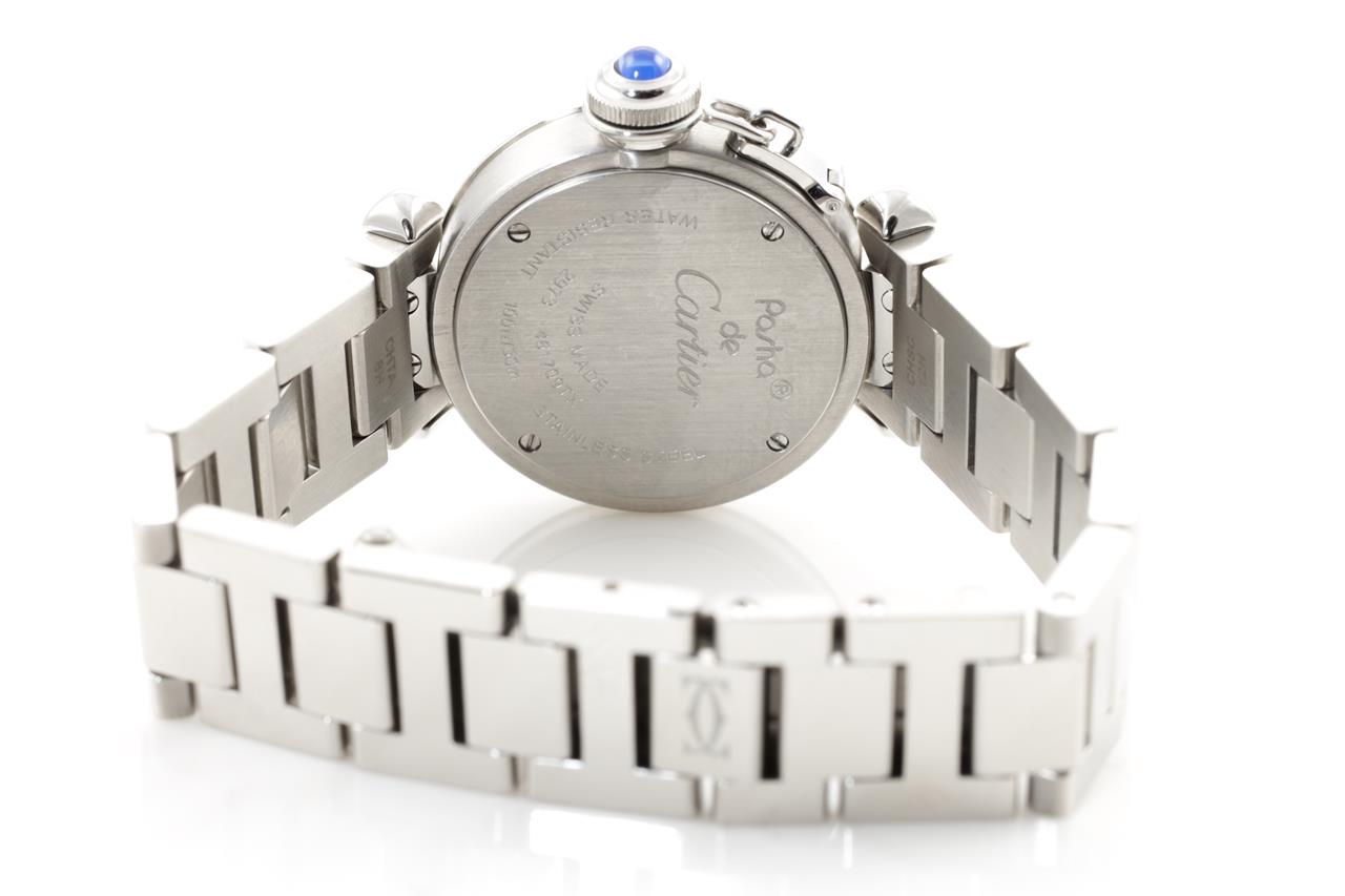 Cartier Pasha stainless steel quartz ladies watch. Silver dial, case diameter: 27mm, wrist size: 14.5cm, Swiss made. Ref# 2973. With Cartier stainless steel bracelet and clasp. With certificate of authenticity, Cartier guarantee booklet and Cartier box. 3 month FSA warranty. (Pre-owned)