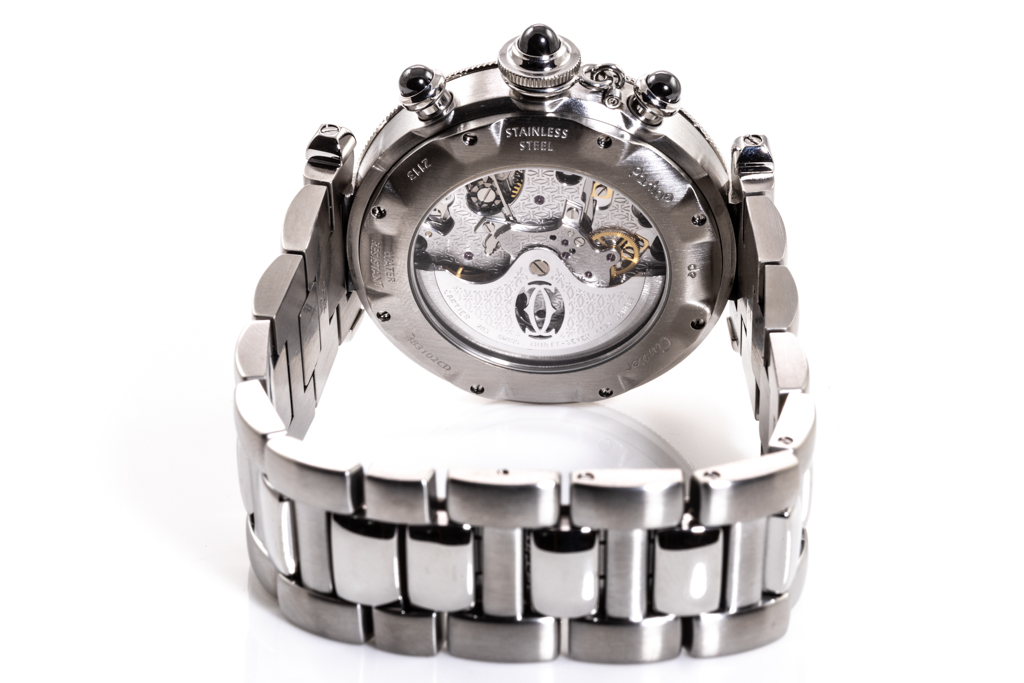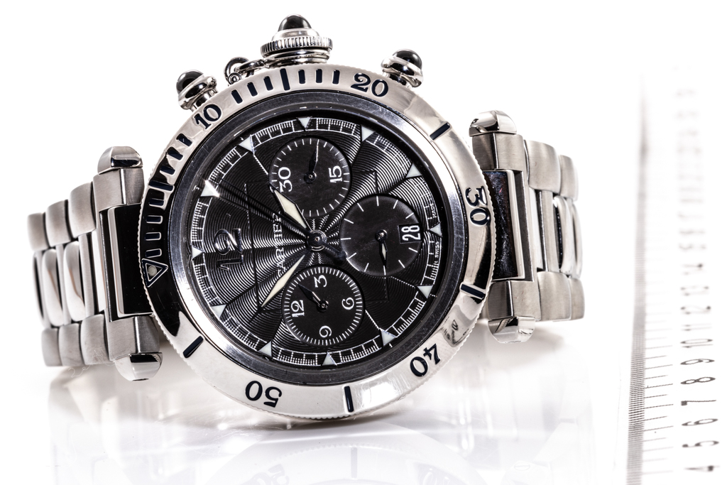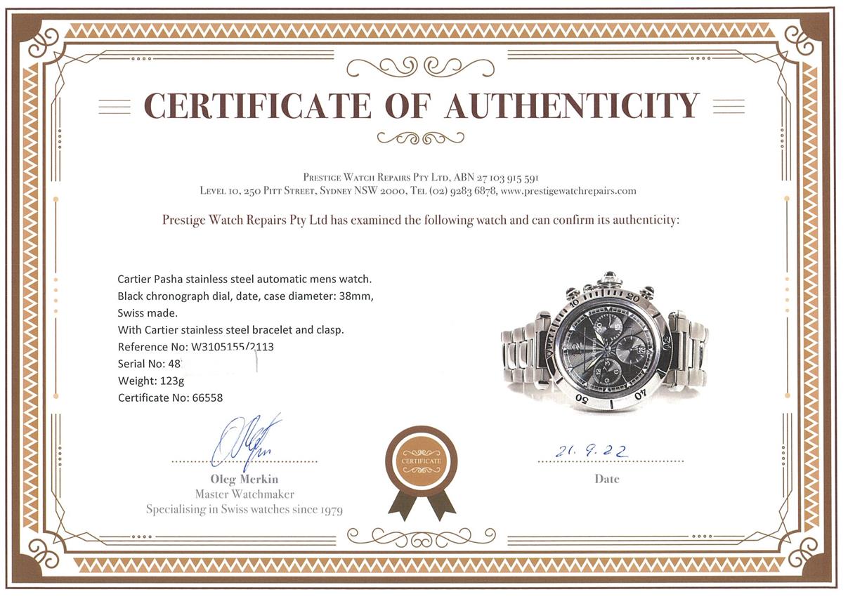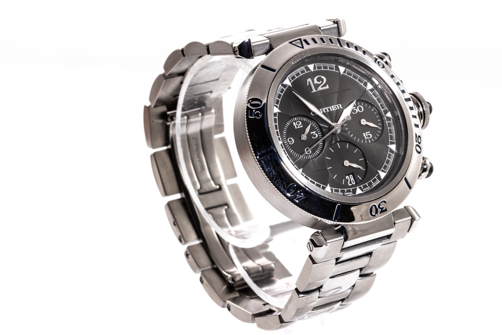 Cartier Pasha stainless steel automatic mens watch. Black chronograph dial, date, case diameter: 38mm, wrist size: 17cm, Swiss made. Ref# W3105155. With Cartier stainless steel bracelet and clasp. With Certificate of Authenticity and Cartier case. 3 month FSA warranty. (Pre-owned)