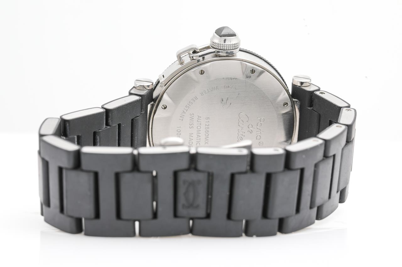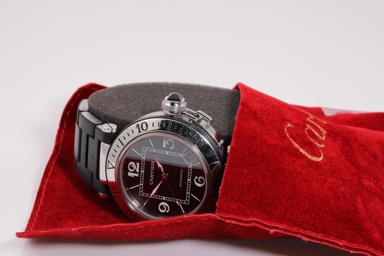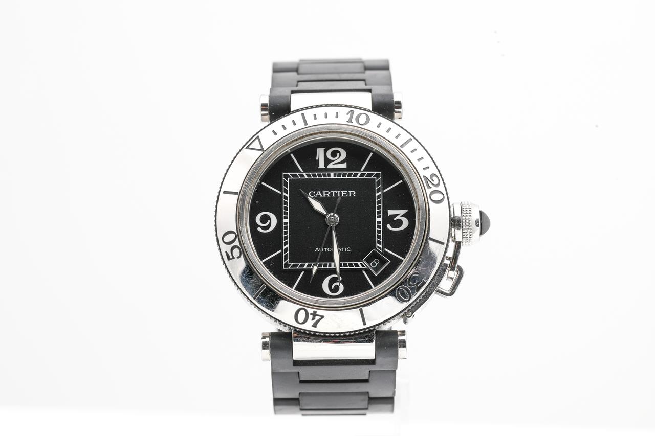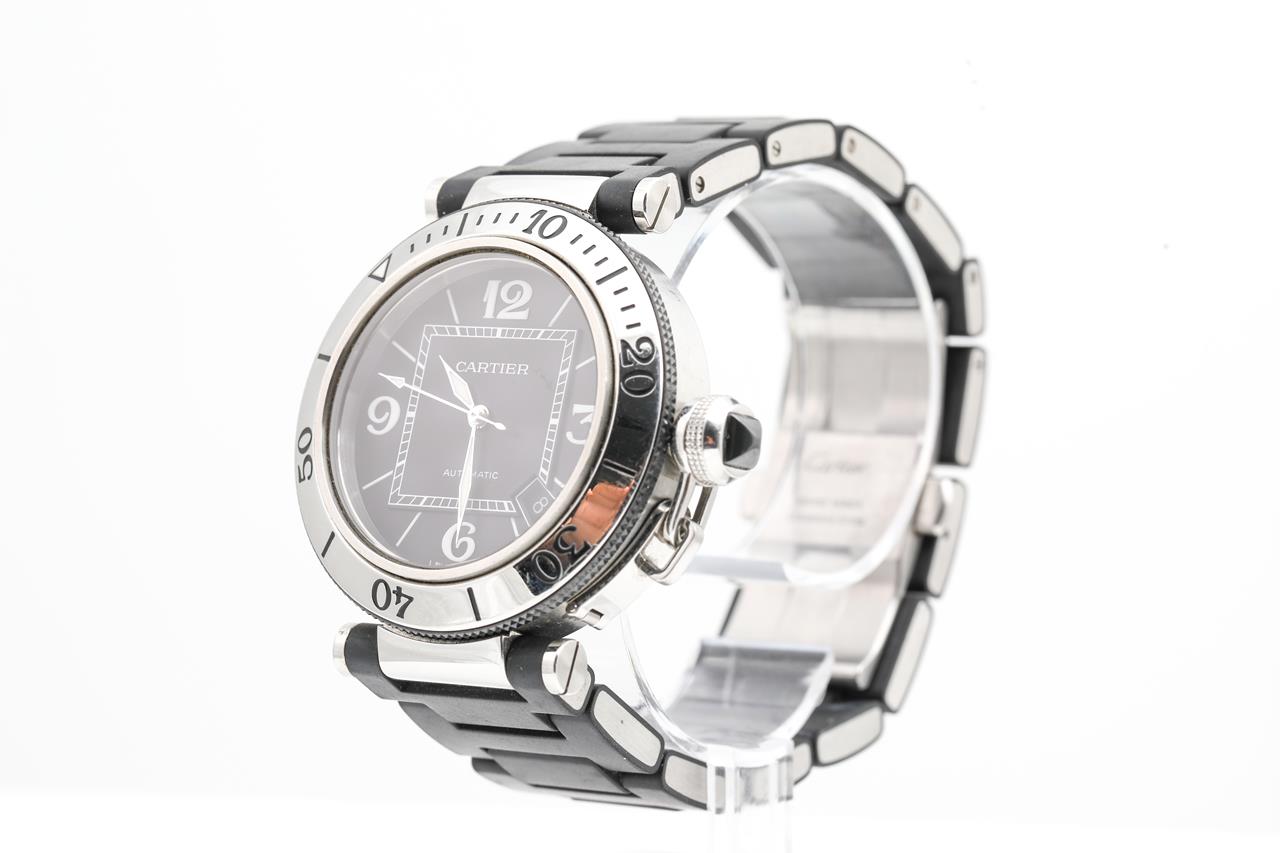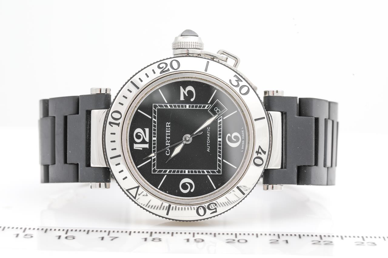 Cartier Pasha Seatimer stainless steel automatic mens watch. Black dial, date, case diameter: 40mm, wrist size: 18cm, Swiss made. Ref# W31077M7/2790. With Cartier rubber & stainless steel bracelet & clasp. With Certificate of Authenticity and Cartier pouch. 3 month FSA warranty. (Pre-owned)