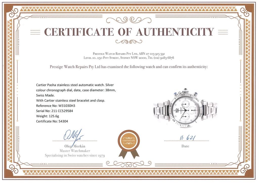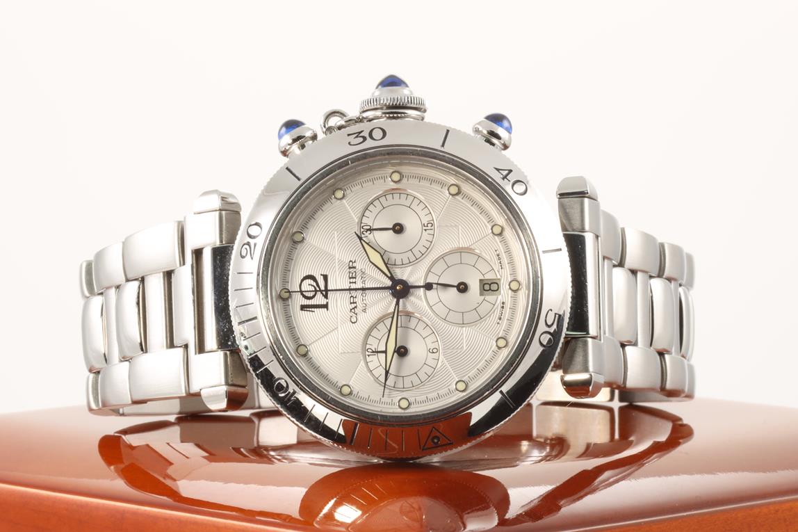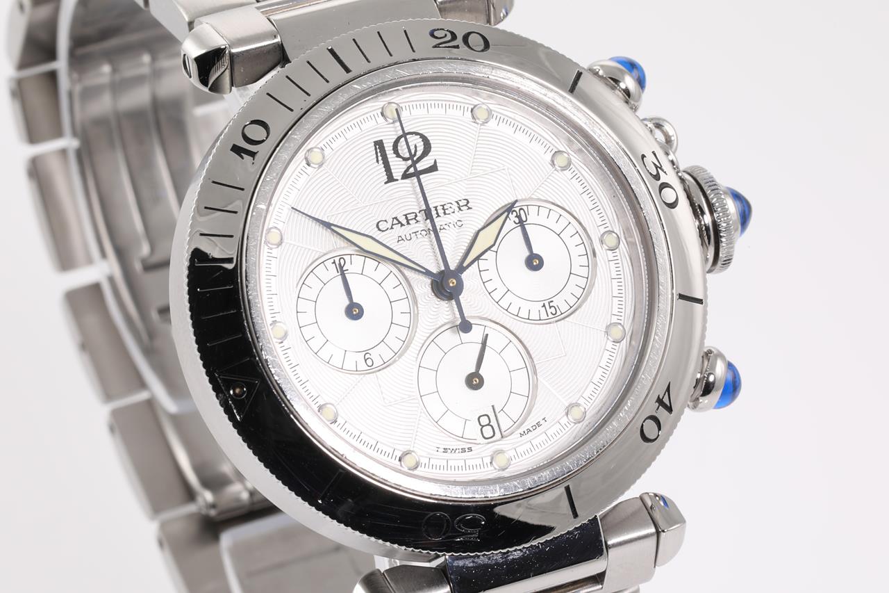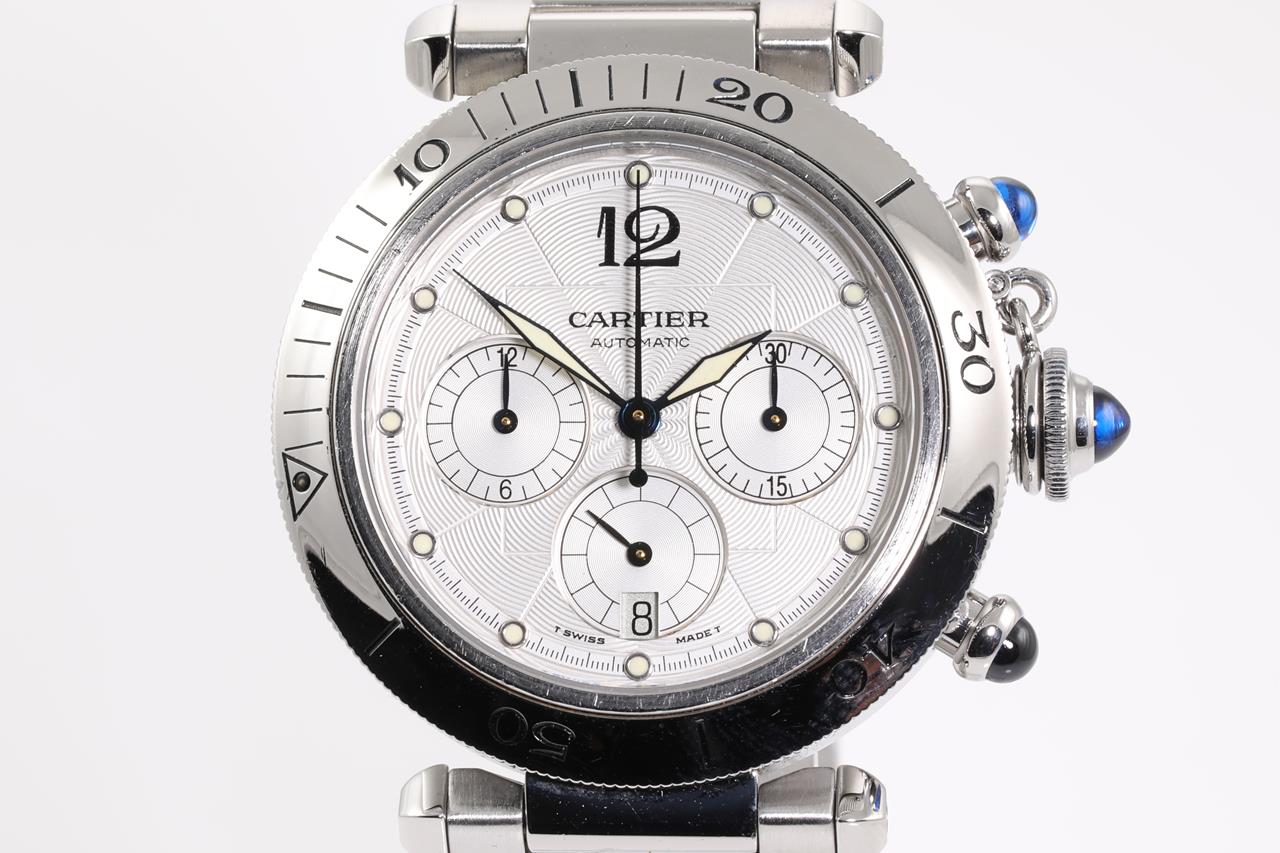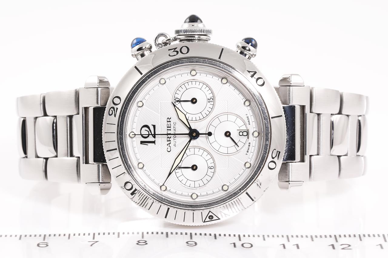 Cartier Pasha stainless steel automatic watch. Silver chronograph dial, date, case diameter: 38mm, wrist size: 19cm, Swiss made. Ref# W31030H3. With Cartier stainless steel bracelet and clasp. With certificate of authenticity, Cartier international guarantee certificated dated 3/5/1998 and Cartier booklet. 3 month FSA warranty. (Pre-owned)