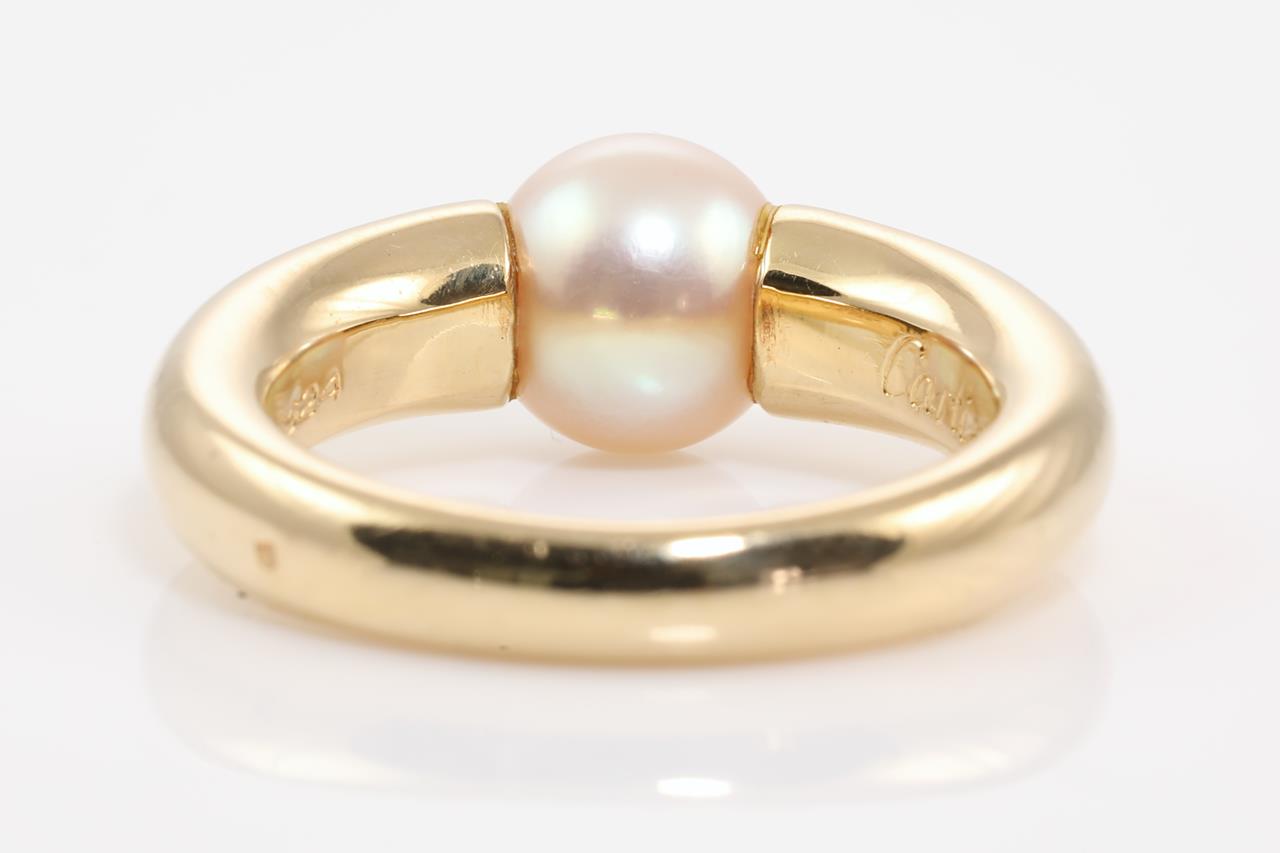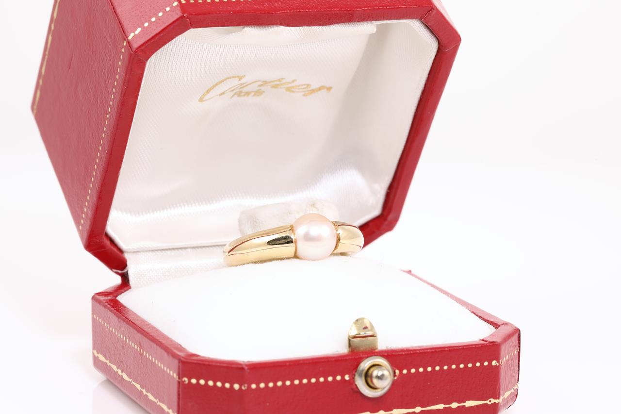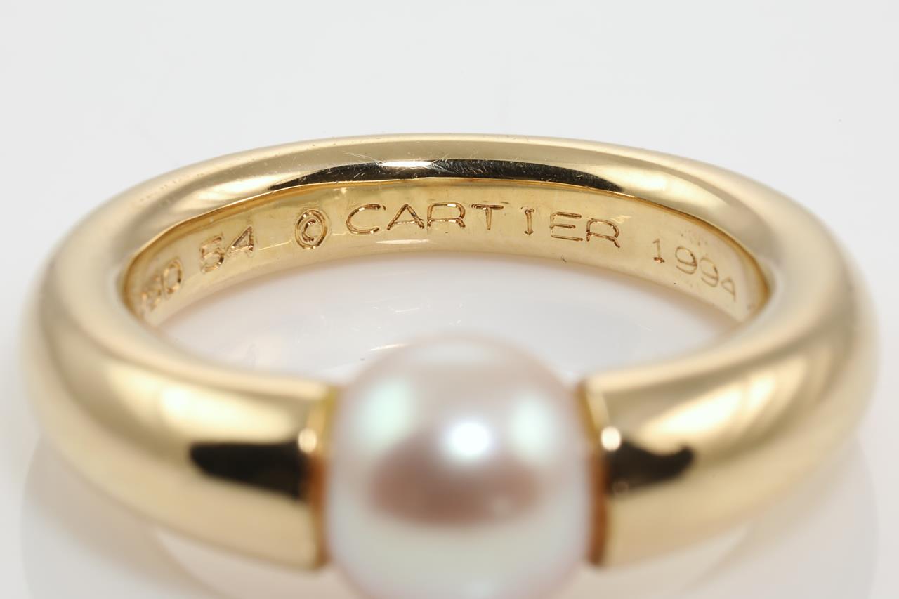 Cartier ring with a cultured Pearl of 8.2mm. 18ct yellow gold. Cartier stamped size 54, M - ring resizing is not recommended. Circa 1994. With Cartier box. Weight: 11.7g. (Pre-owned)