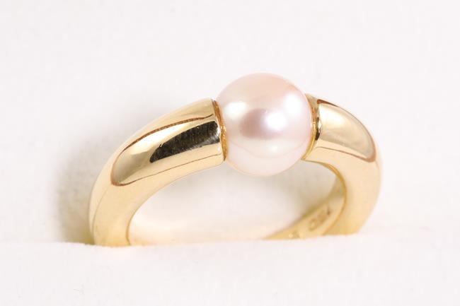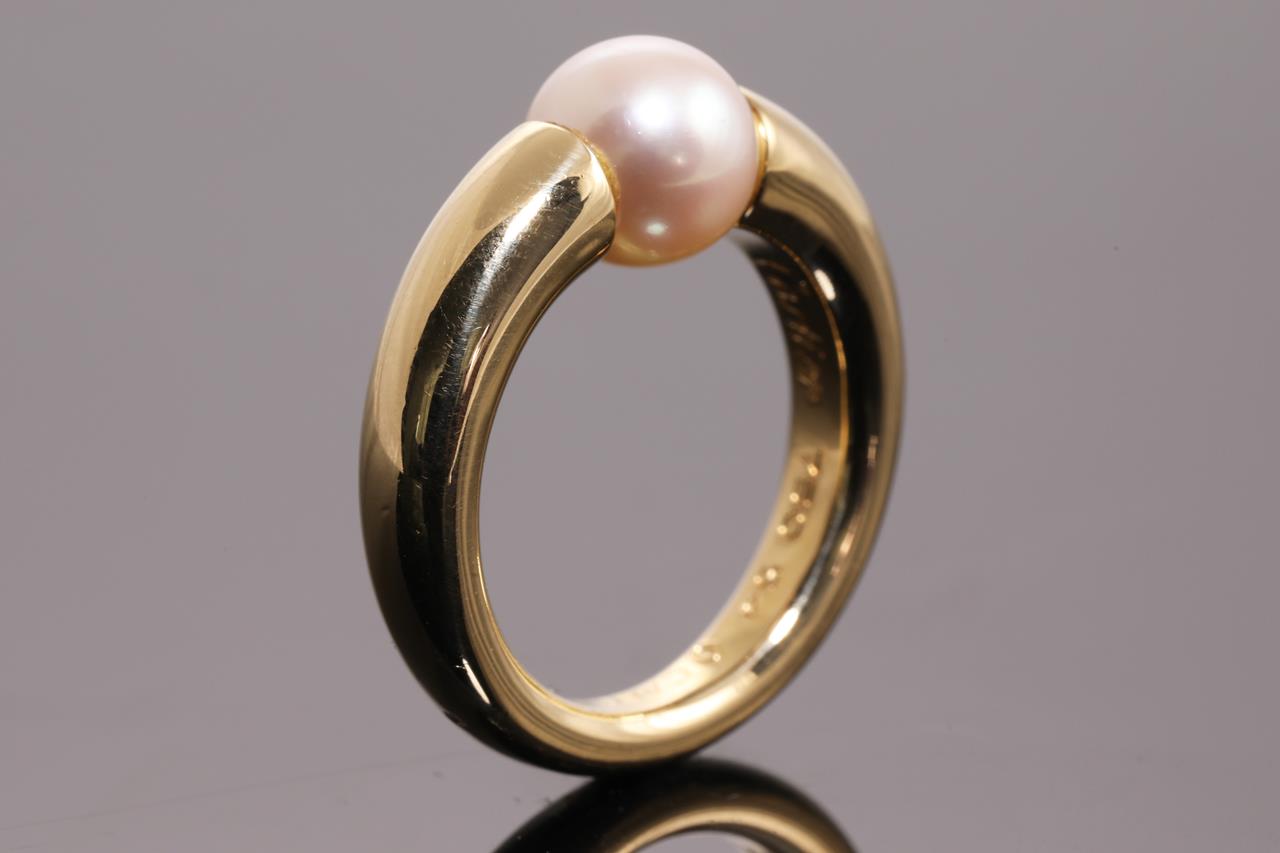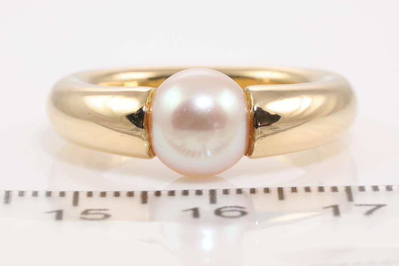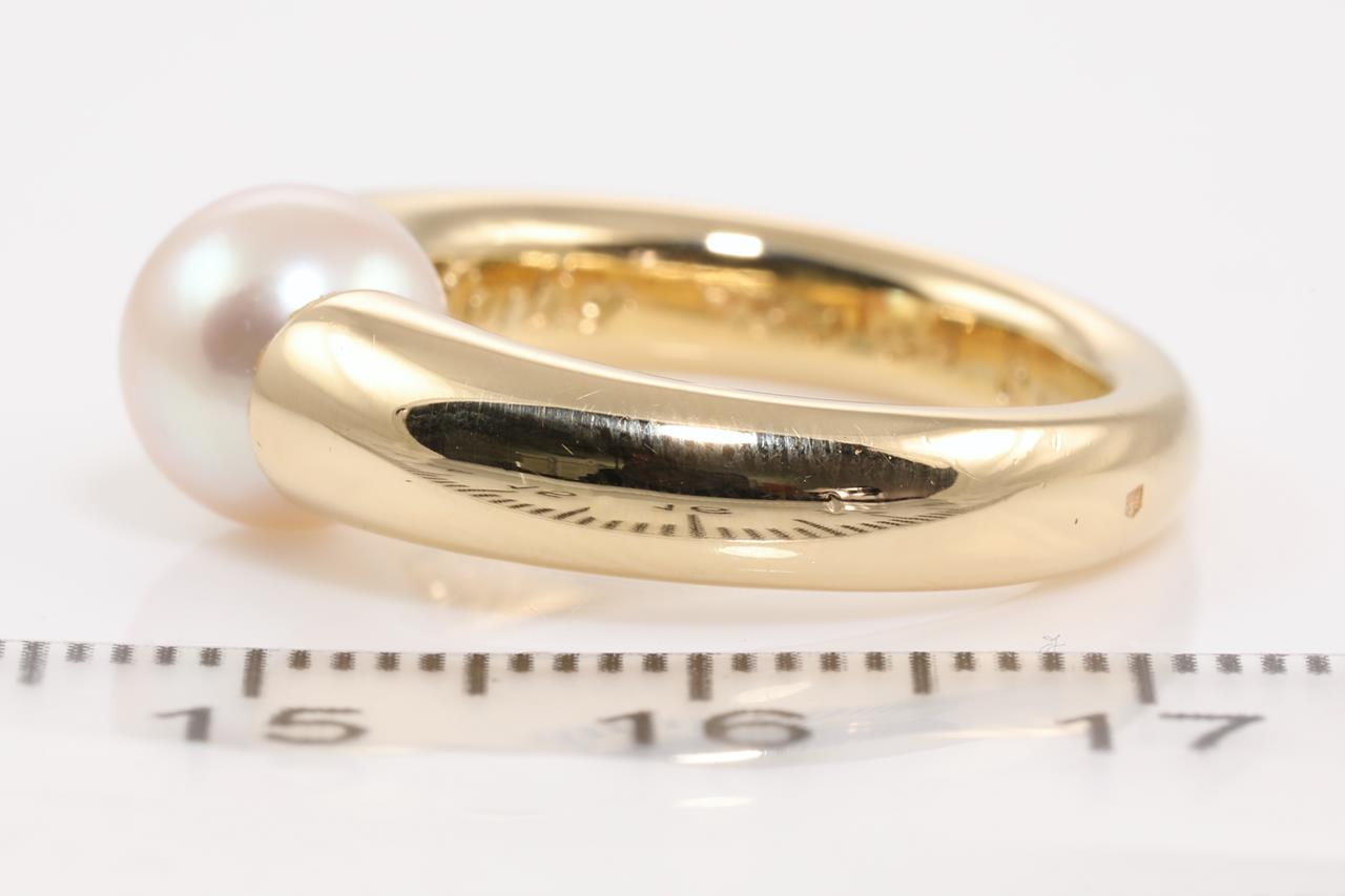 Cartier ring with a cultured Pearl of 8.2mm. 18ct yellow gold. Cartier stamped size 54, M - ring resizing is not recommended. Circa 1994. With Cartier box. Weight: 11.7g. (Pre-owned)
