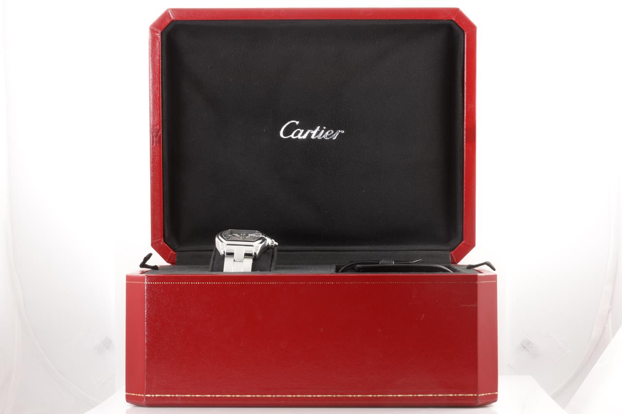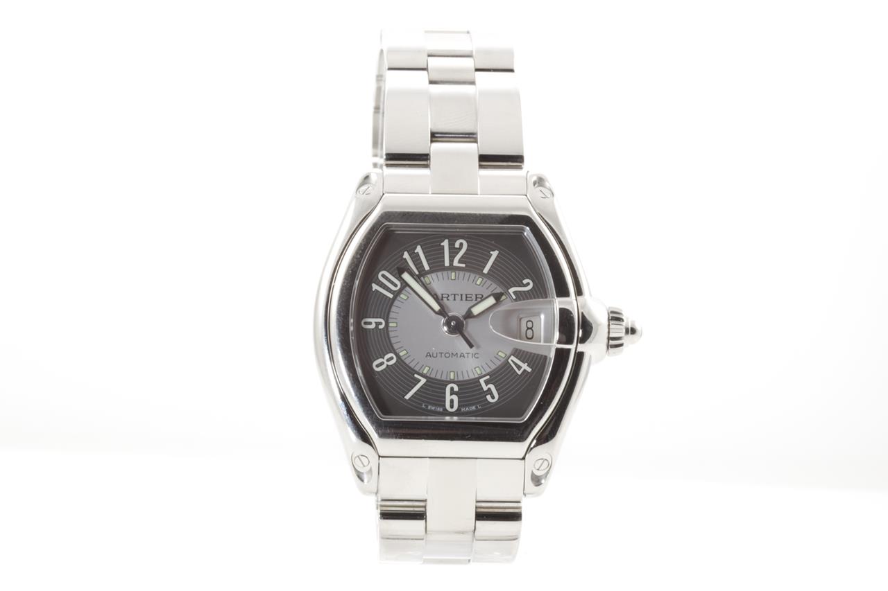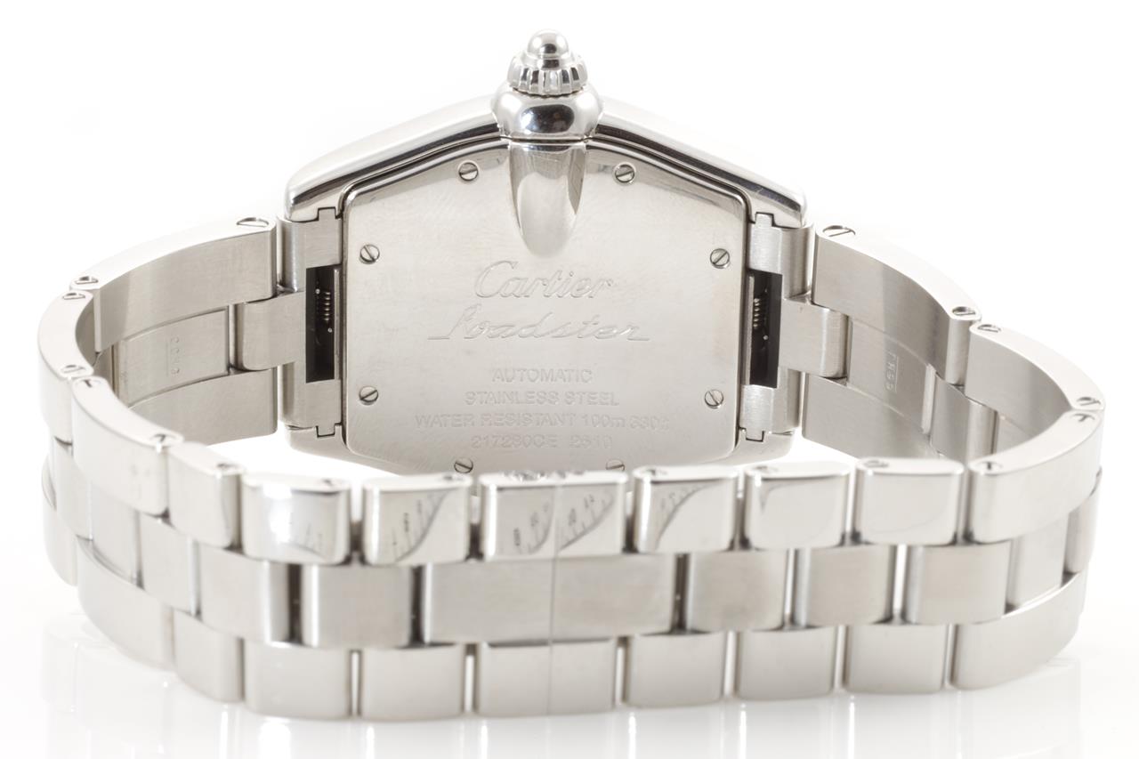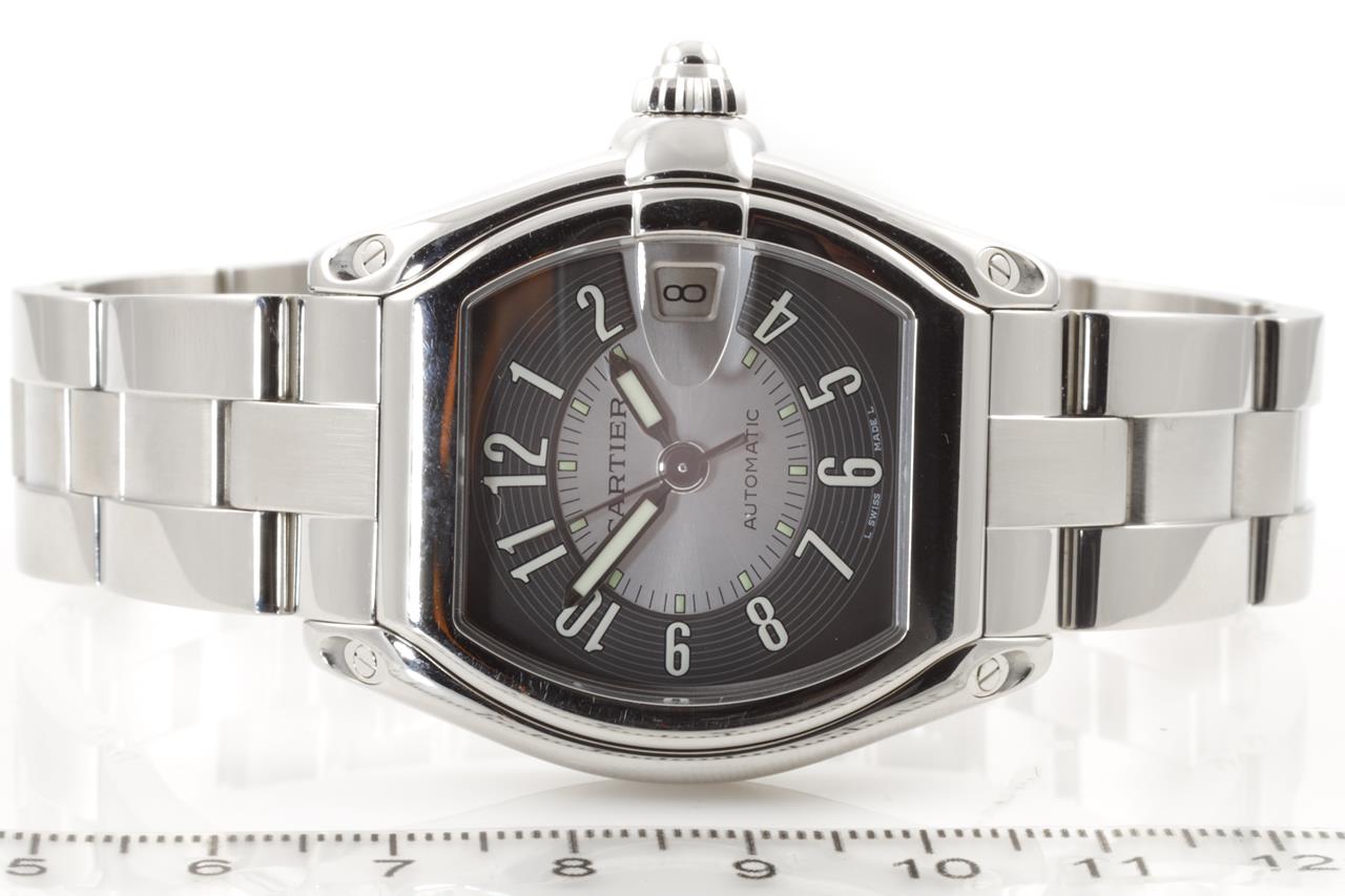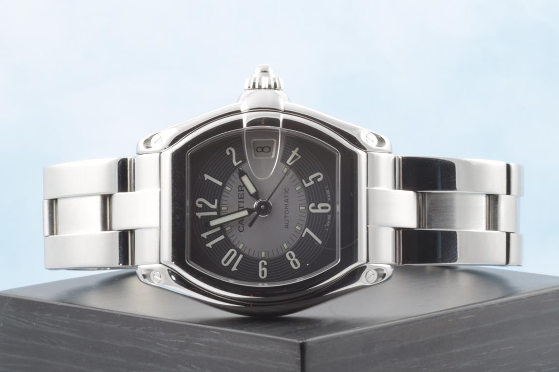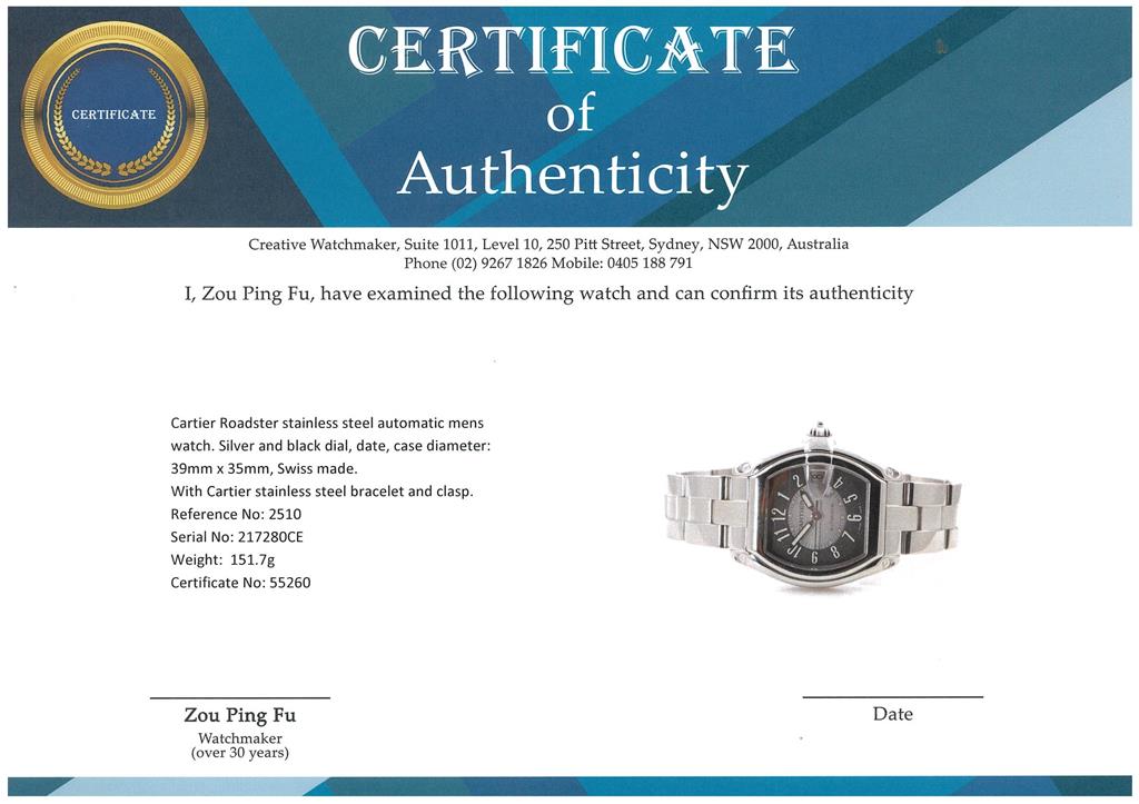 Cartier Roadster stainless steel automatic mens watch. Silver and black dial, date, case diameter: 39mm x 35mm, wrist size: 20.5cm, Swiss made. Ref# 2510. With Cartier stainless steel bracelet and clasp. With certificate of authenticity, Cartier Guarantee certificate booklet dated 02/01/2002 and Cartier box. 3 month FSA warranty. (Pre-owned)