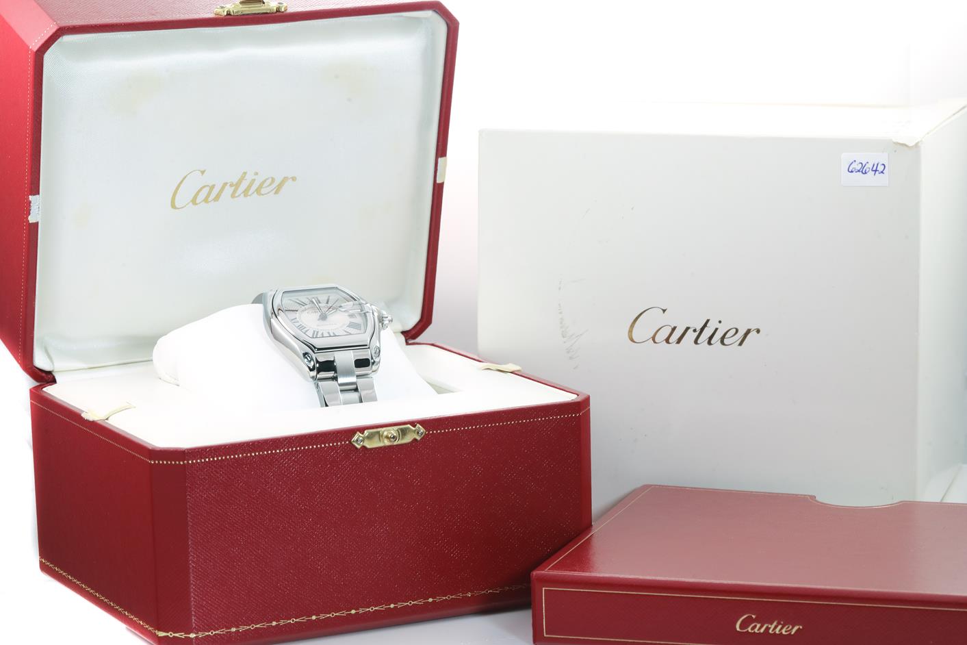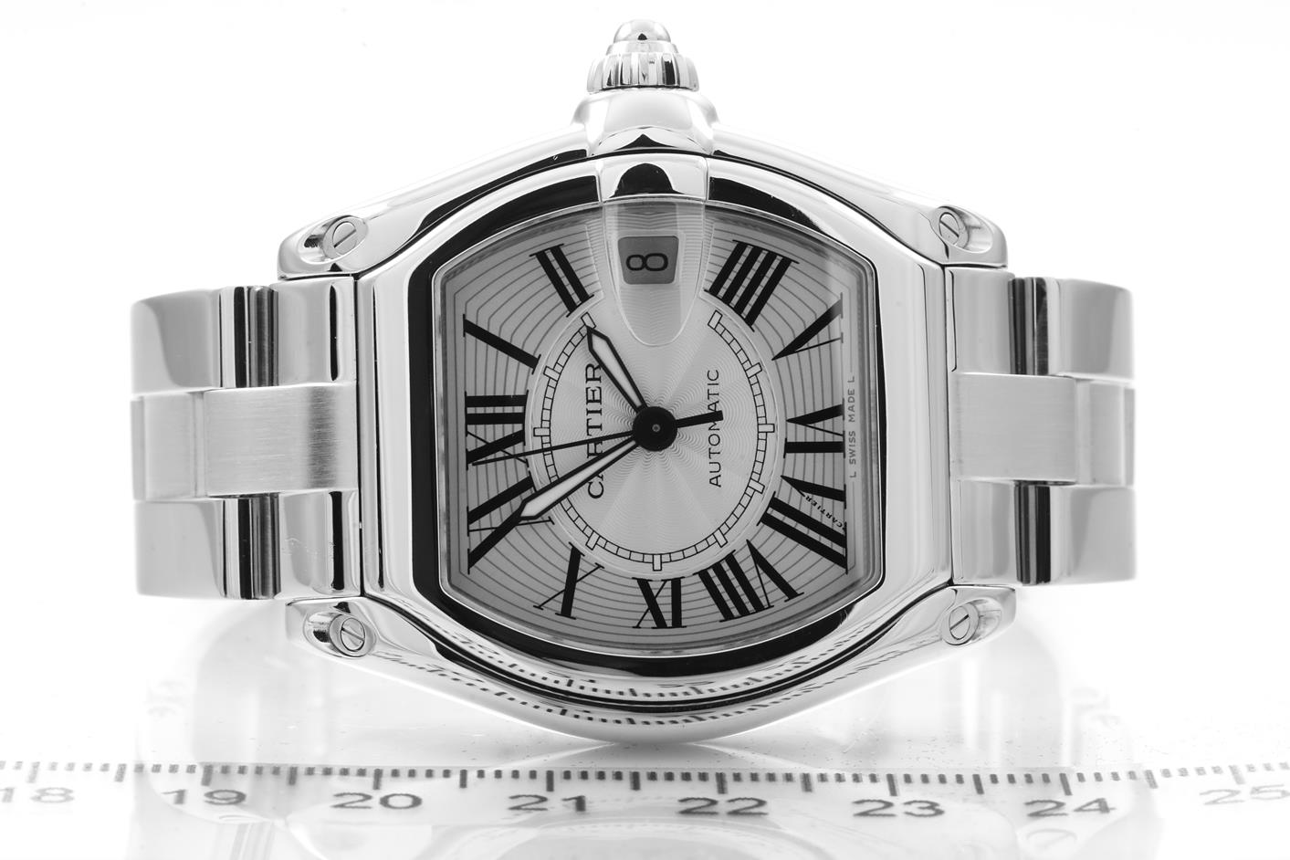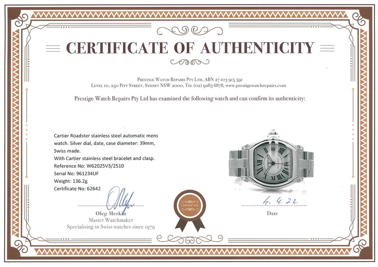 Cartier Roadster stainless steel automatic mens watch. Silver dial, date, case diameter: 39mm, wrist size: 16cm, Swiss made. Ref# W62025V3/2510. With Cartier stainless steel bracelet and clasp. With Certificate of Authenticity, Cartier Certificate Booklet and Cartier box. 3 month FSA warranty. (Pre-owned)
