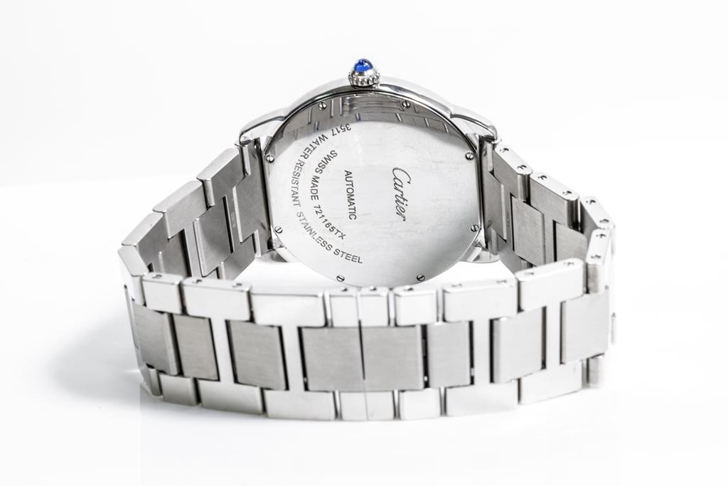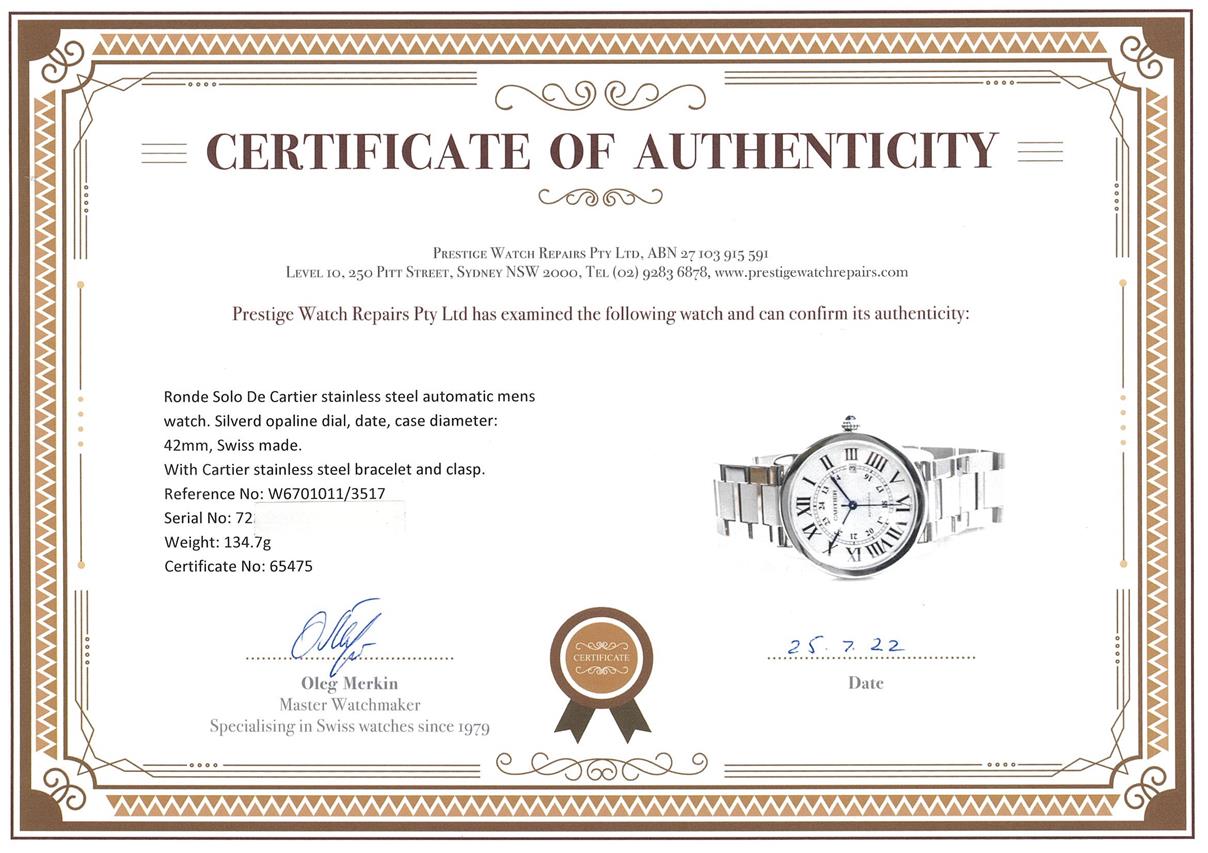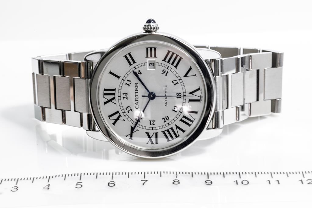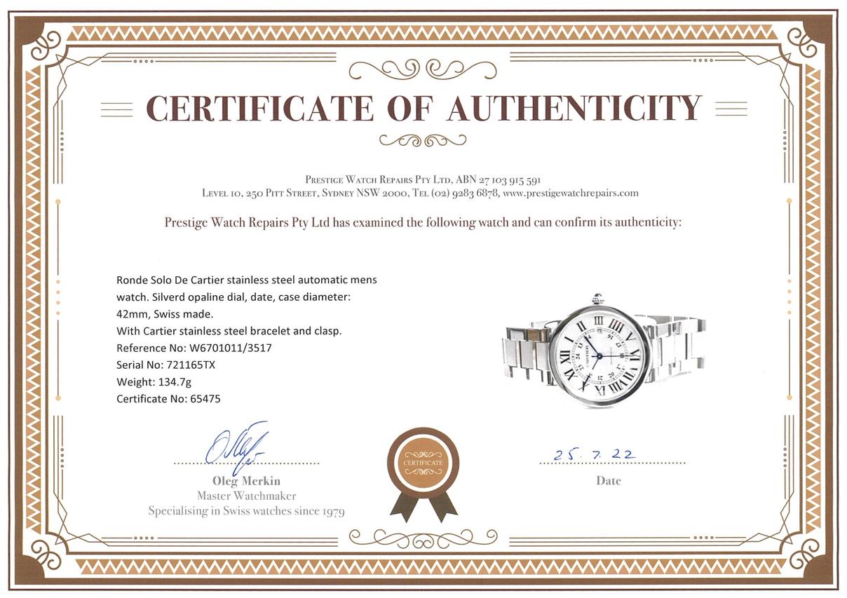 Ronde Solo De Cartier stainless steel automatic mens watch. Silverd opaline dial, date, case diameter: 42mm, wrist size: 20cm, Swiss made. Ref# W6701011/3517. With Cartier stainless steel bracelet and clasp. With Certificate of Authenticity, Cartier Guarantee Certificate booklet dated 04/09/2013, Cartier cleaning kit and Cartier box. 3 month FSA warranty. (Pre-owned)