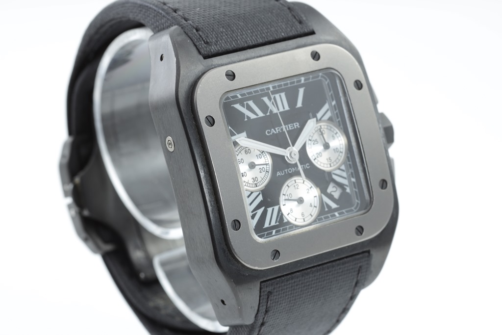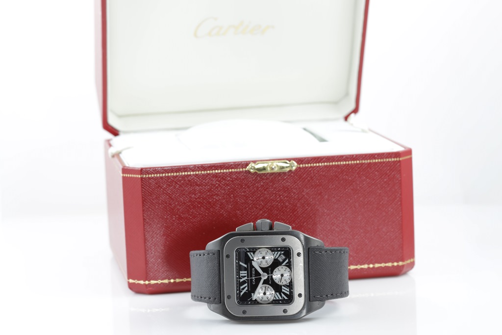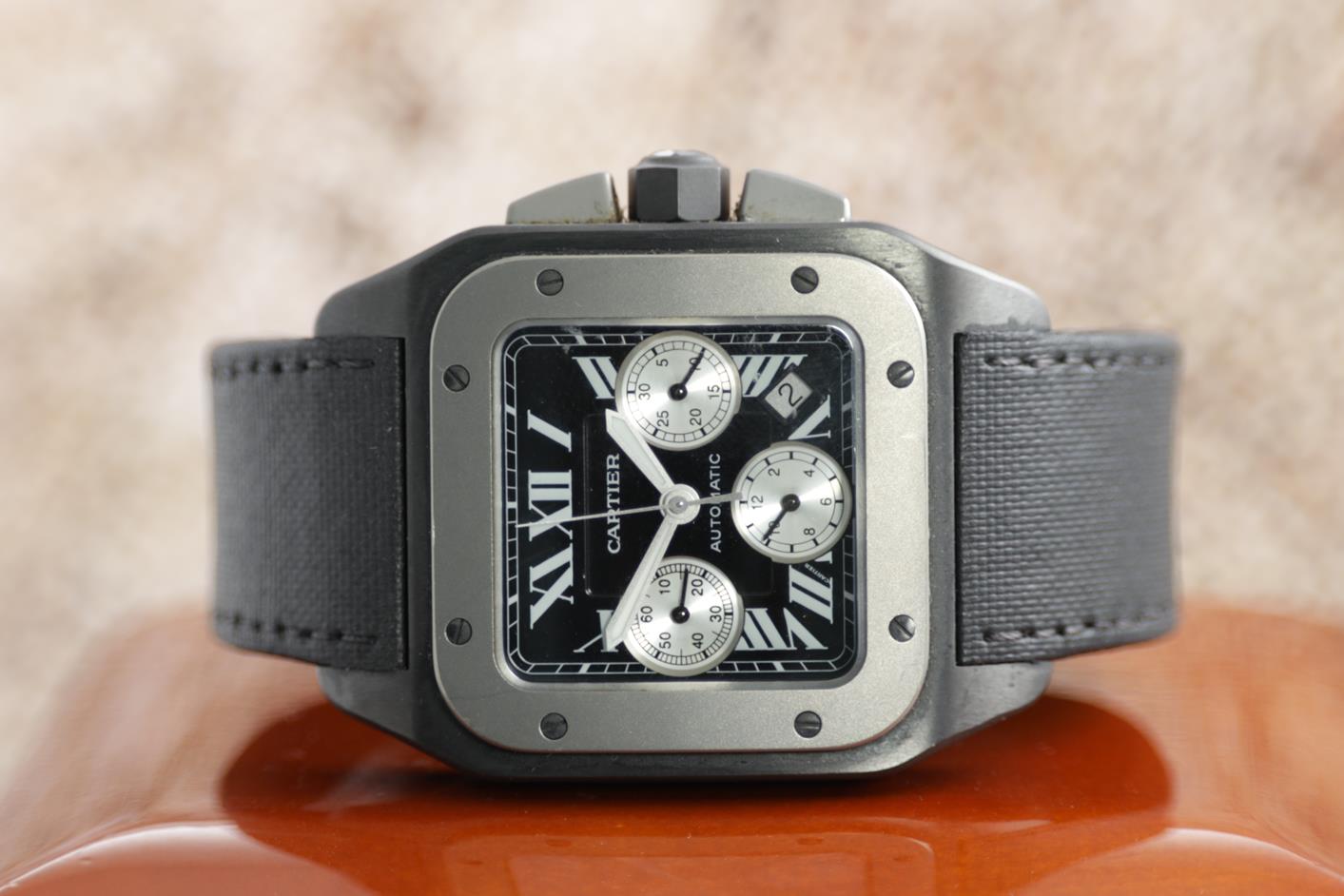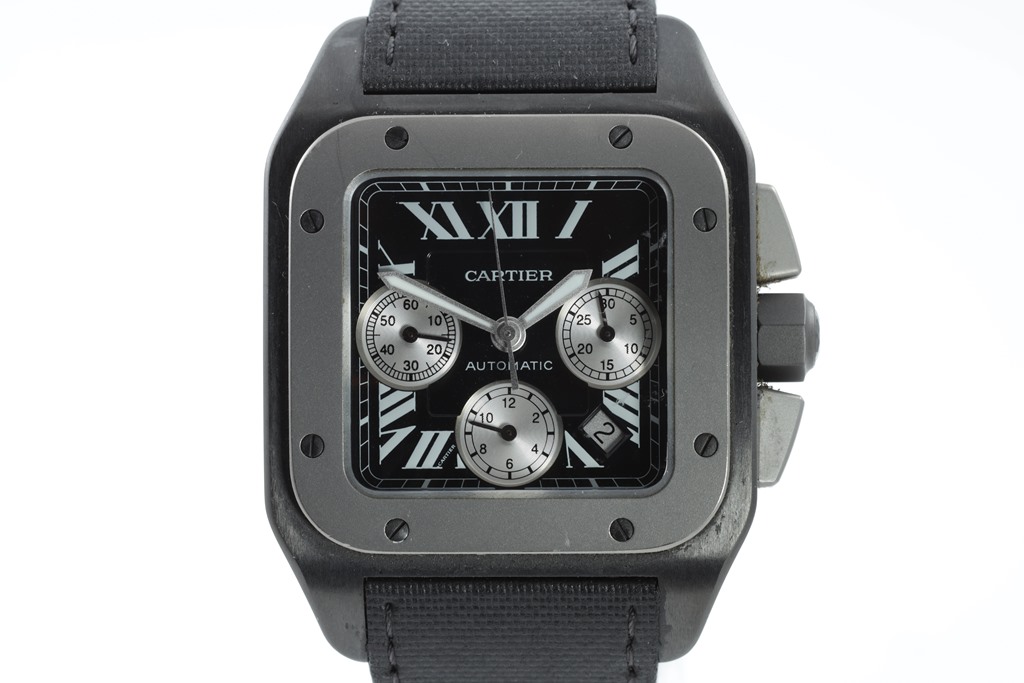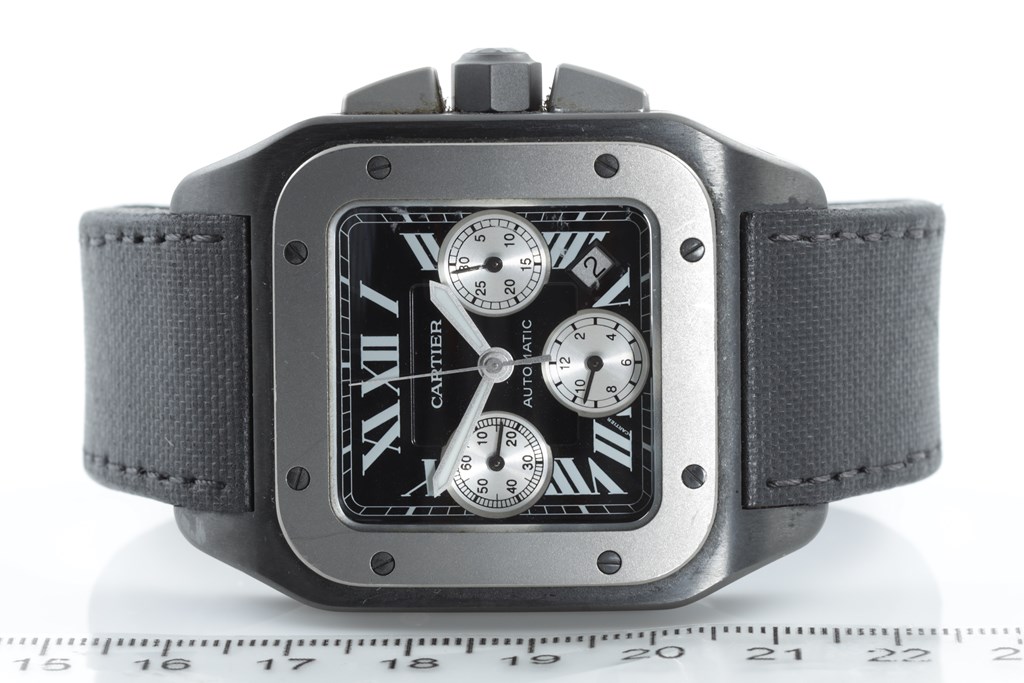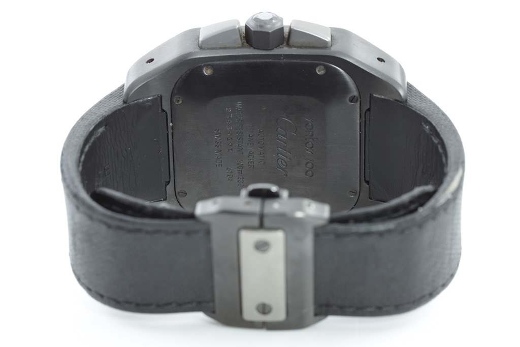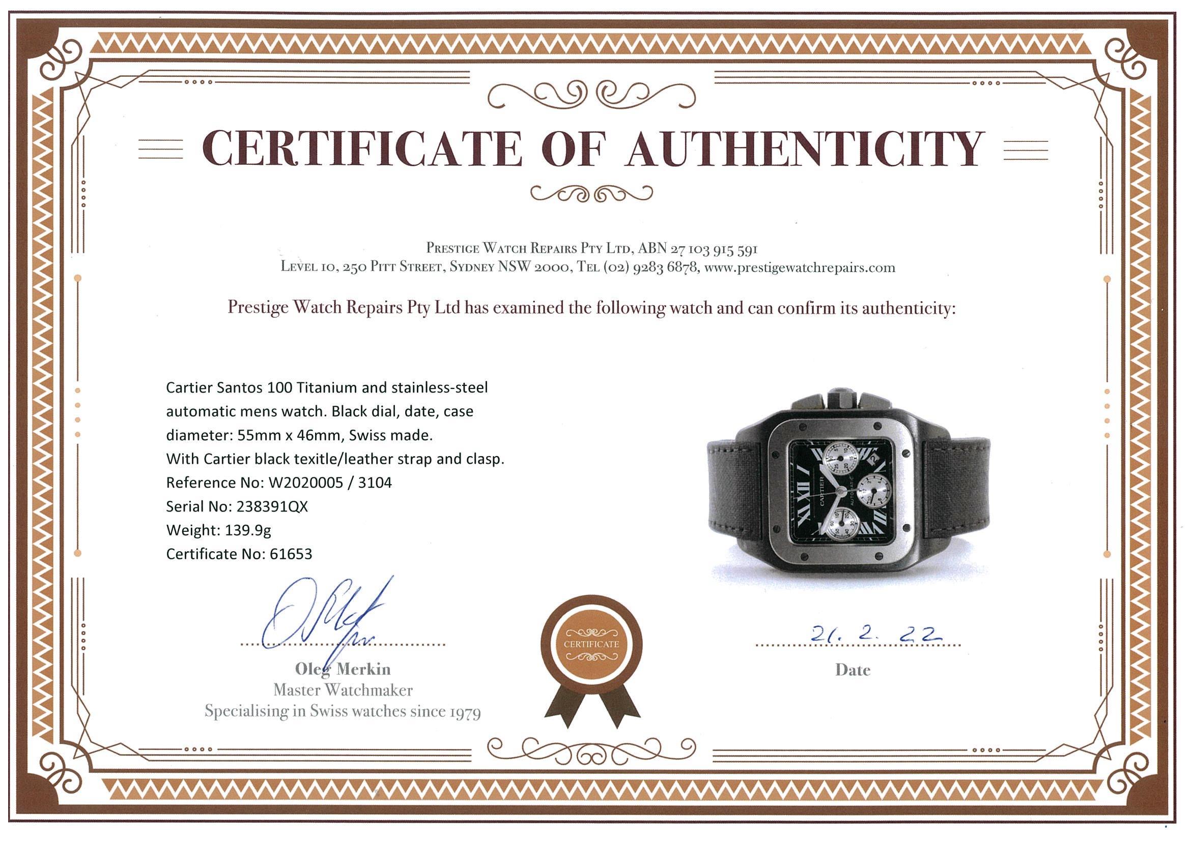 Cartier Santos 100 Titanium and stainless steel automatic mens watch. Black dial, date, case diameter: 55mm x 46mm, wrist size: 17cm, Swiss made. Ref# W2020005 / 3104. With Cartier black texitle/leather strap and clasp. With Certificate of Authenticity, Cartier Guarantee Certificate Booklet dated 19/4/2012 and Cartier box. 3 month FSA warranty. (Pre-owned)