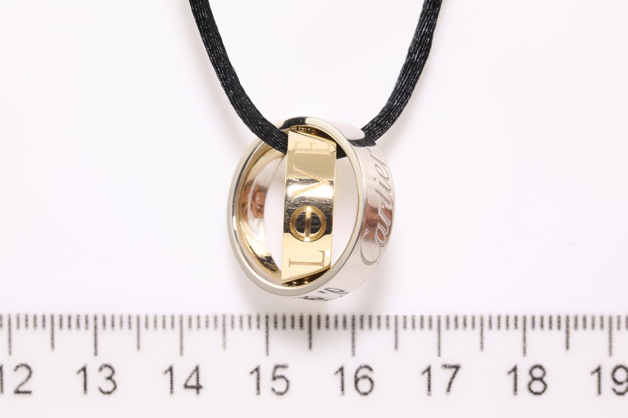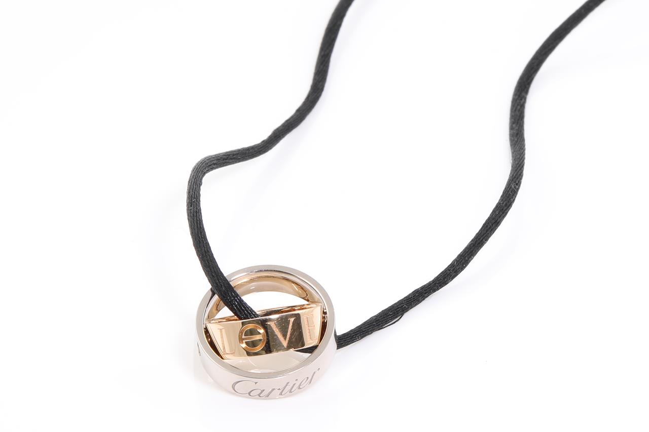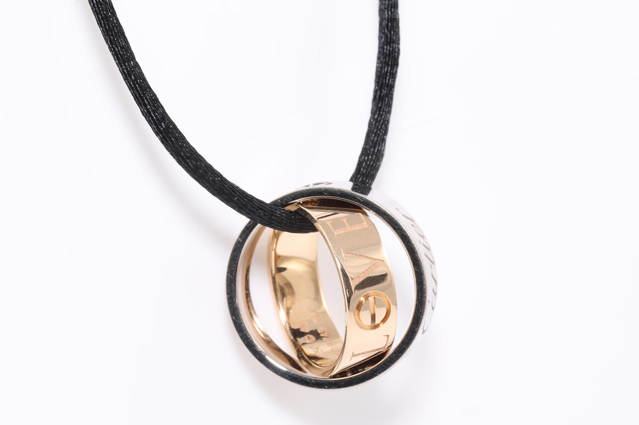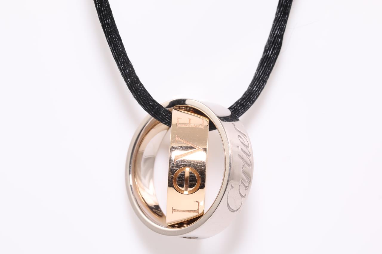 Cartier Secret Love ring/pendant. 18ct rose & white gold. Opens to become pendant. Weight: 10.2g. Cartier stamped size 48, I1/2 - ring resizing is not recommended. With Cartier certificate dated 02/12/2005, black chord & Cartier box. (Pre-owned)