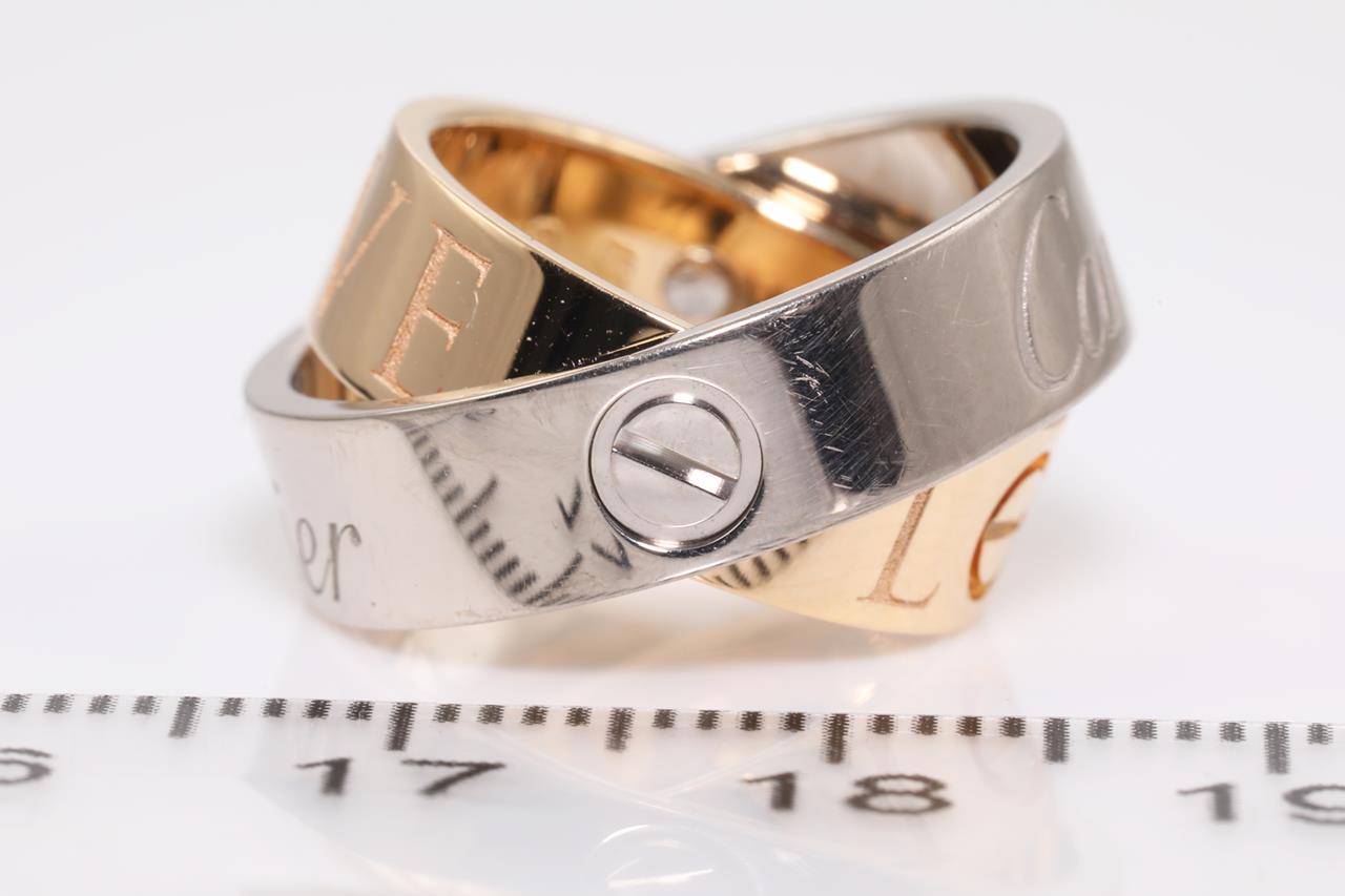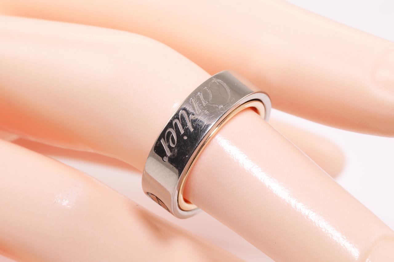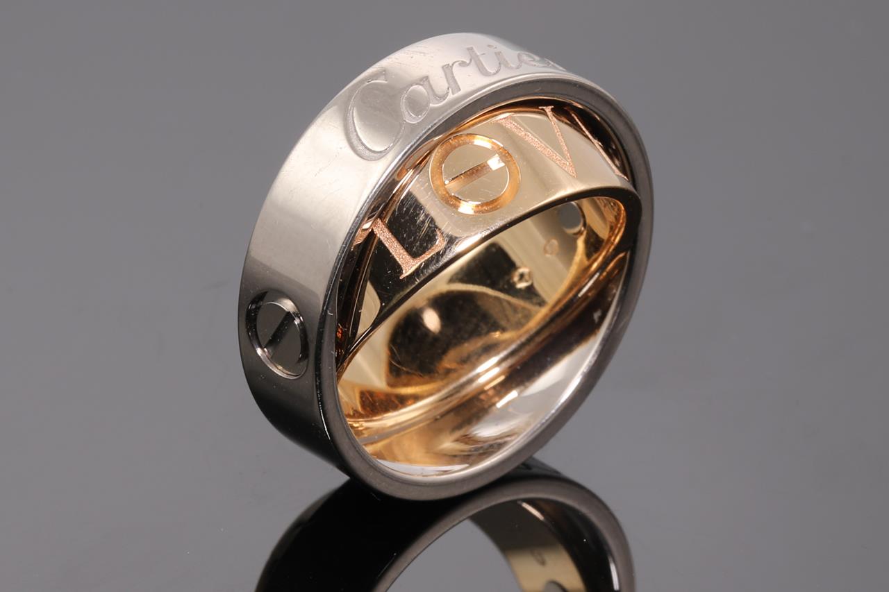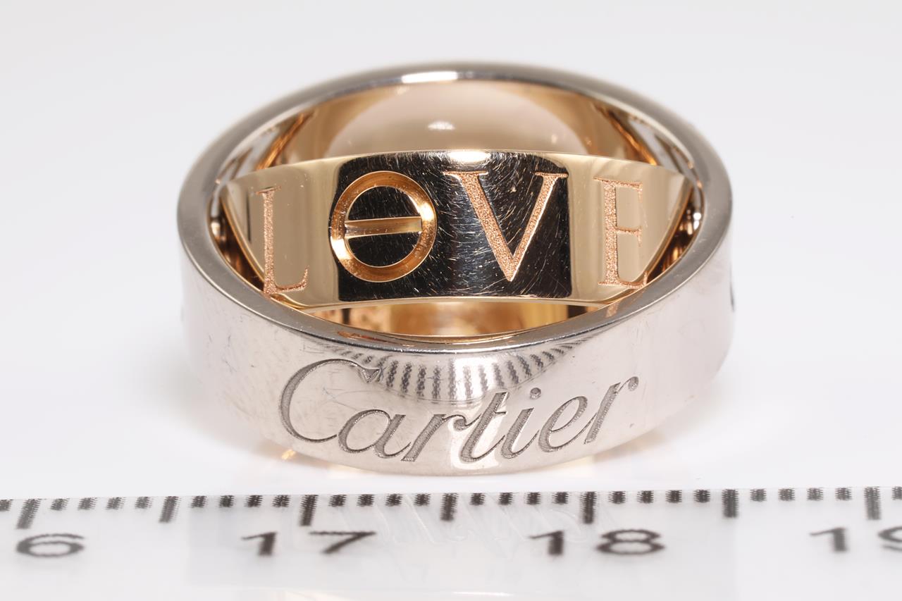 Cartier Secret Love ring/pendant. 18ct rose & white gold. Opens to become pendant. Weight: 10.2g. Cartier stamped size 48, I1/2 - ring resizing is not recommended. With Cartier certificate dated 02/12/2005, black chord & Cartier box. (Pre-owned)