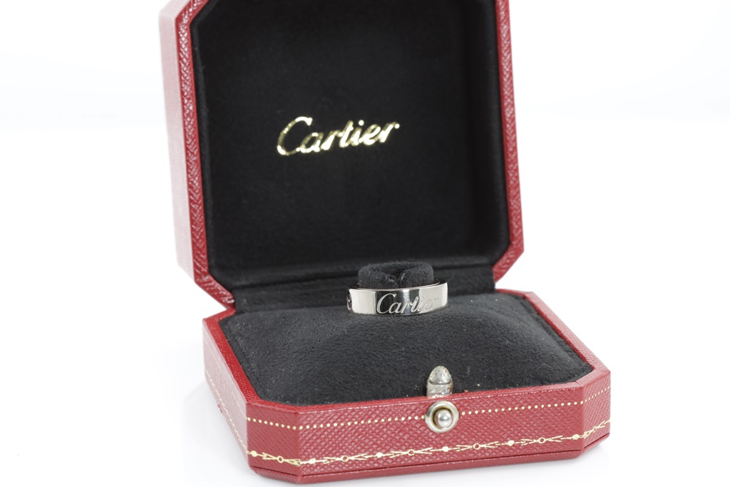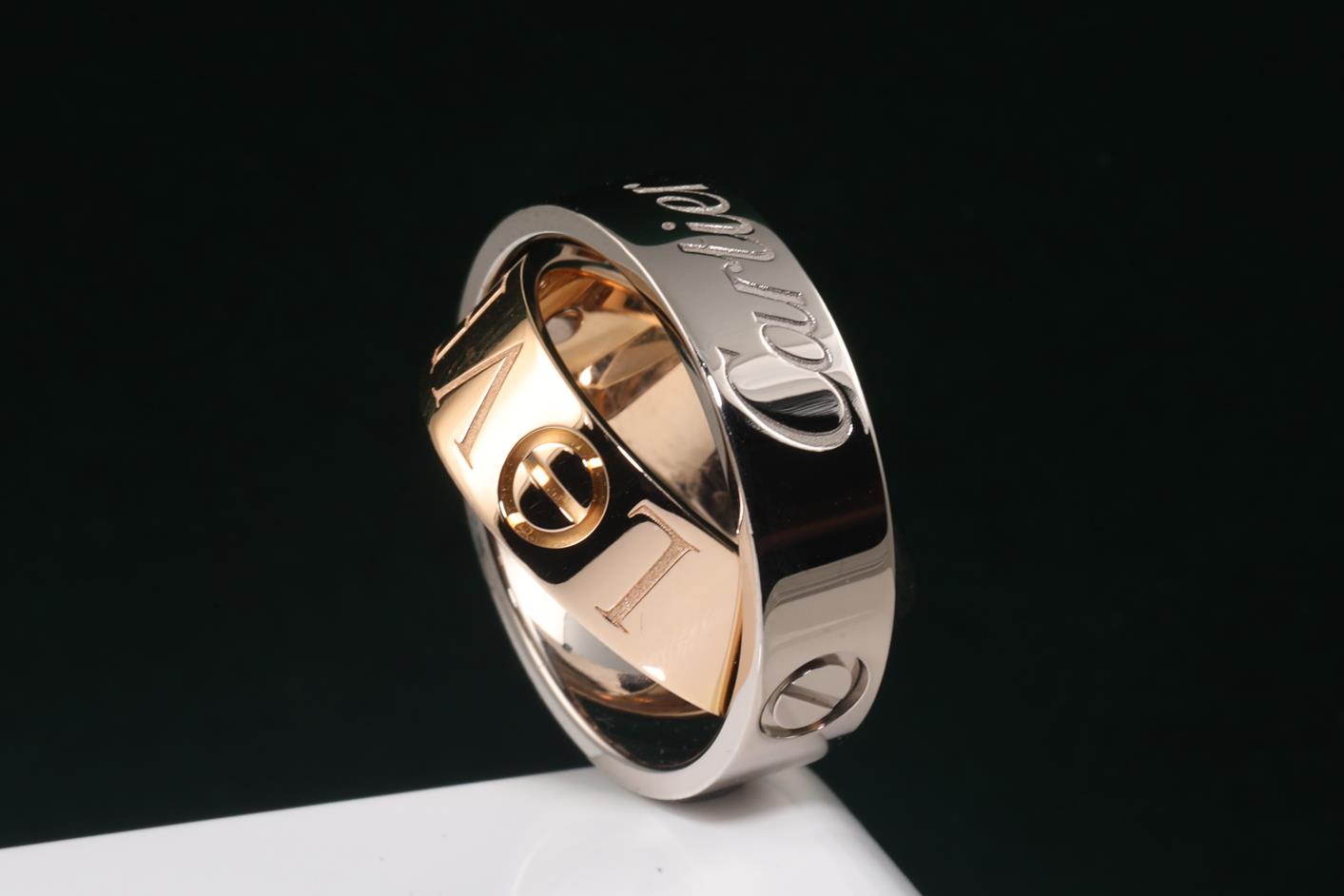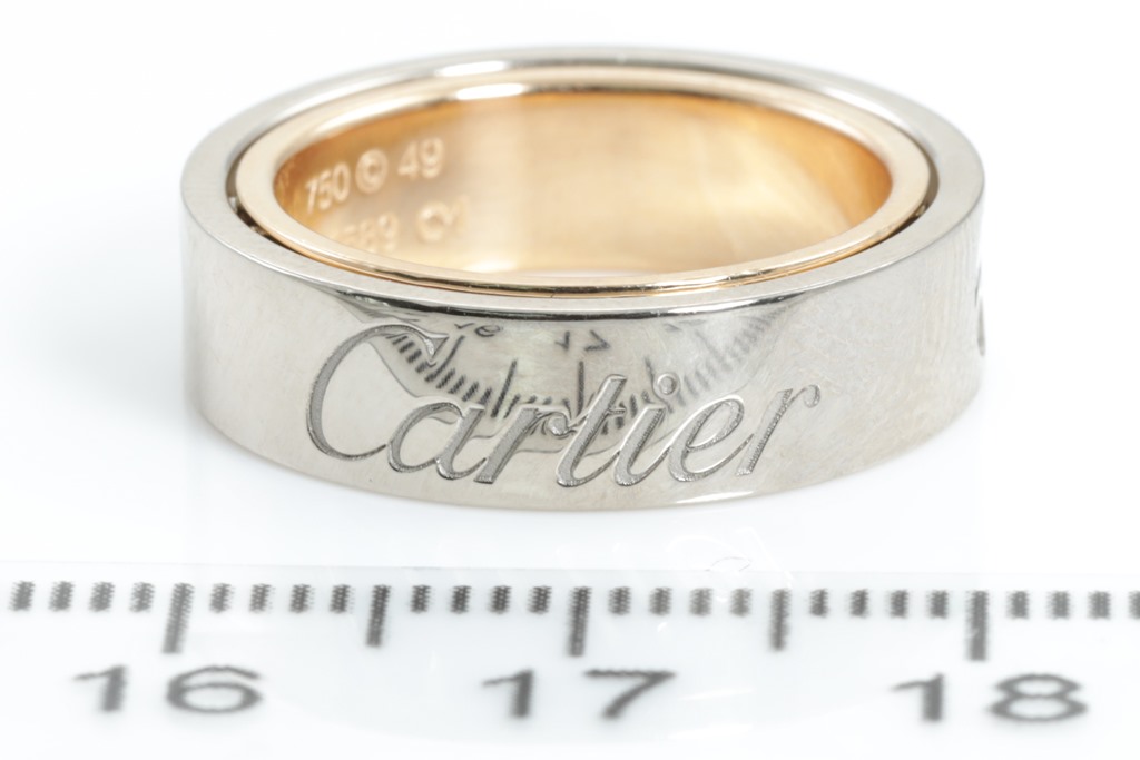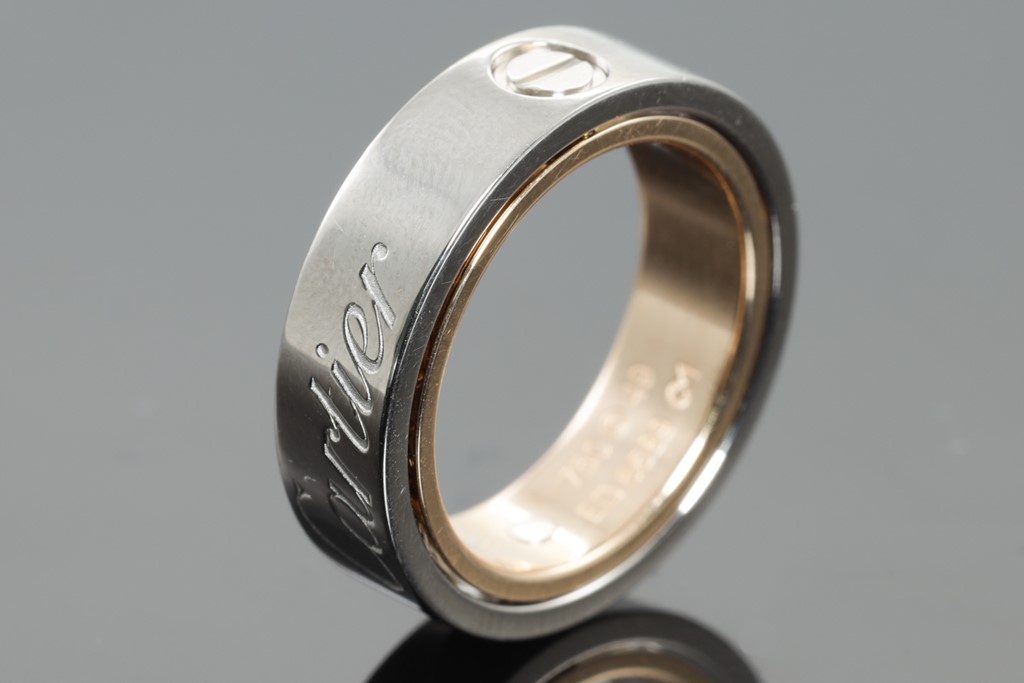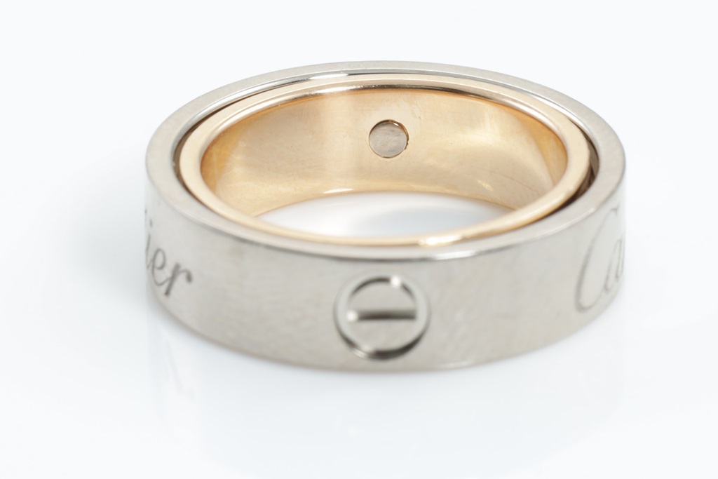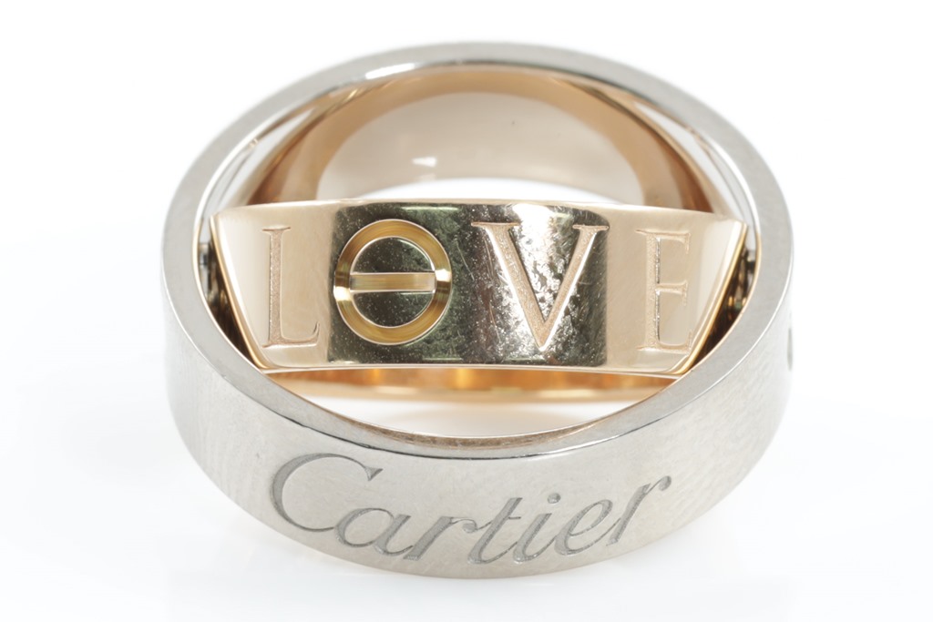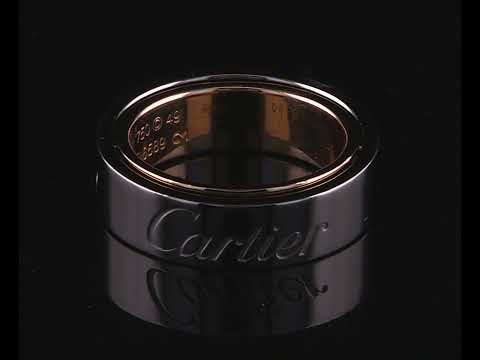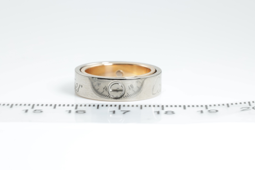 Cartier Secret Love ring. 18ct white & rose gold. Cartier stamped size 49, I1/2 - ring resizing is not recommended. Can be twisted open to form a ball-like pendant. With Cartier box. Weight 10.3g. (Pre-owned)