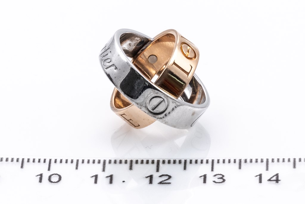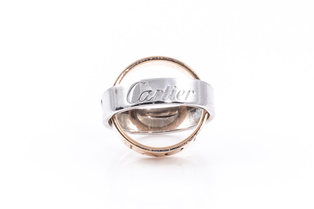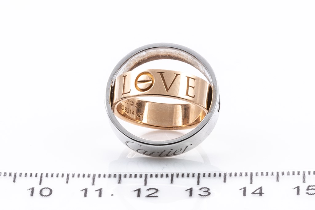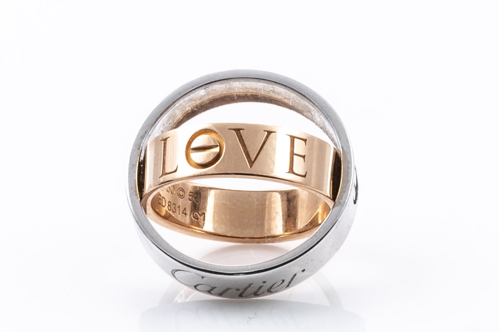 Cartier Secret Love ring. 18ct white & rose gold. Cartier stamped size 53 (actual size M) - ring resizing is not recommended. Can be twisted open to form a ball-like pendant. Weight 10.8g. (Pre-owned)