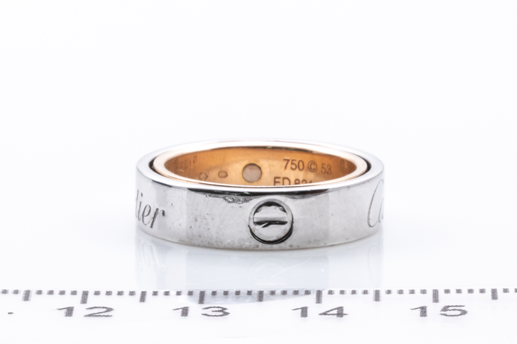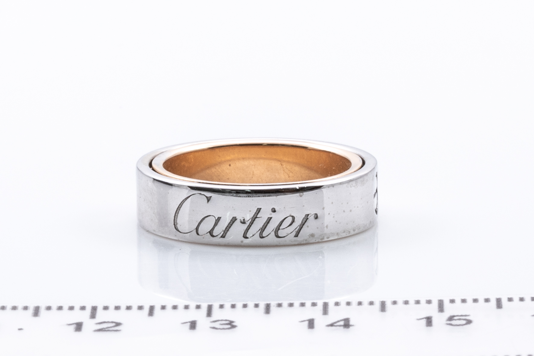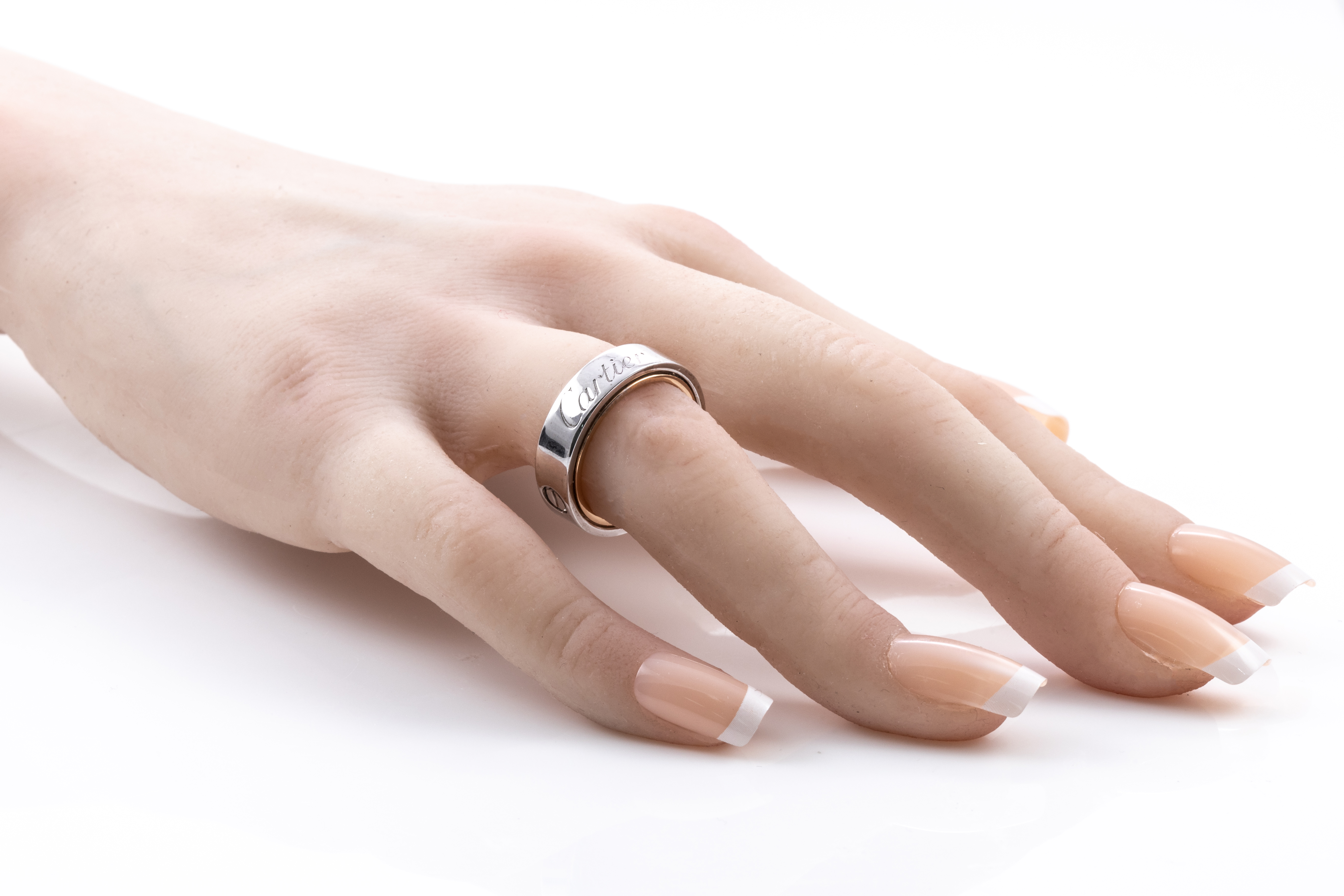 Cartier Secret Love ring. 18ct white & rose gold. Cartier stamped size 53 (actual size M) - ring resizing is not recommended. Can be twisted open to form a ball-like pendant. Weight 10.8g. (Pre-owned)