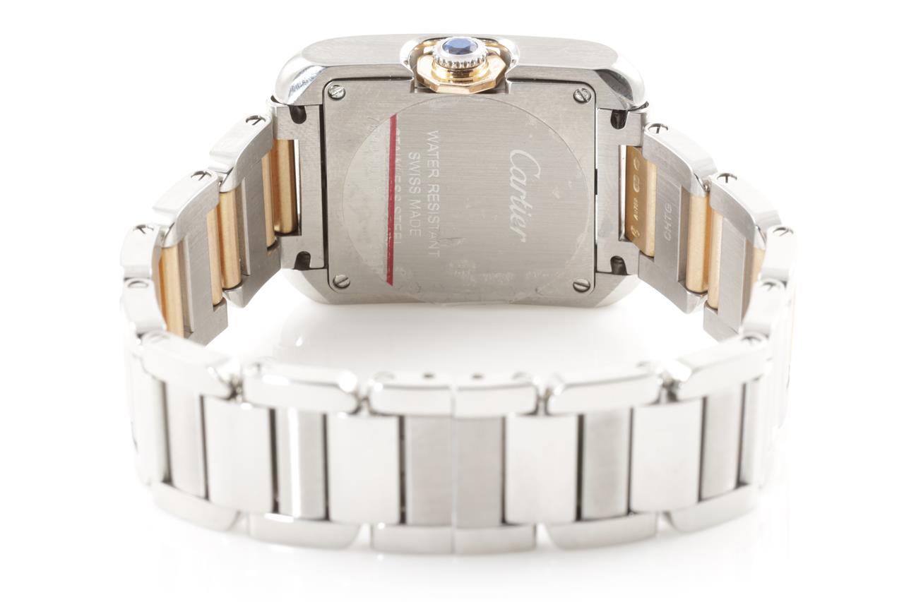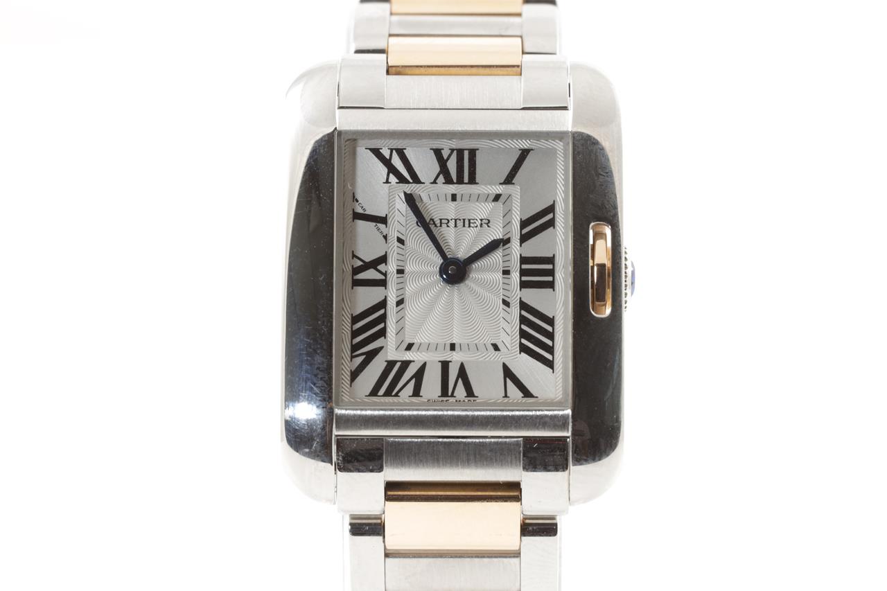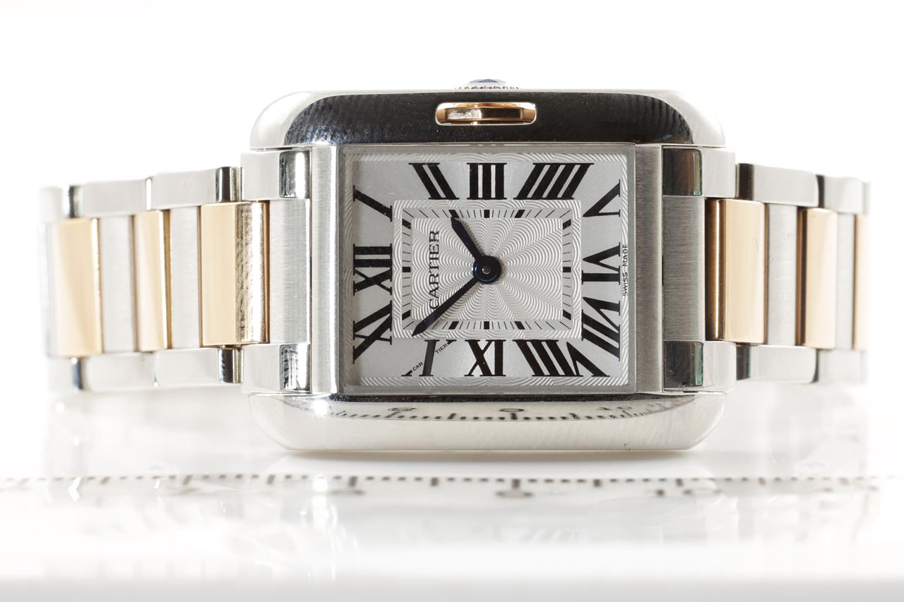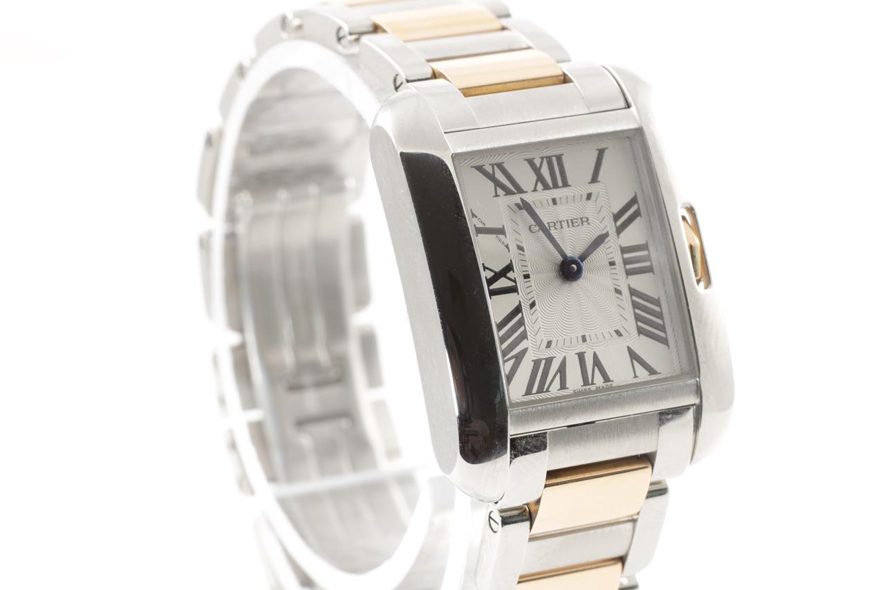 Cartier Tank Anglaise 18ct rose gold and stainless quartz ladies watch. Silver dial, case diameter: 30.2mm x 22.7mm, wrist size: 14.5cm, Swiss made. Ref# W5310036/3485. With Cartier two tone bracelet and clasp. With certificate of authenticity, Cartier guarantee certificate booklet dated 9/4/2014 and Cartier box. 3 month FSA warranty. (Pre0owned)