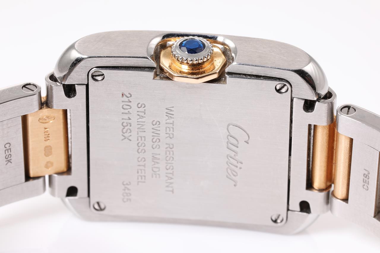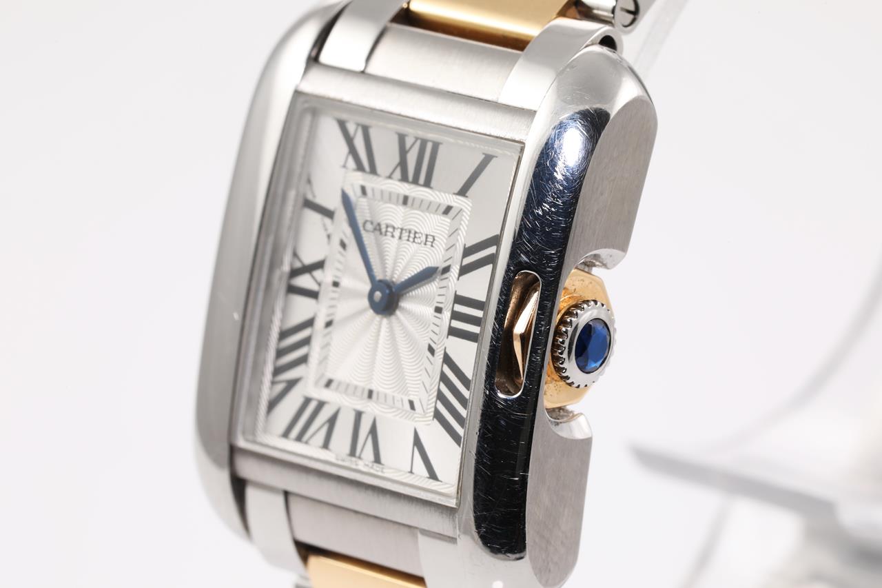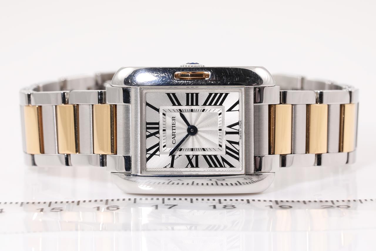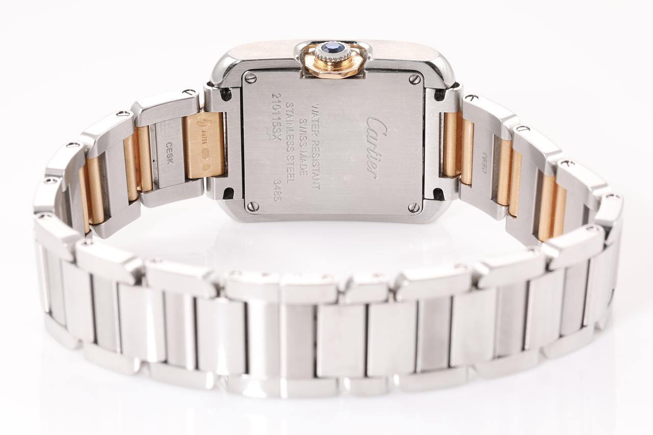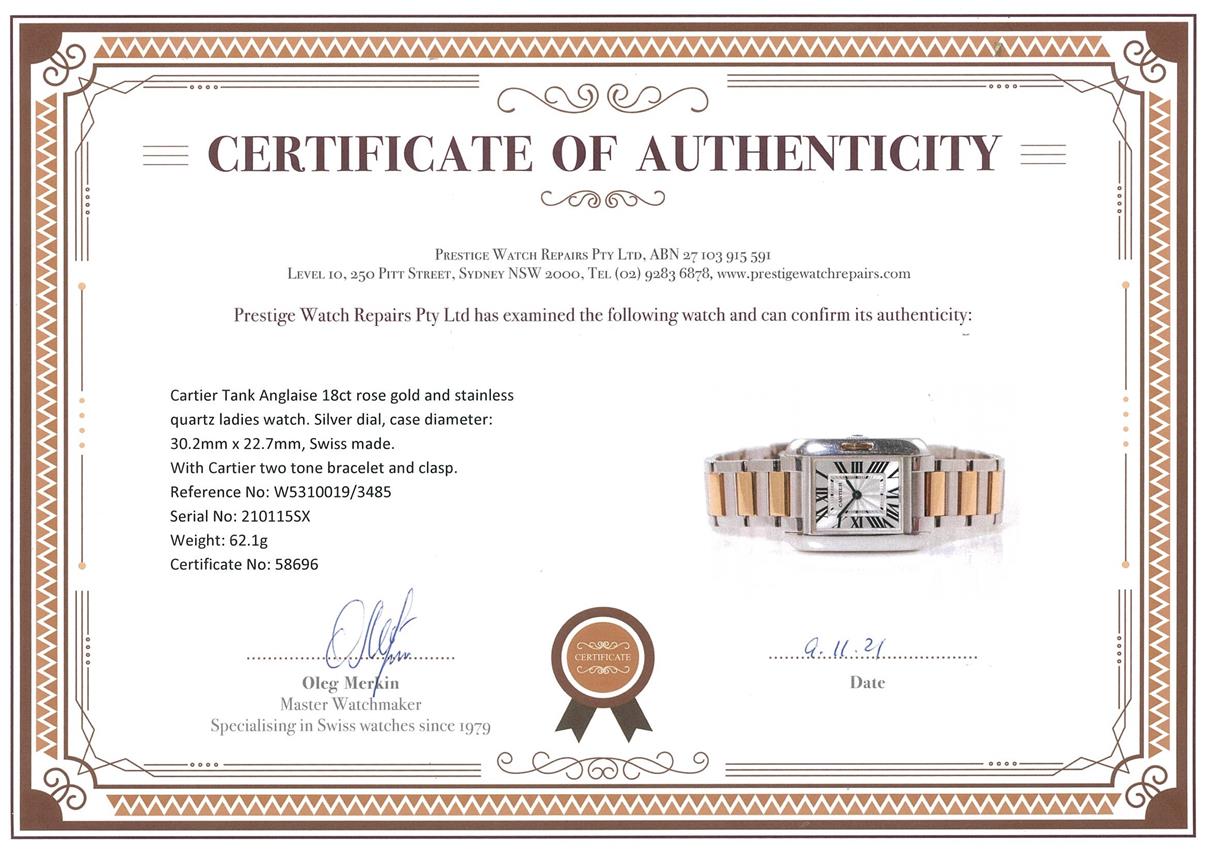 Cartier Tank Anglaise 18ct rose gold and stainless quartz ladies watch. Silver dial, case diameter: 30.2mm x 22.7mm, wrist size: 16cm, Swiss made. Ref# W5310019/3485. With Cartier two tone bracelet and clasp. With certificate of authenticity, Cartier certificate booklet 11/10/2013 and Cartier box. 3 month FSA warranty. (Pre-owned)