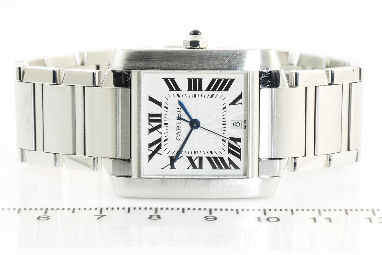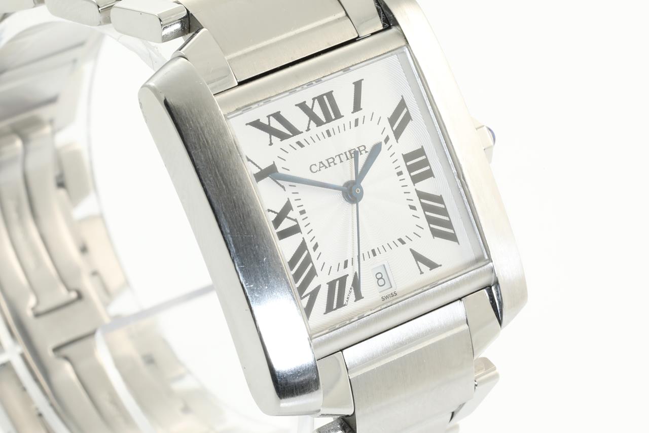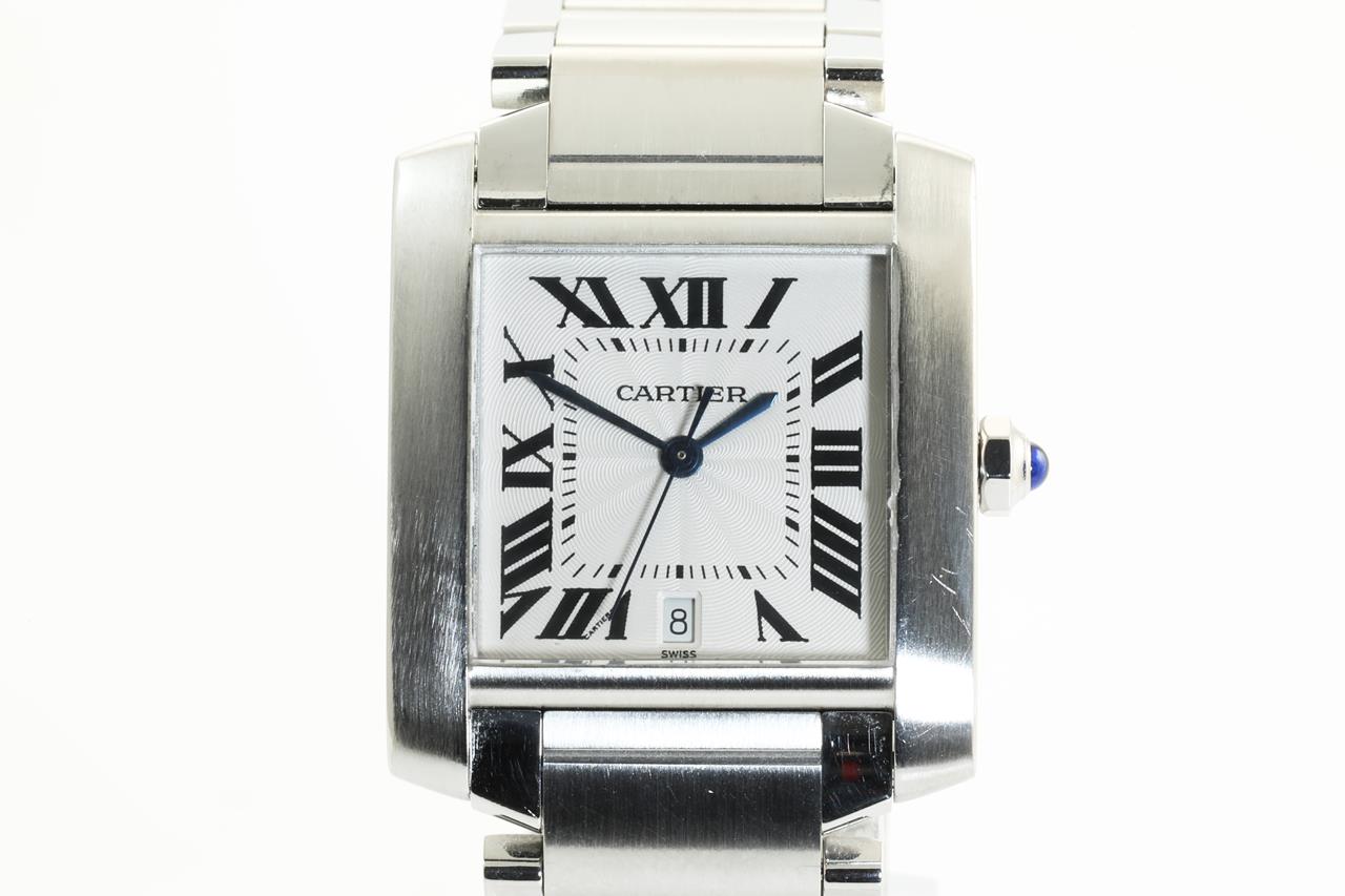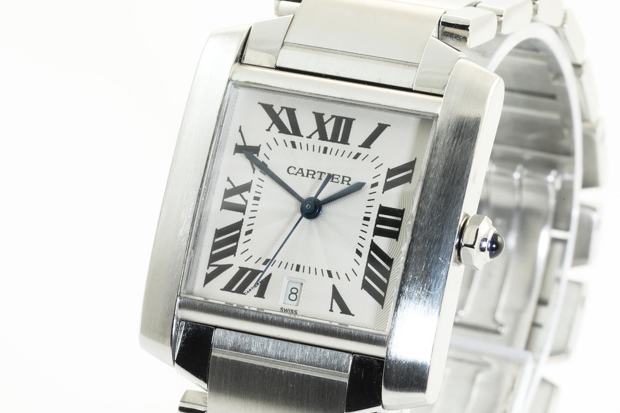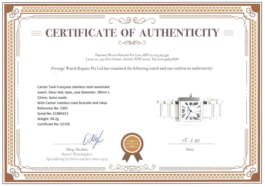 Cartier Tank Française stainless steel automatic watch. Silver dial, date, case diameter: 28mm x 32mm, wrist size: 16.5cm, Swiss made. Ref# 2302. With Cartier stainless steel bracelet and clasp. With certificate of authenticity. (Pre-owned)