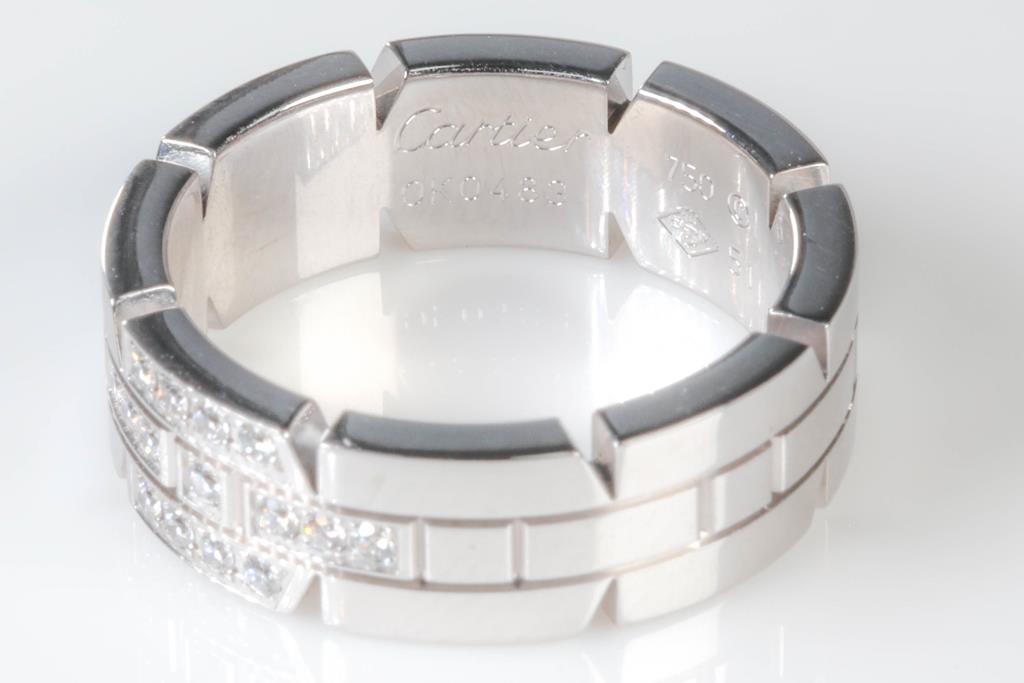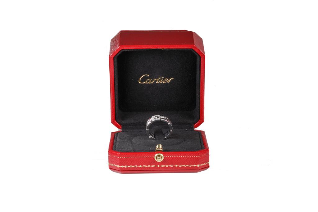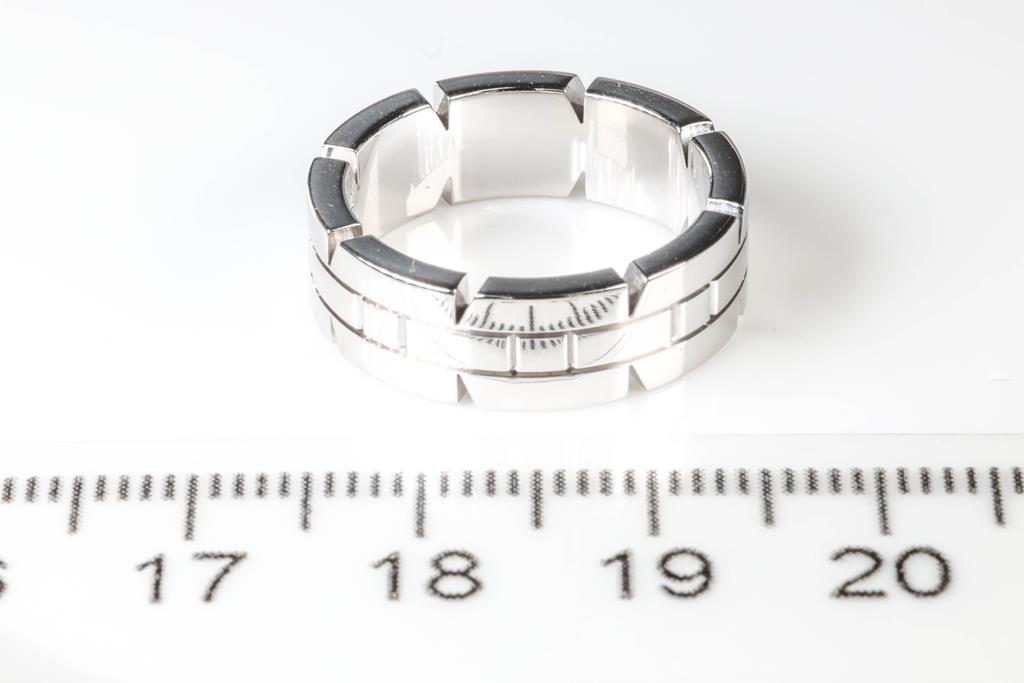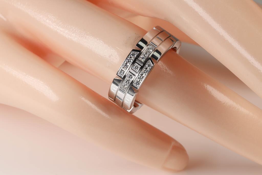 Cartier Tank Francaise ring with round Diamonds totalling 0.10cts. Cartier stamped size 51, K1/2 - ring resizing is not recommended. 18ct white gold. With Cartier box and Cartier authenticity certificate dated 29/11/2008. Weight: 9.3g. (Pre-owned)