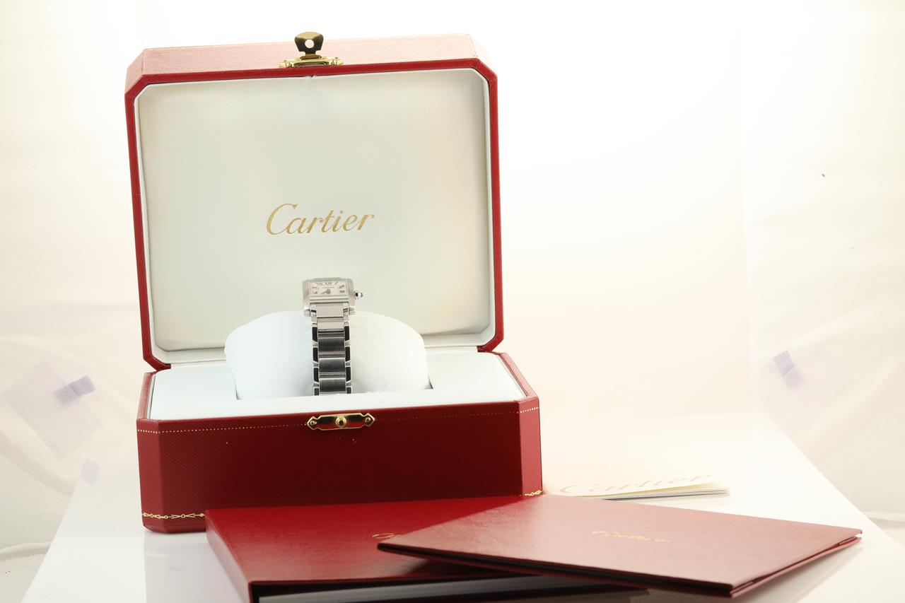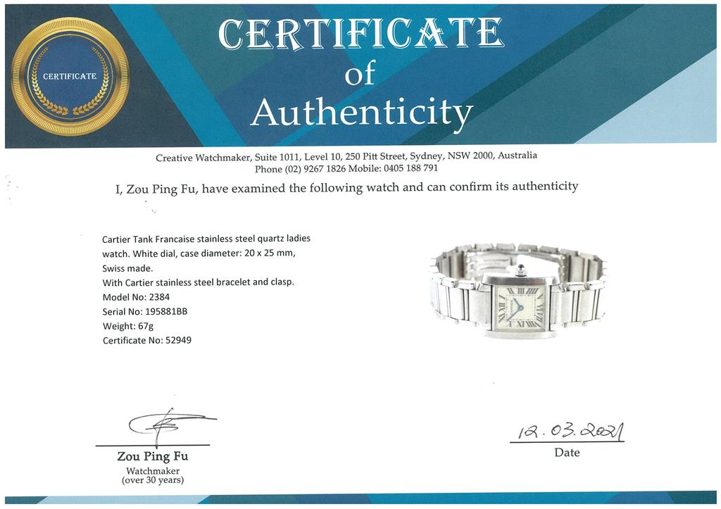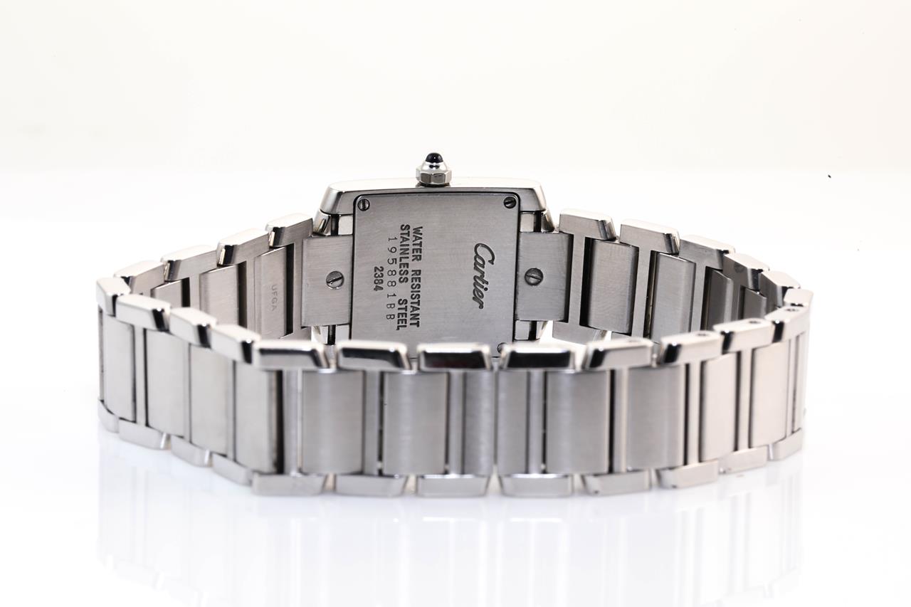 Cartier Tank Francaise stainless steel quartz ladies watch. White dial, case diameter: 20 x 25 mm, wrist size: 18cm. Swiss made. Ref #2384. With Cartier stainless steel bracelet and clasp. With certificate of authenticity, Cartier certificate booklet dated 2001/9/9, Cartier cleaning kit, pouch and Cartier box. 3 month FSA warranty.(Pre-owned)