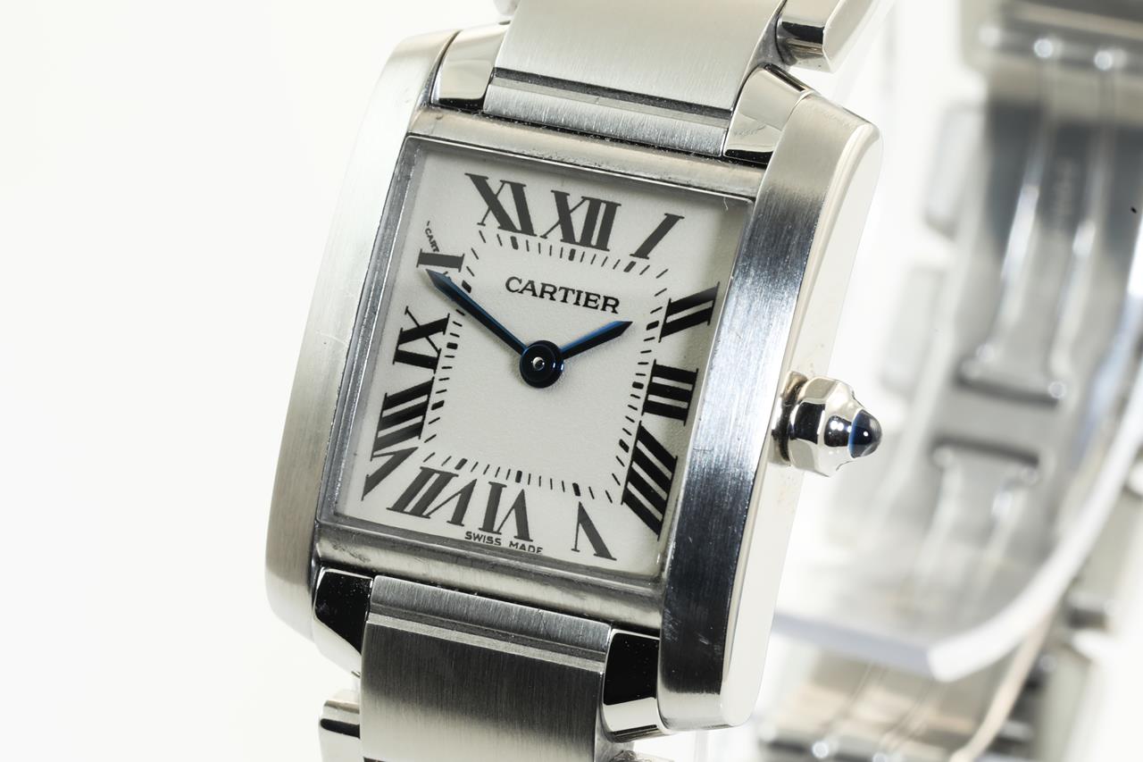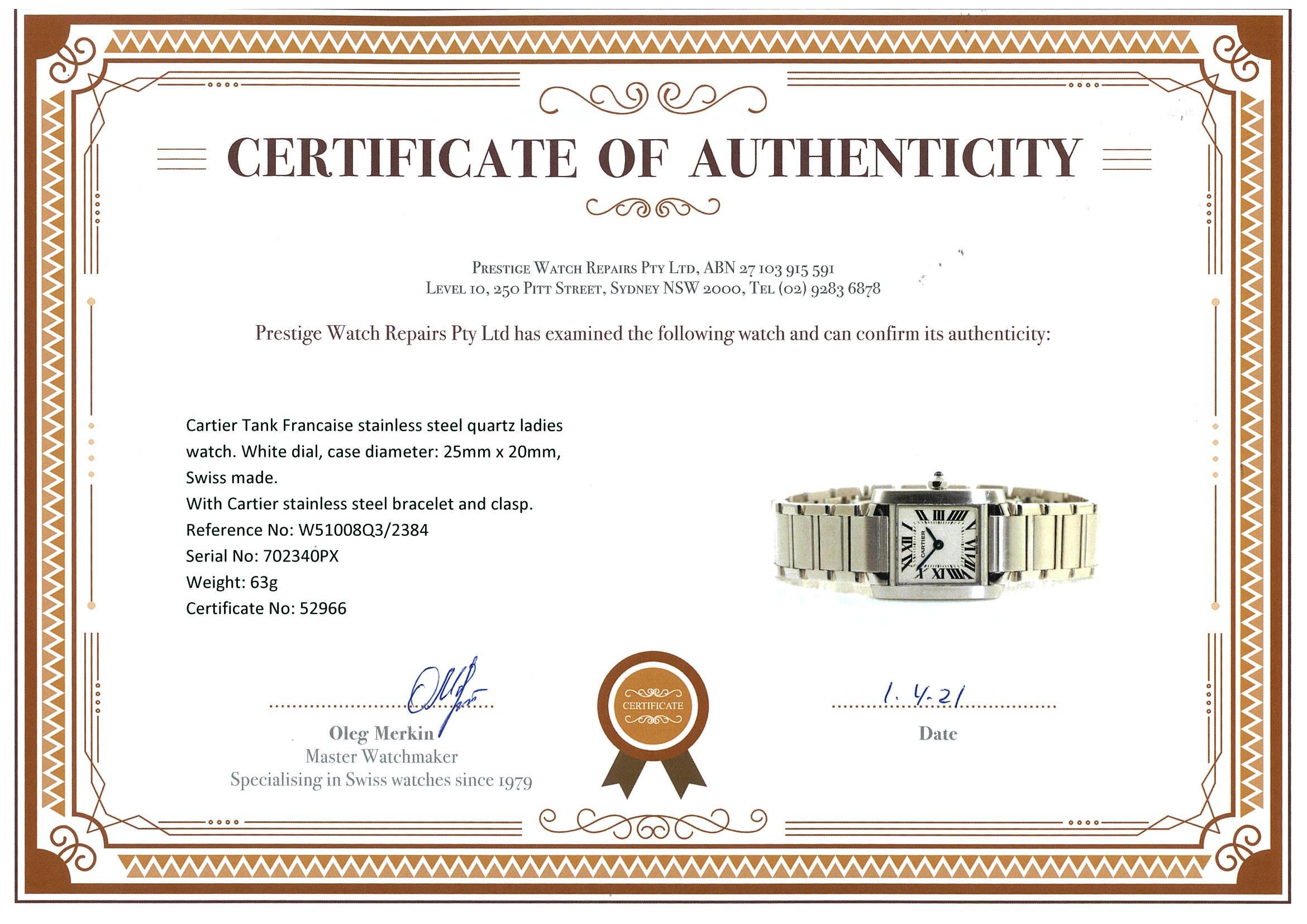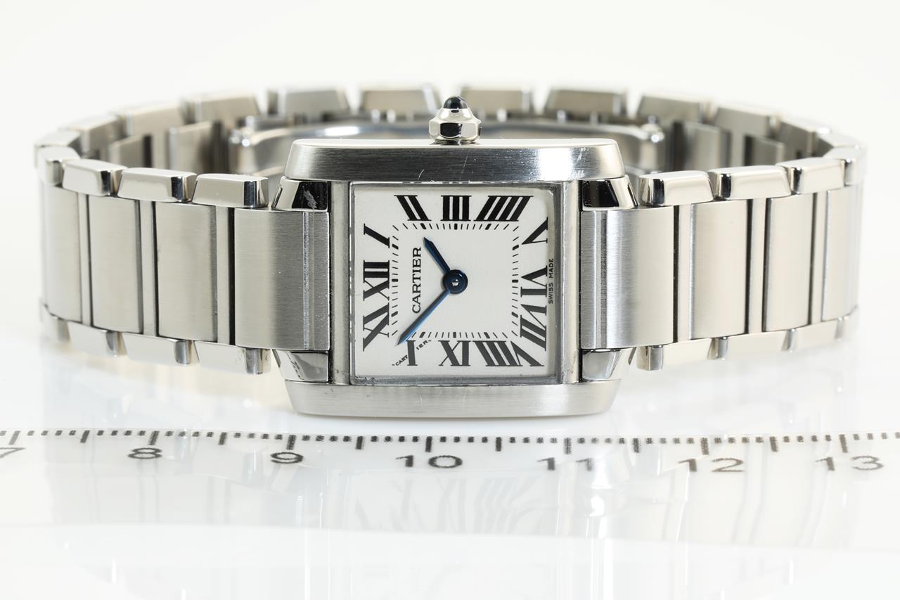 Cartier Tank Francaise stainless steel quartz ladies watch. White dial, case diameter: 25mm x 20mm, wrist size: 16cm. Swiss made. Ref #W51008Q3/2384. With Cartier stainless steel bracelet and clasp. With Cartier certificate booklet dated 2009/10/19 inside Cartier box. With certificate of authenticity. 3 month FSA warranty. (Pre-owned)