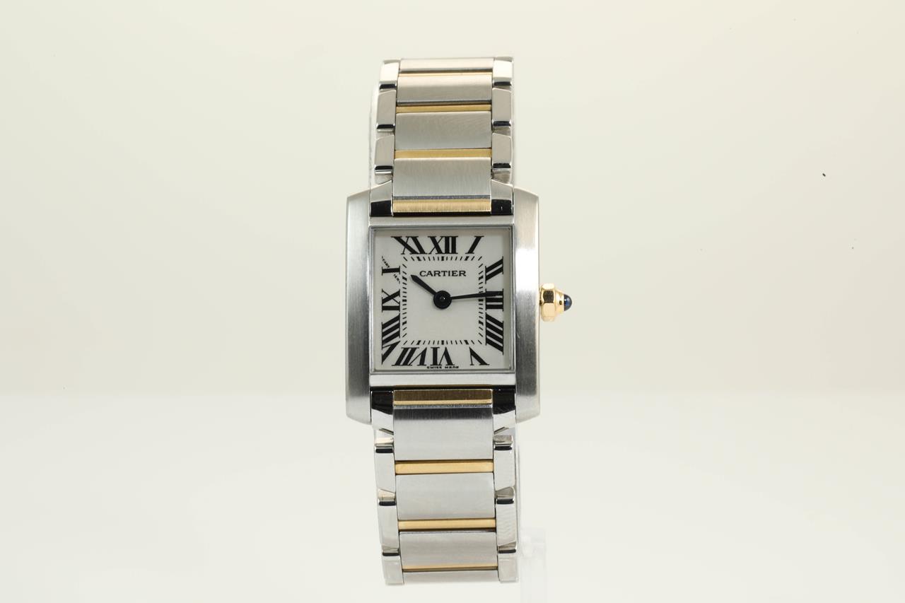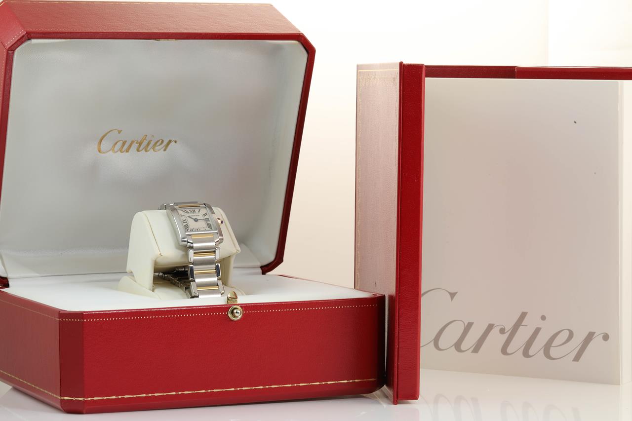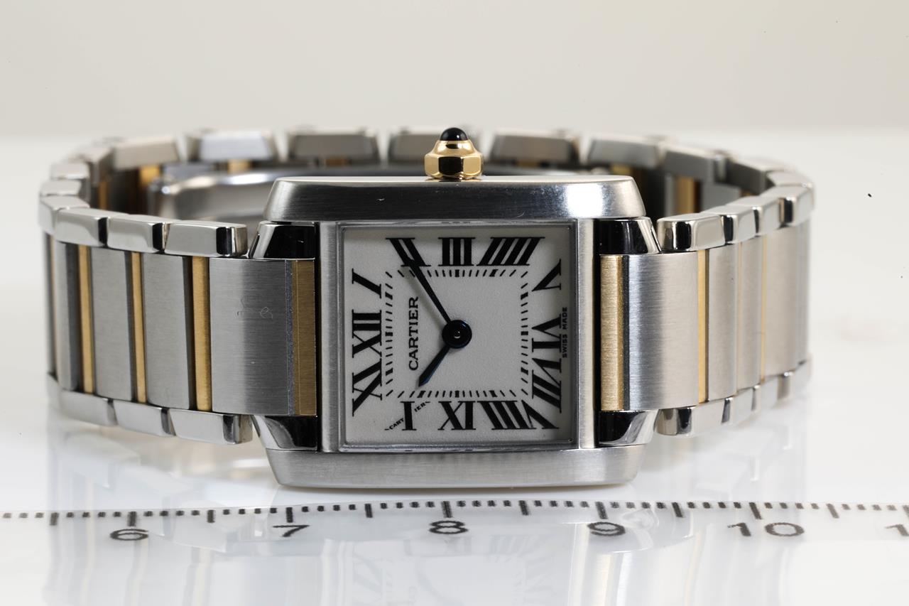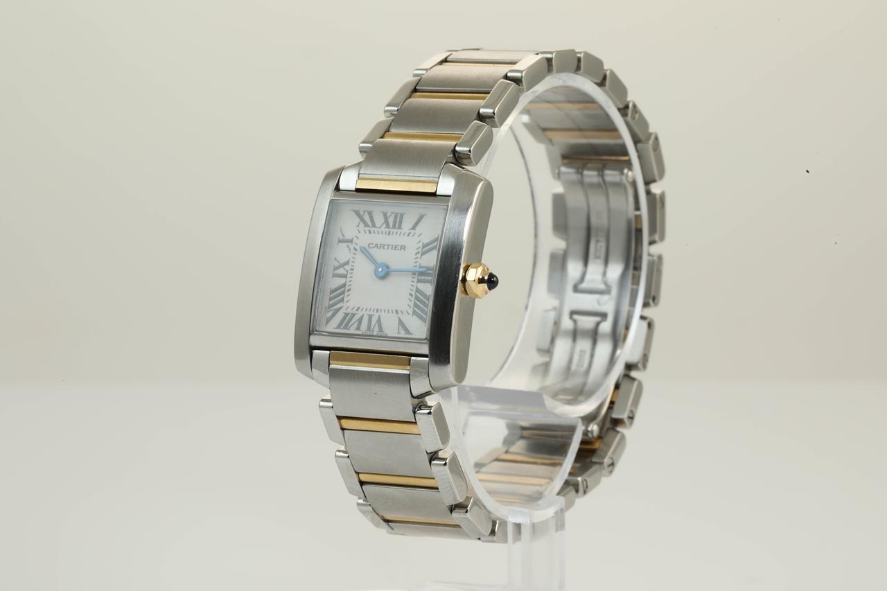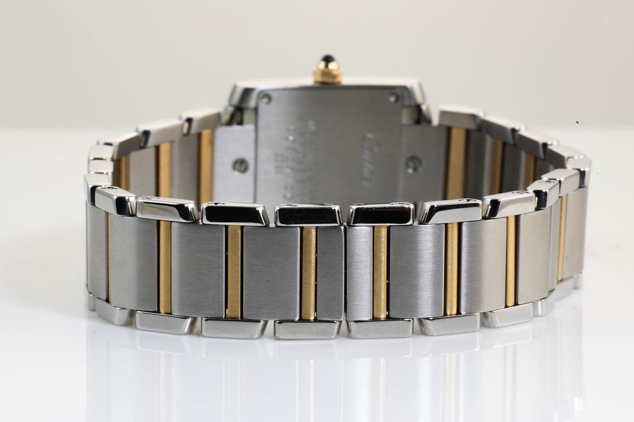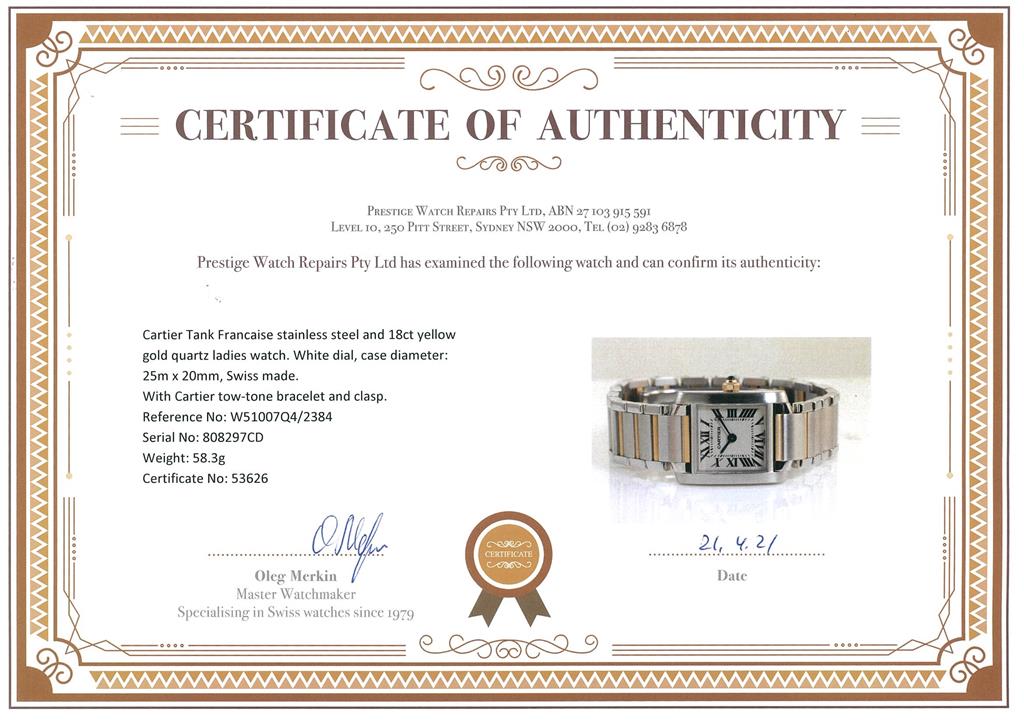 Cartier Tank Francaise stainless steel and 18ct yellow gold quartz ladies watch. White dial, case diameter: 25m x 20mm, wrist size: 16.5cm. Swiss made. Ref #W51007Q4/2384. With Cartier tow-tone bracelet and clasp. With certificate of authenticity. With Cartier certificate booklet dated 2002/04/19 inside Cartier box. 3 month FSA warranty.(Pre-owned)