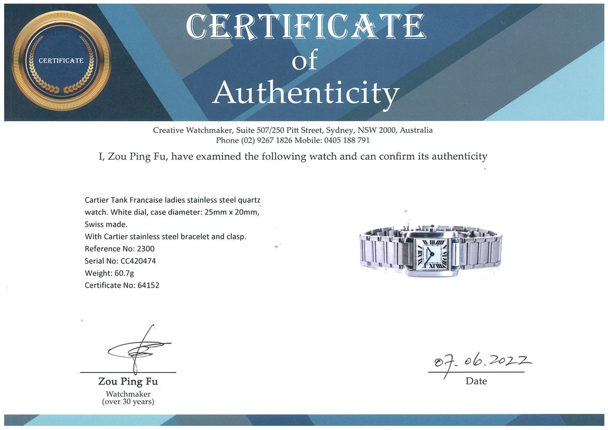 Cartier Tank Francaise ladies stainless steel quartz watch. White dial, case diameter: 25mm x 20mm, wrist size: 17cm, Swiss made. Ref# 2300. With Cartier stainless steel bracelet and clasp. With Certificate of Authenticity and Cartier box. 3 month FSA warranty. (Pre-owned)