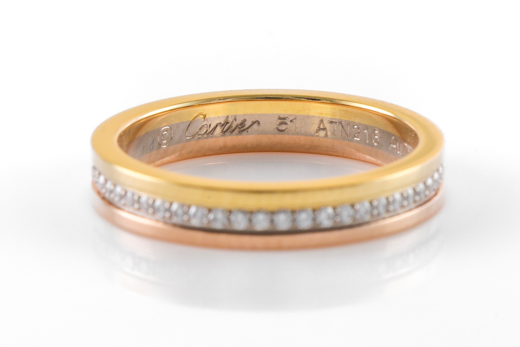 Cartier Tricolour full eternity Diamond ring with round Diamonds totalling approximately 0.25cts. 18ct yellow, rose and white gold. Stamped size 51, K1/2- ring resizing is not recommended. Weight: 4.1g. With Cartier certificate and box. (Pre-owned)