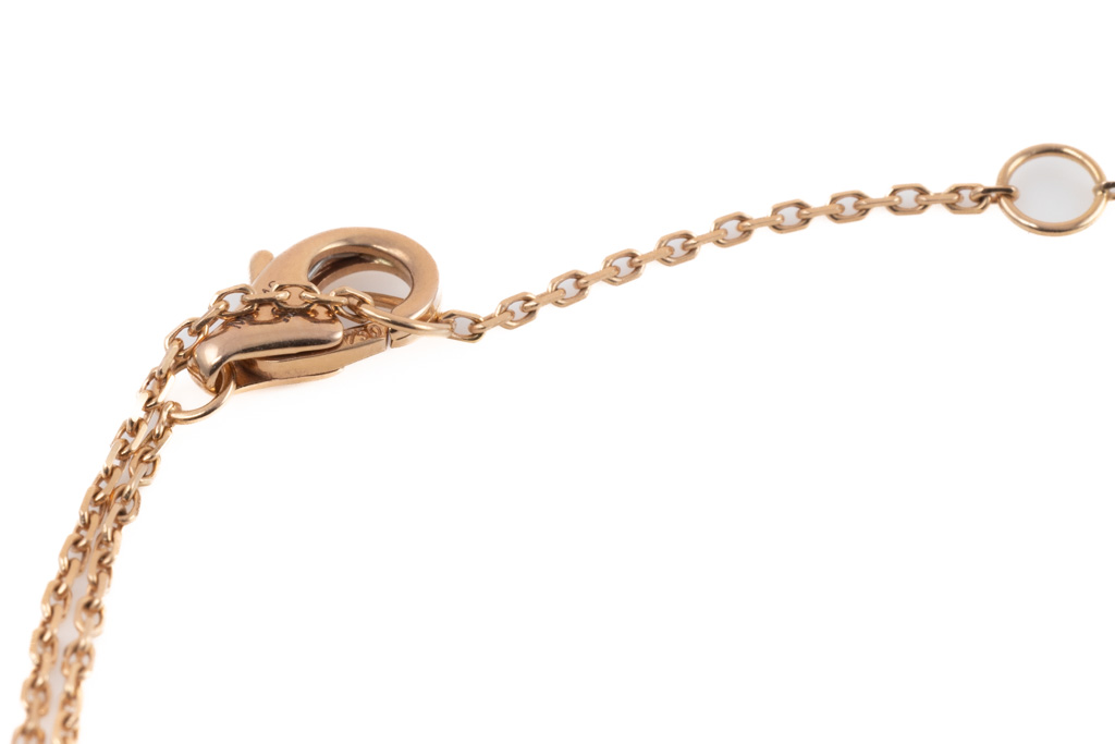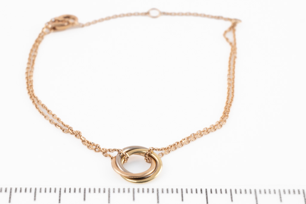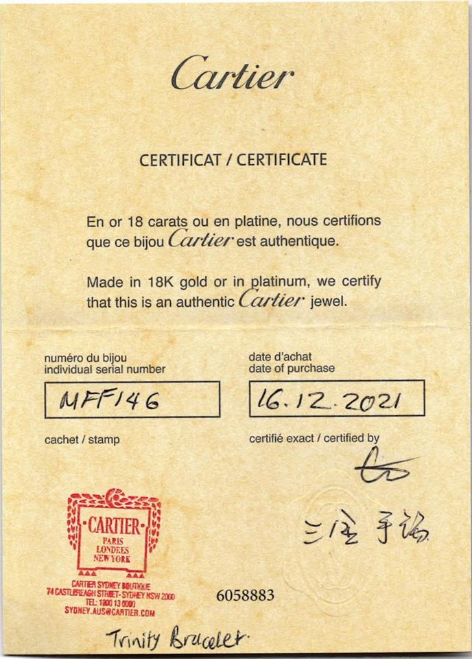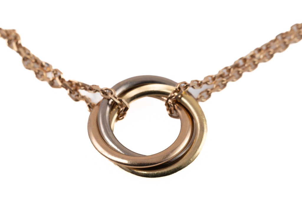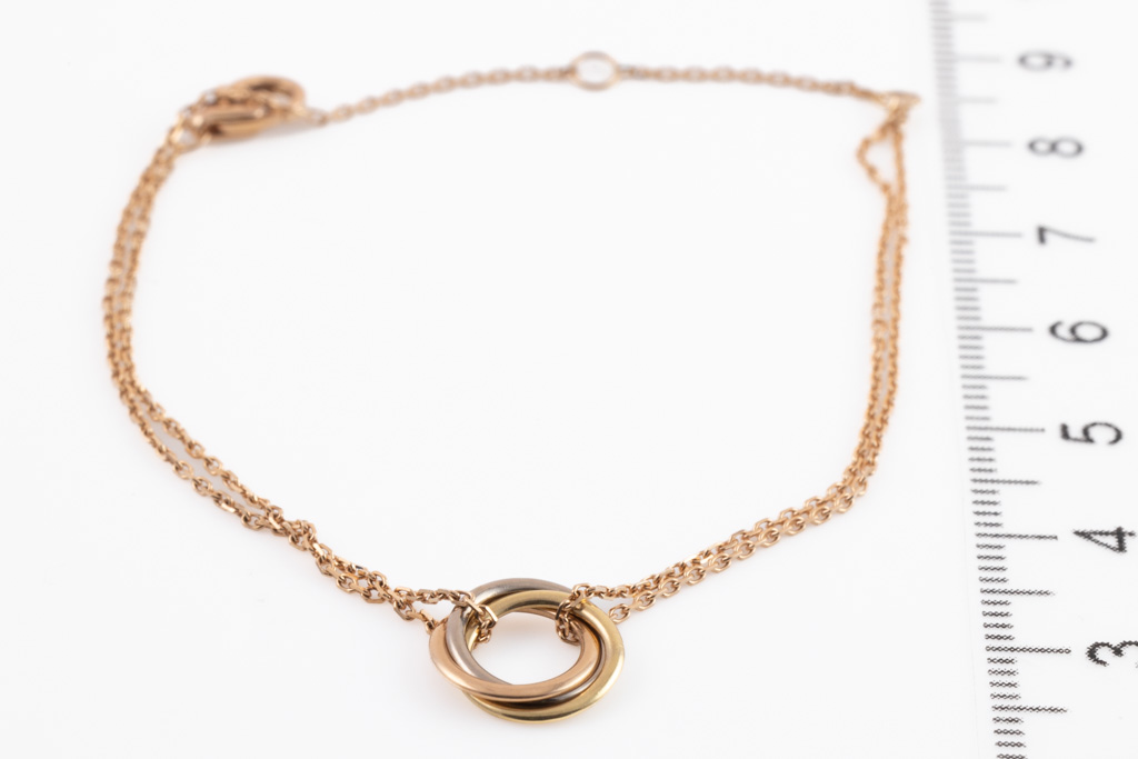 Cartier Trinity bracelet, small model. Inner diameter: 7.3mm. 18ct yellow, rose and white gold with 18ct rose gold chain. Adjustable chain max length: 18.5cm. With Cartier Authenticity Certificate dated 16/12/2021. (Pre-owned)