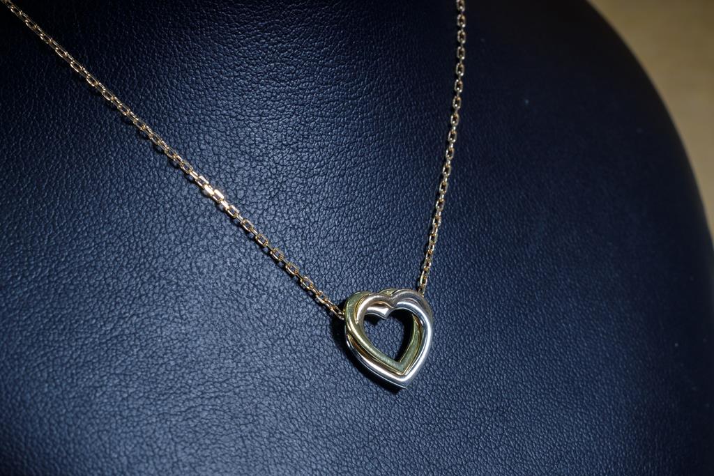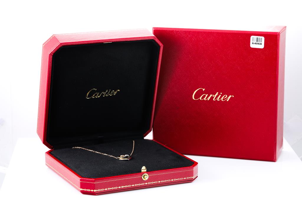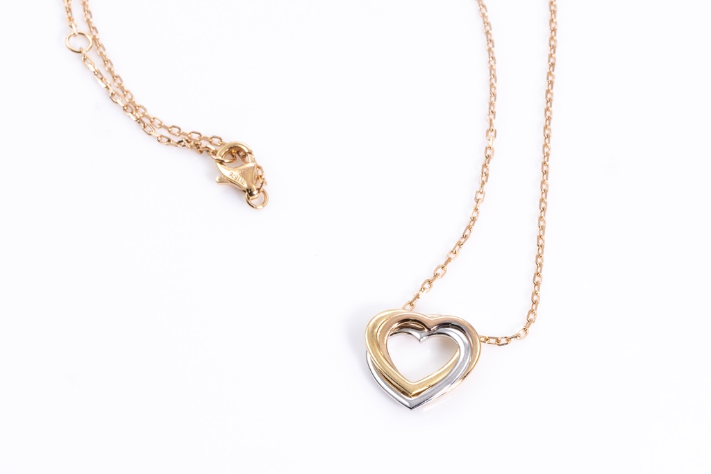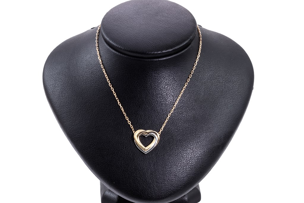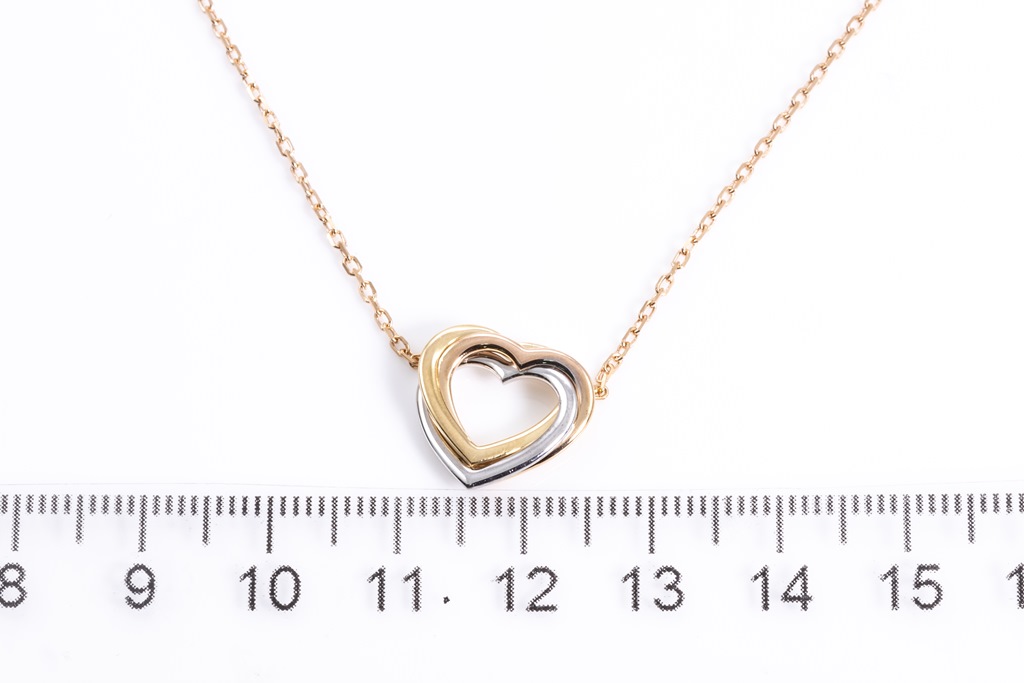 Cartier Trinity Heart pendant. 18ct yellow, rose and white gold with attached 18ct rose gold Cartier chain. Length: 41cm. Weight: 4.4g. With Cartier box and Cartier authenticity certificate dated 05/07/2010. (Pre-owned)