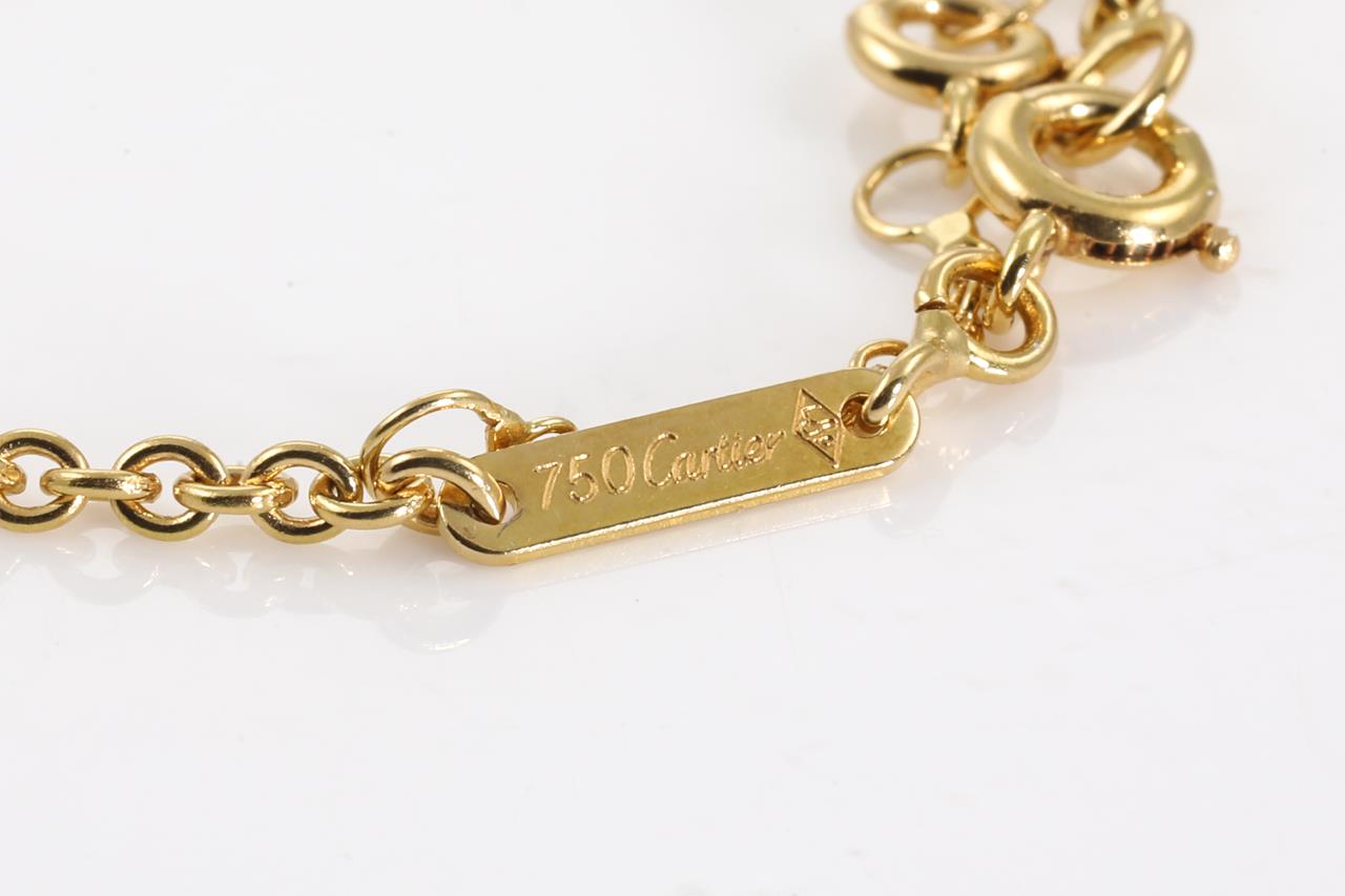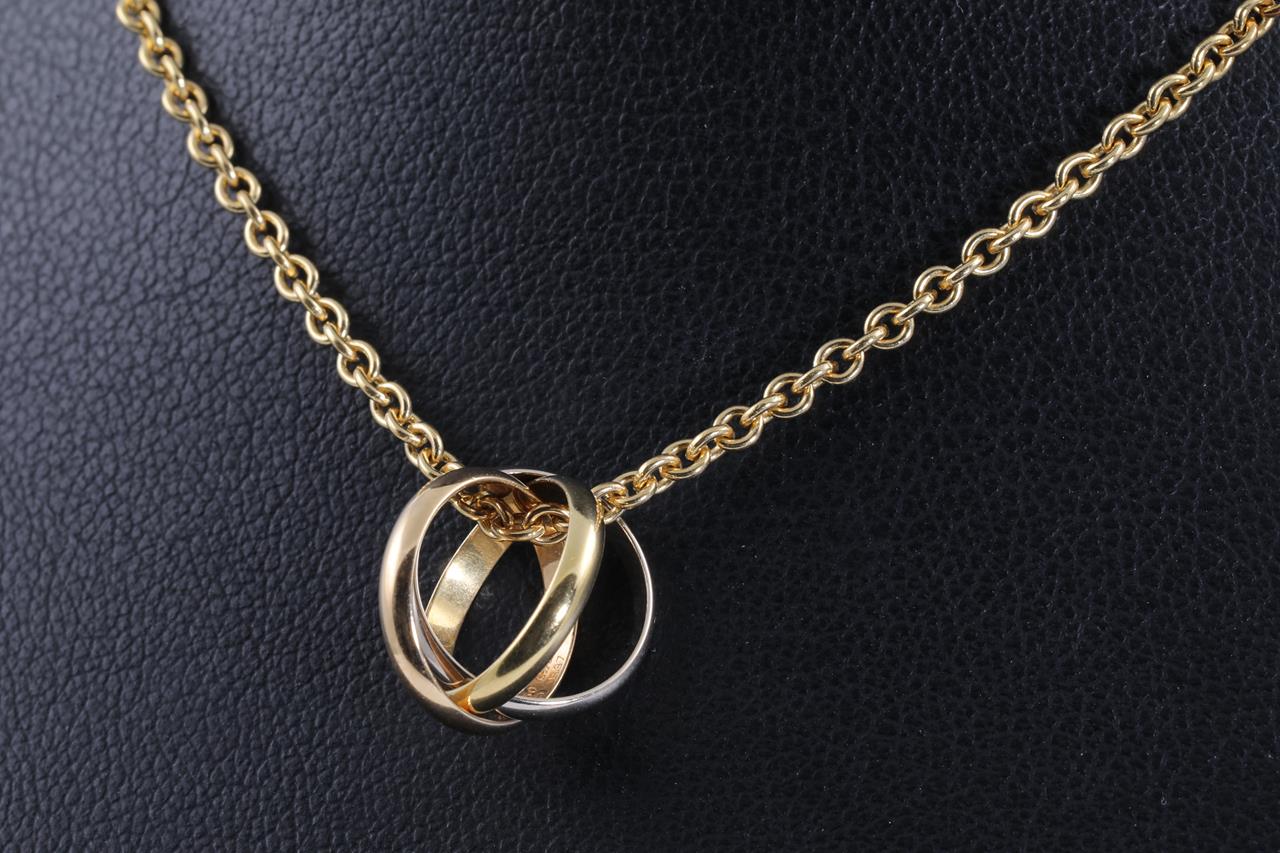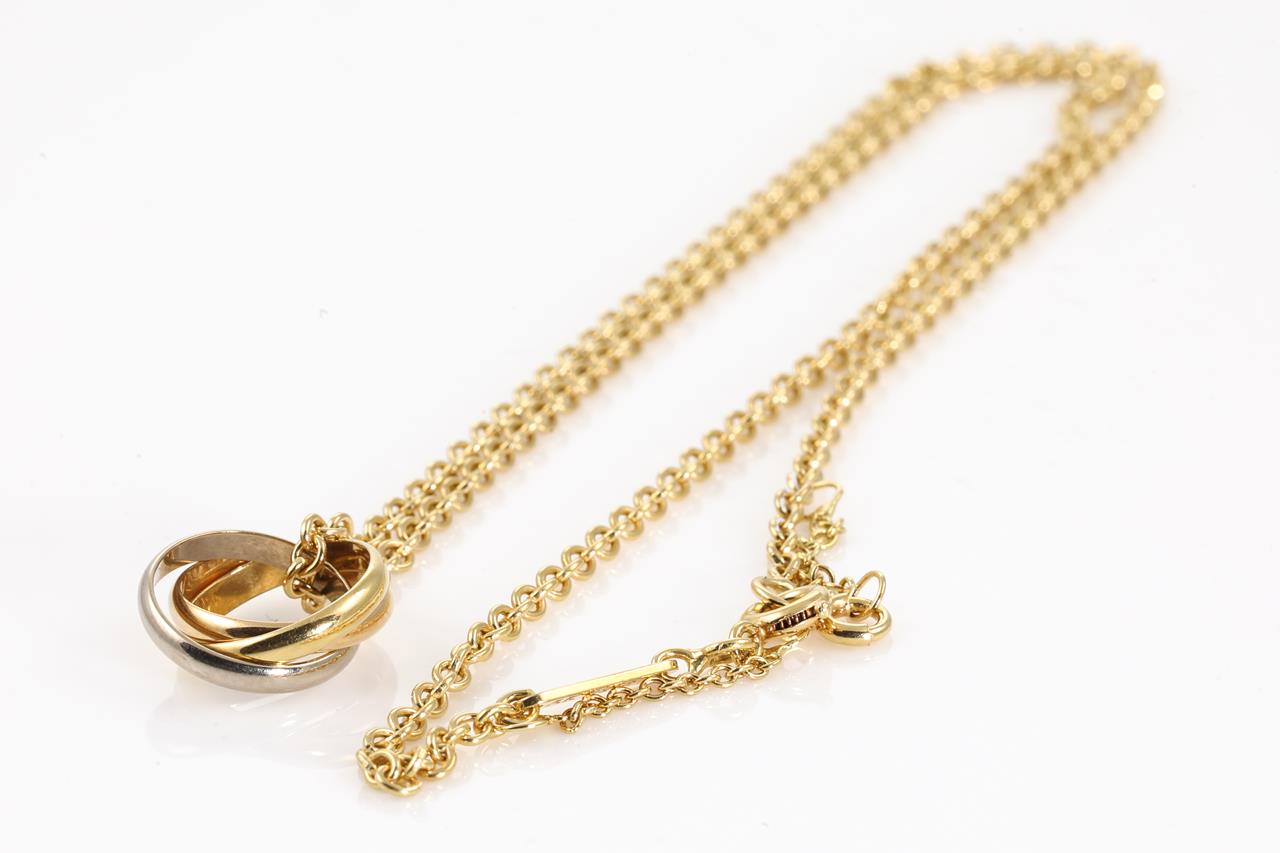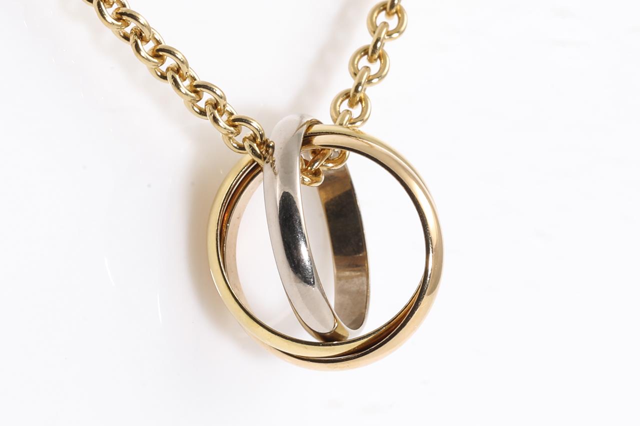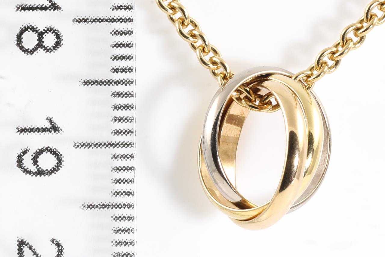 Cartier Trinity Necklace. 18ct yellow, rose & white gold with yellow gold chain. Inner diameter: 10.7mm. Adjustable max length: 42cm. Weight: 8.7g. With Cartier authenticity certificate dated 19/03/2003. (Pre-owned)