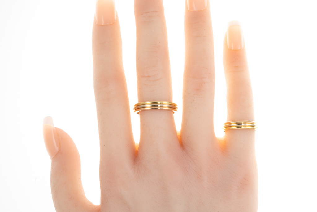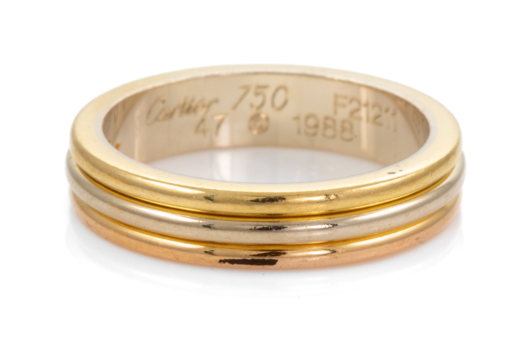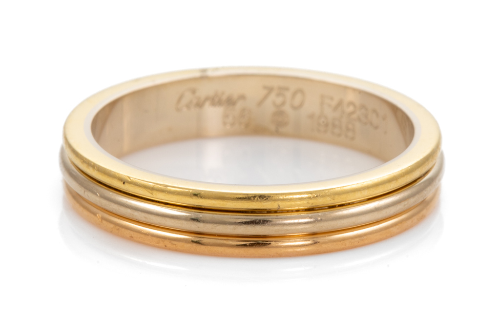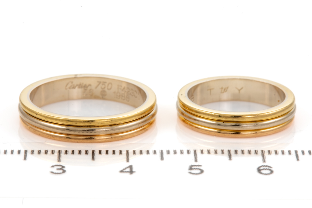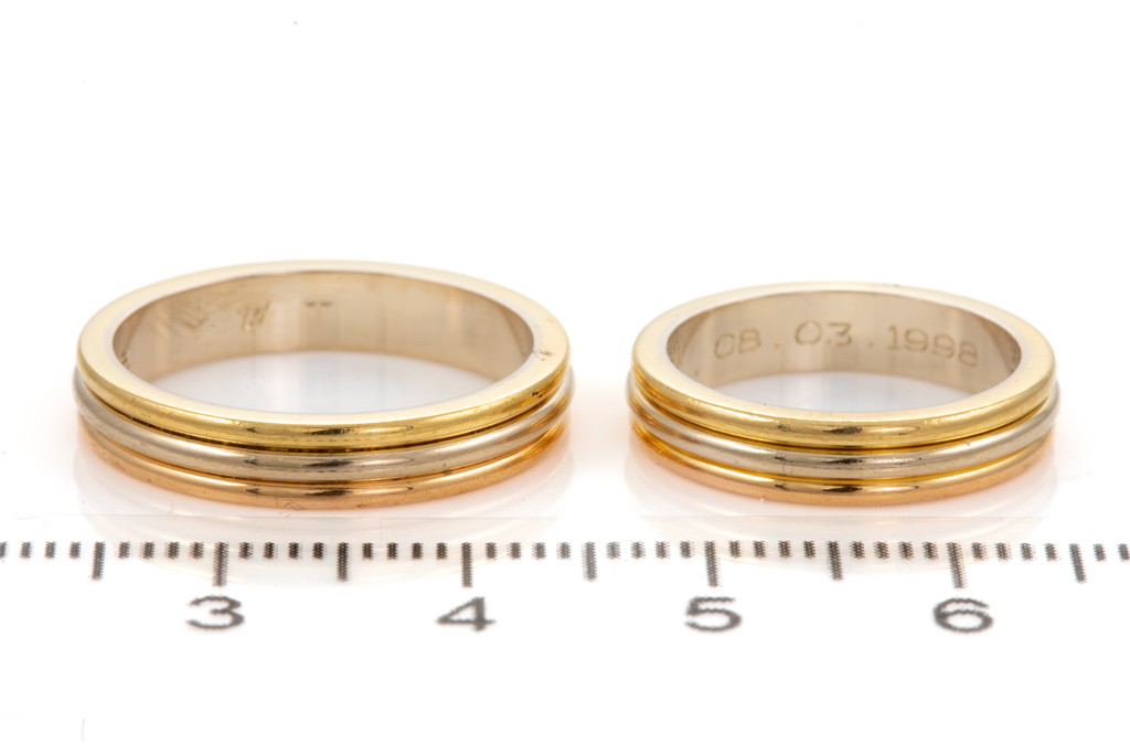 Set of Two Cartier Vendome Louis Cartier ring. 18ct yellow, white and rose gold. Circa: 1988. Cartier stamped size 47 and 56, H & O - ring resizing is not recommended. Total weight: 9.7g. Engraved 08.03.1998 Y to T With Cartier box - Box does not close. (Pre-owned)
