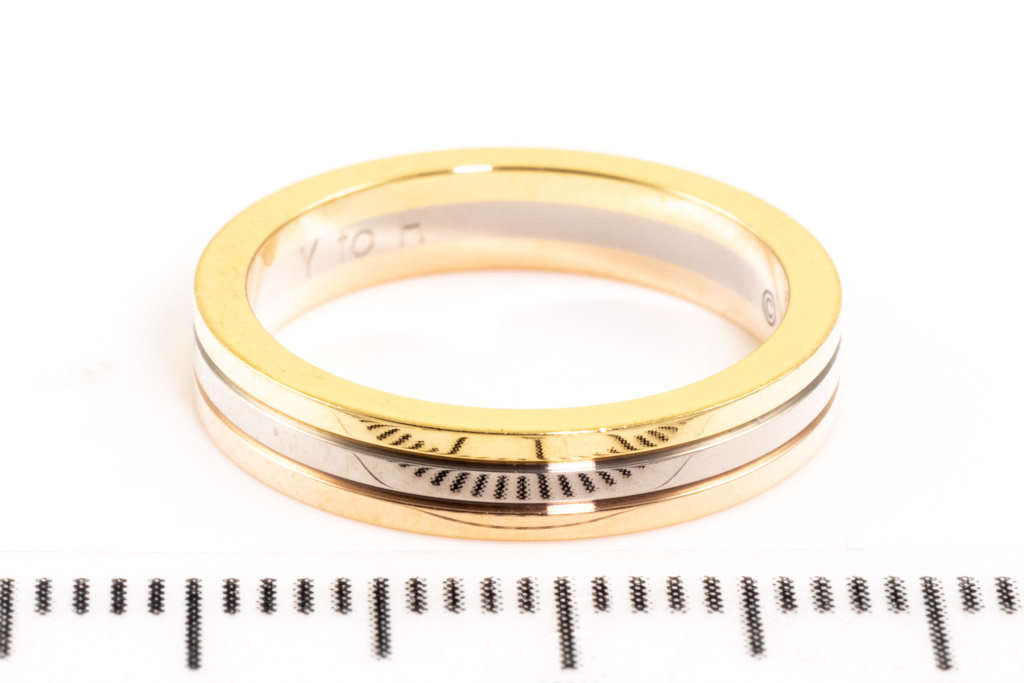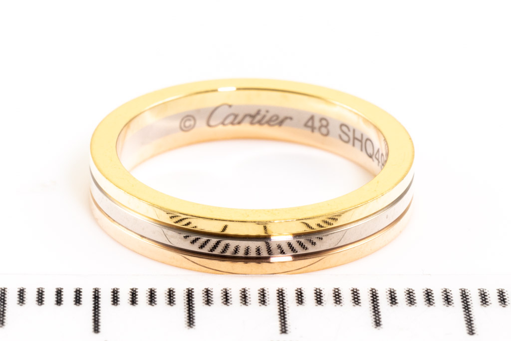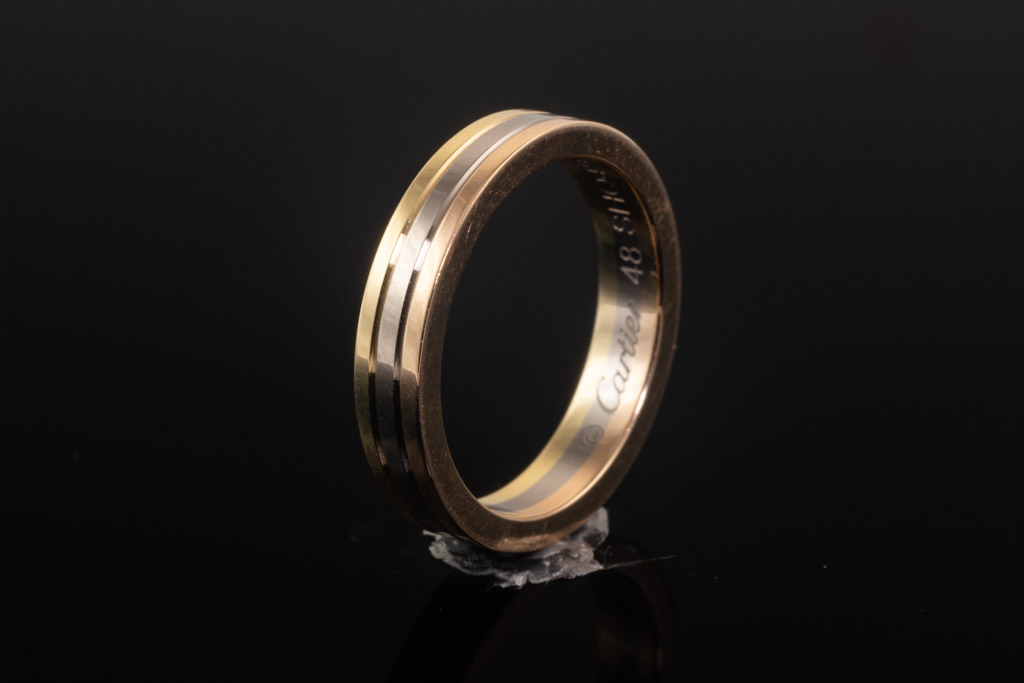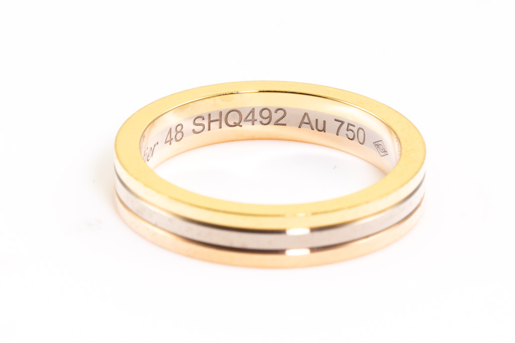 Cartier Vendome Louis ring. 18ct yellow, rose & white gold. Cartier stamped size 48 - ring resizing is not recommended. Width: 3.5mm. With engraving: Y to H. Weight: 4.4g. (Pre-owned)