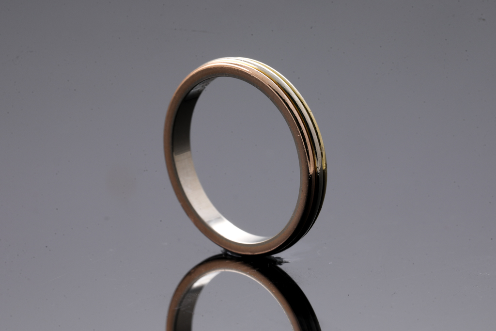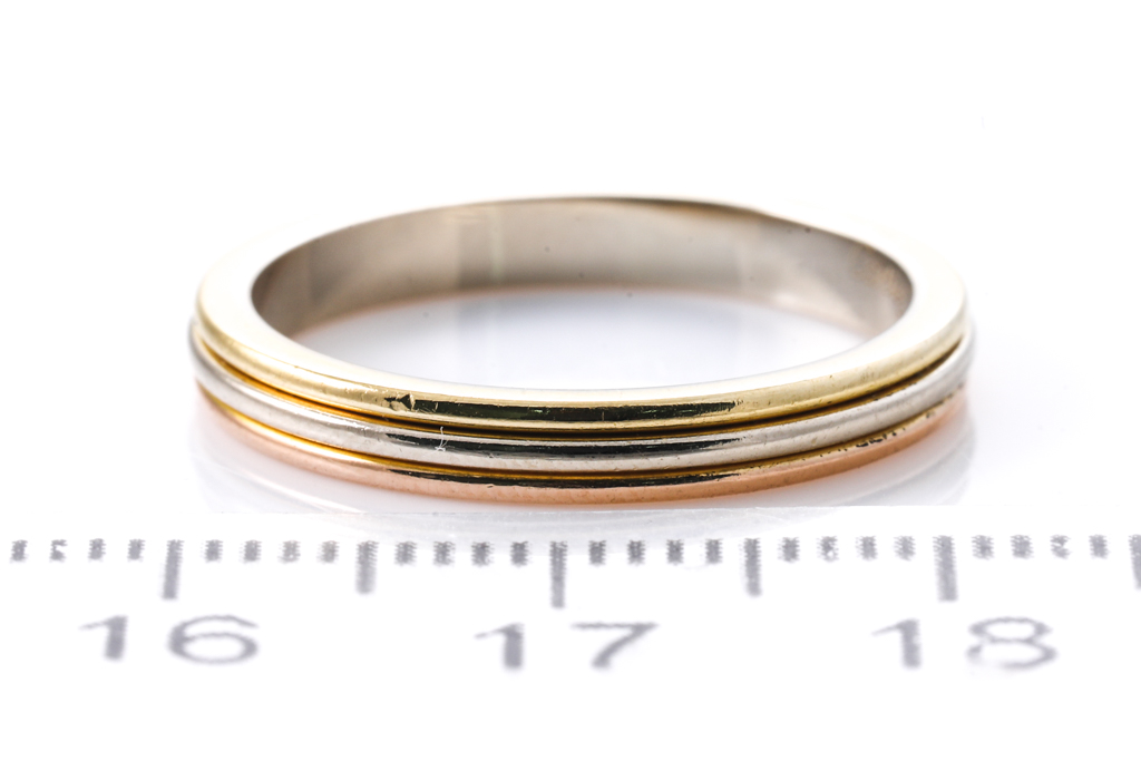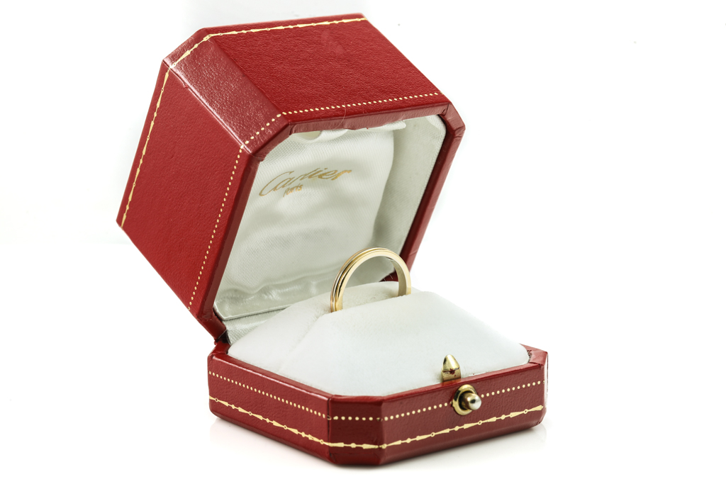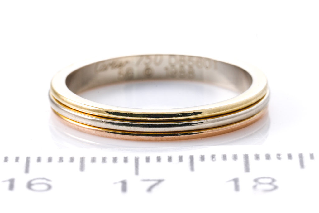 Cartier Vendome Louis wedding ring. 18ct rose, yellow and white gold. Circa 1988. Cartier stamped size 56, ring size O - ring resizing not recommended. Weight: 3.7g. With Cartier box. (Pre-owned)