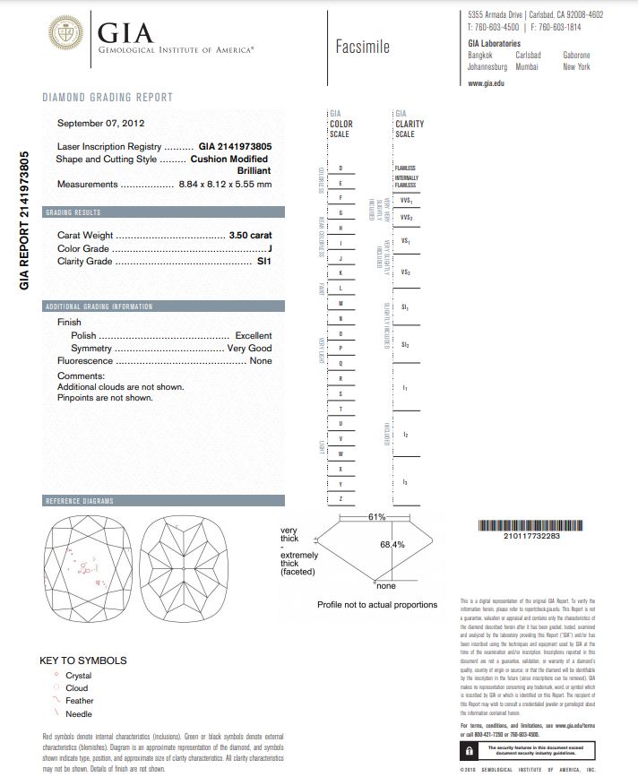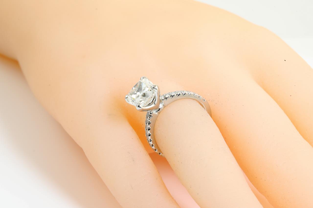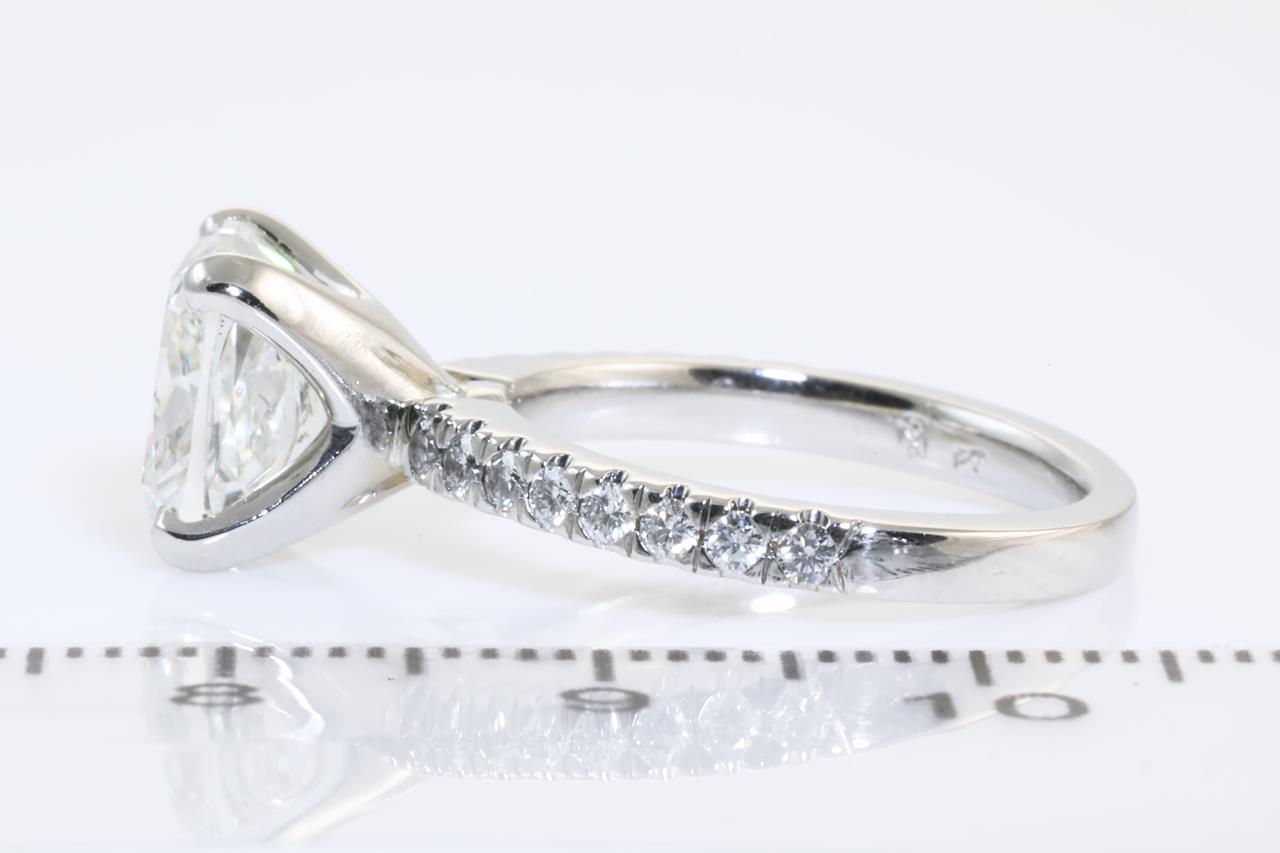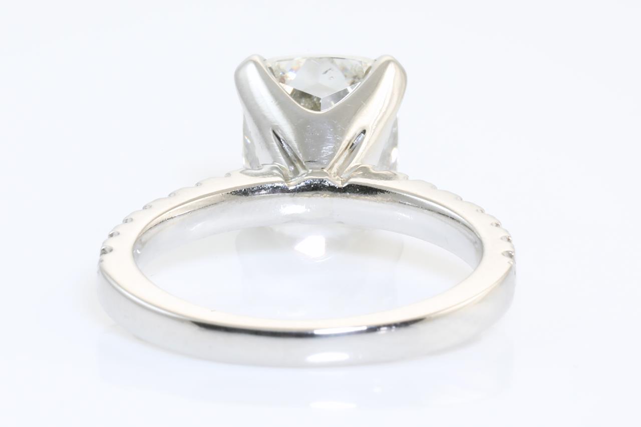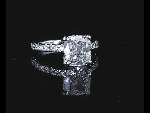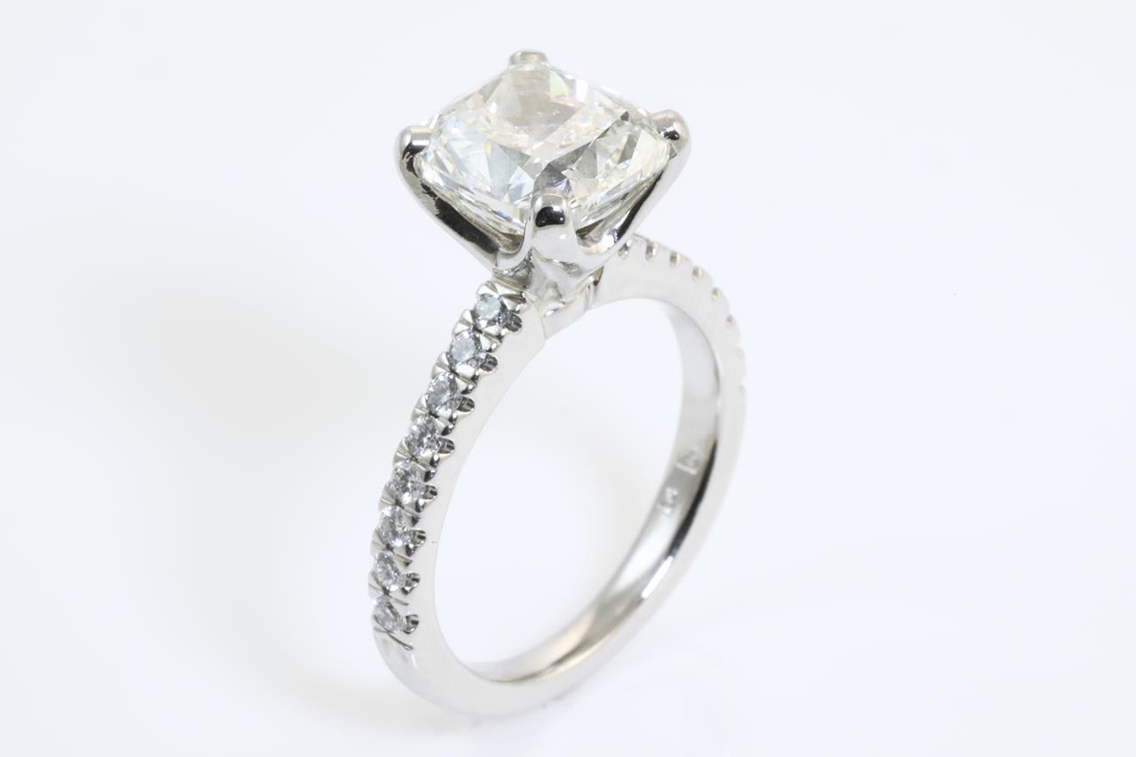 Diamond ring with centre cushion cut Diamond of 3.50ct (with copy of GIA report graded as J SI1 #2141973805) and remaining Diamonds totalling approximately 0.30cts (Estimated grading: H-I SI). Platinum. Ring size J. Weight: 7.3g (Pre-owned)