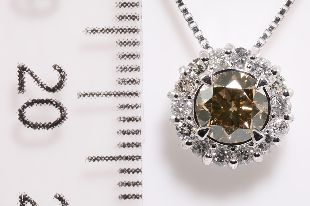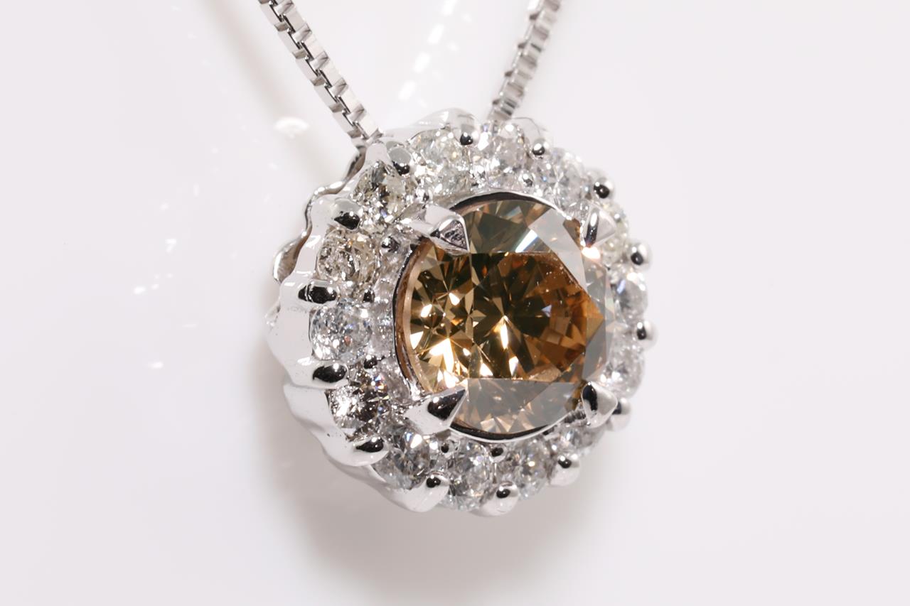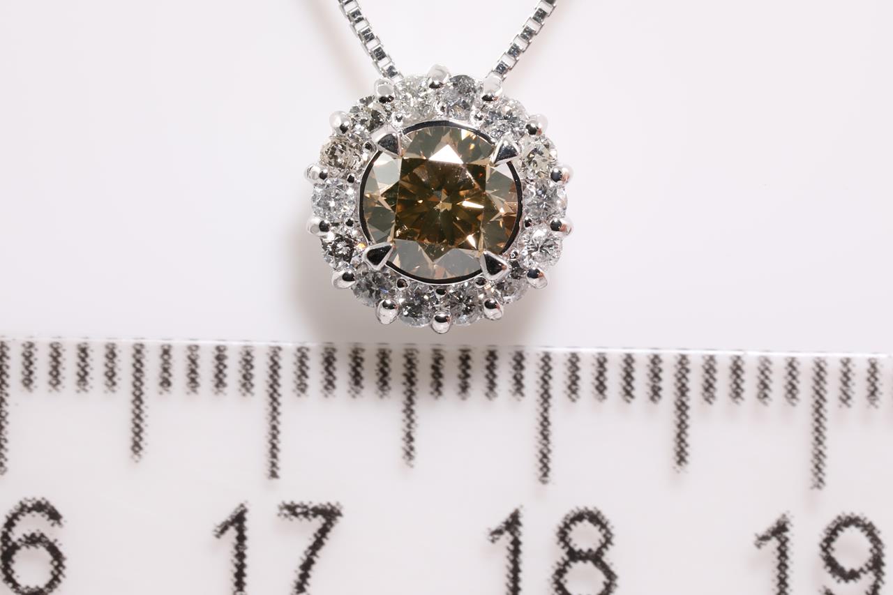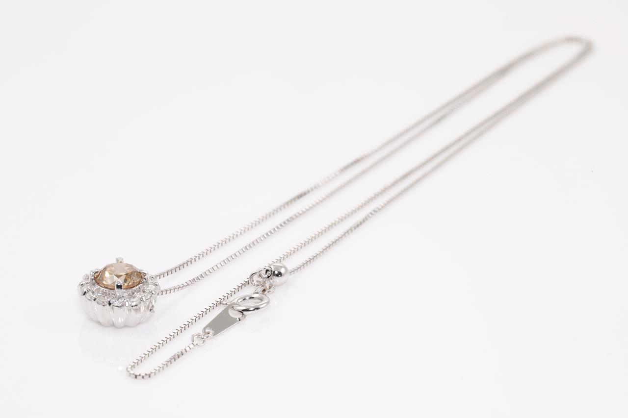Diamond halo pendant with a centre round Diamond of 0.74ct (Estimated grading: Natural Champagne VS) and remaining white Diamonds totalling 0.26cts (Estimated grading: G P2-3). 18ct white gold with adjustable 45cm chain. Weight: 3.2g. (Pre-owned)