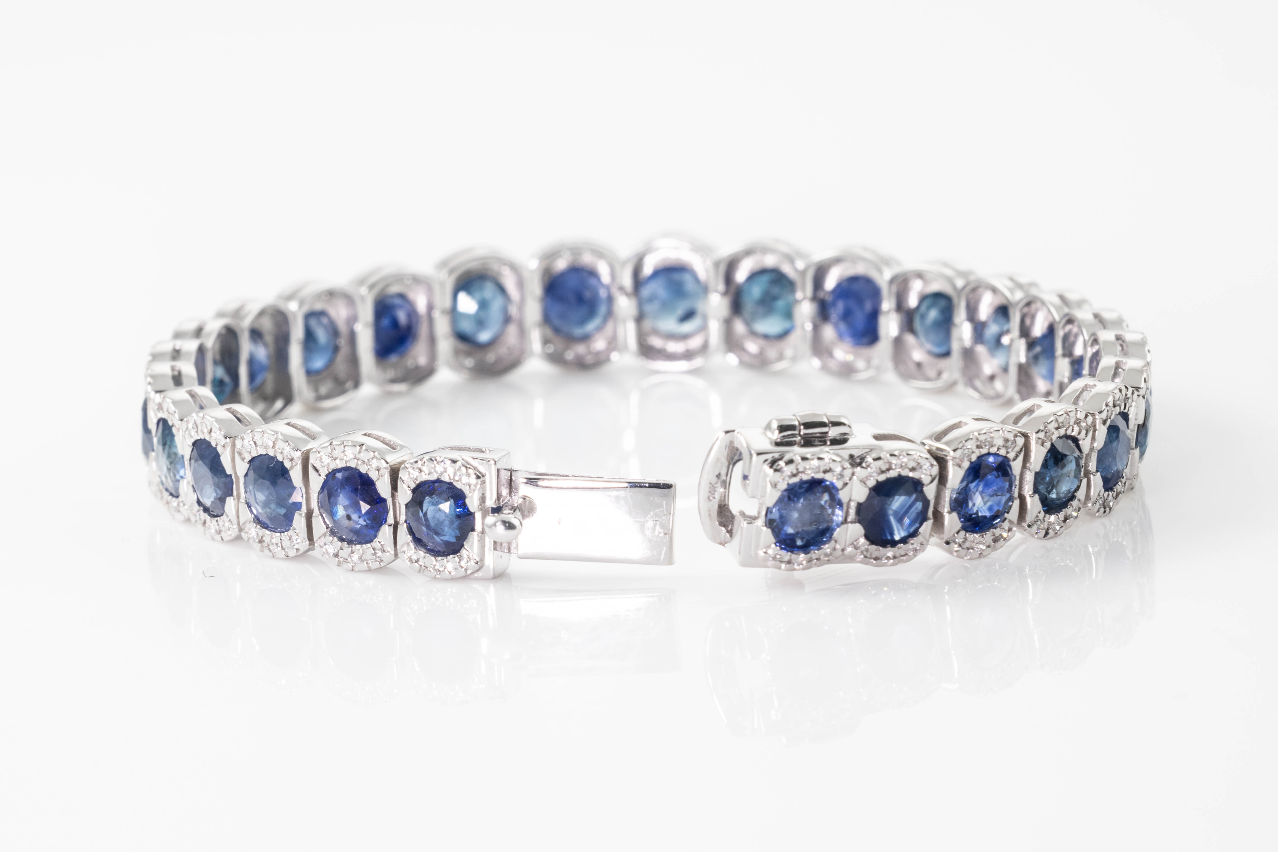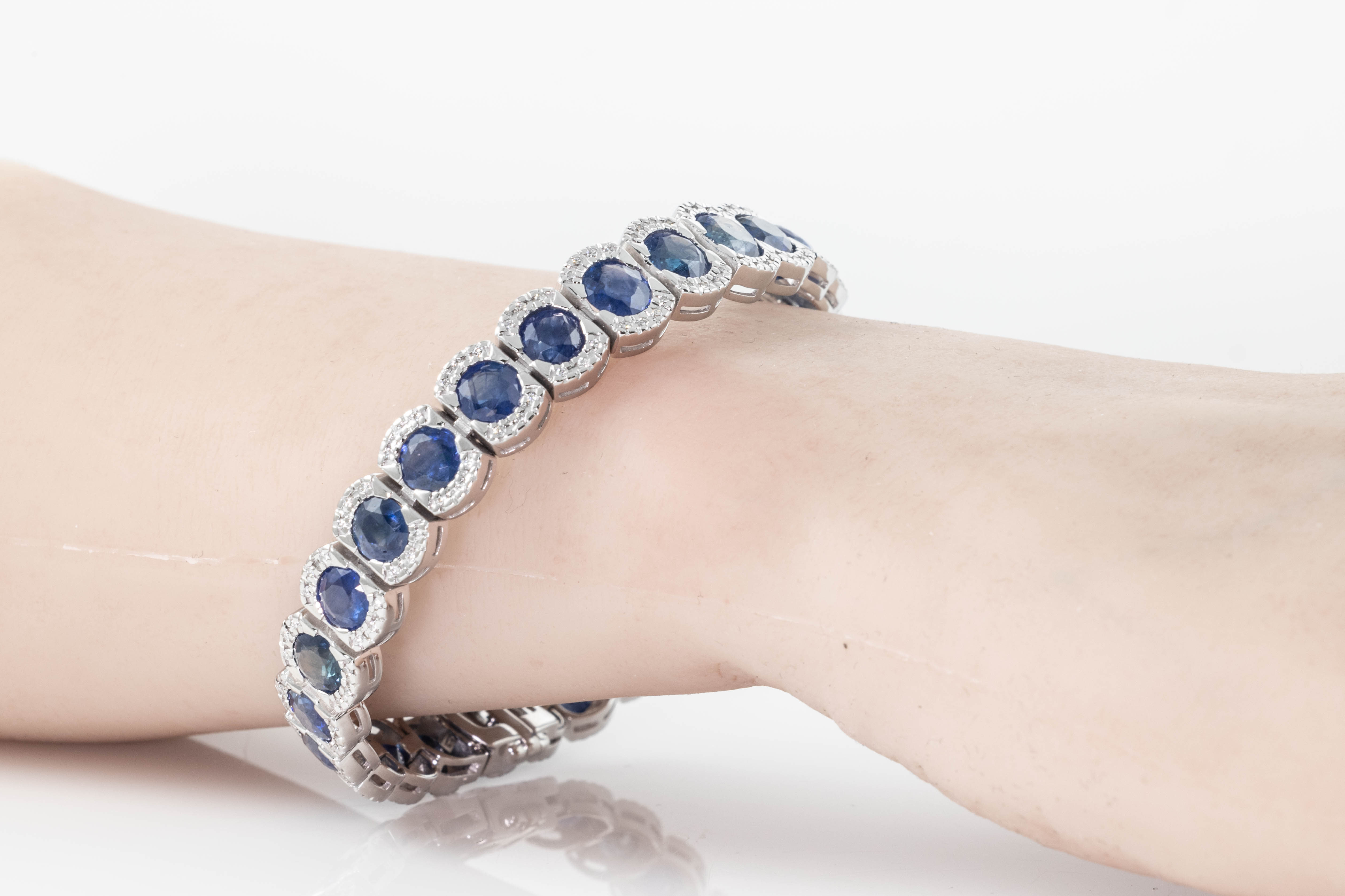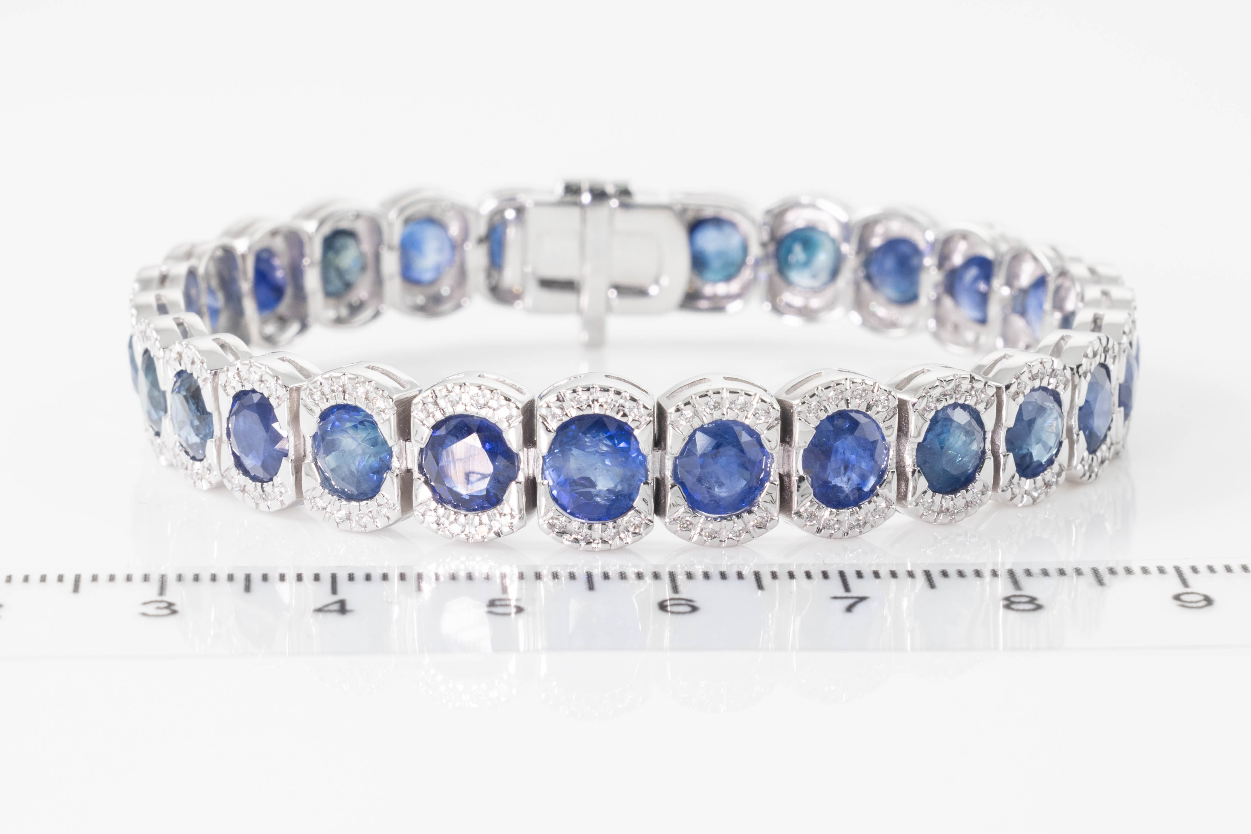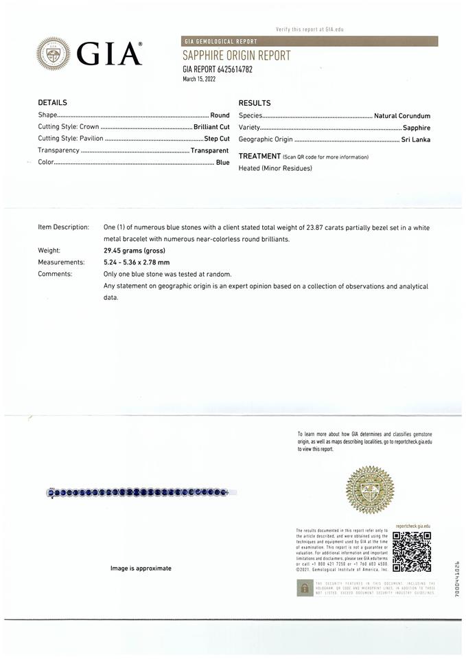 Sapphire and Diamond bracelet with round Ceylon blue Sapphires totalling approximately 23.87ct (with GIA Sapphire Origin Report #6425614782) and round Diamonds totalling approximately 1.13cts (Estimated grading G-H SI). 14ct white gold. Length 18.5cm. Weight 29.4g. (Pre-owned)