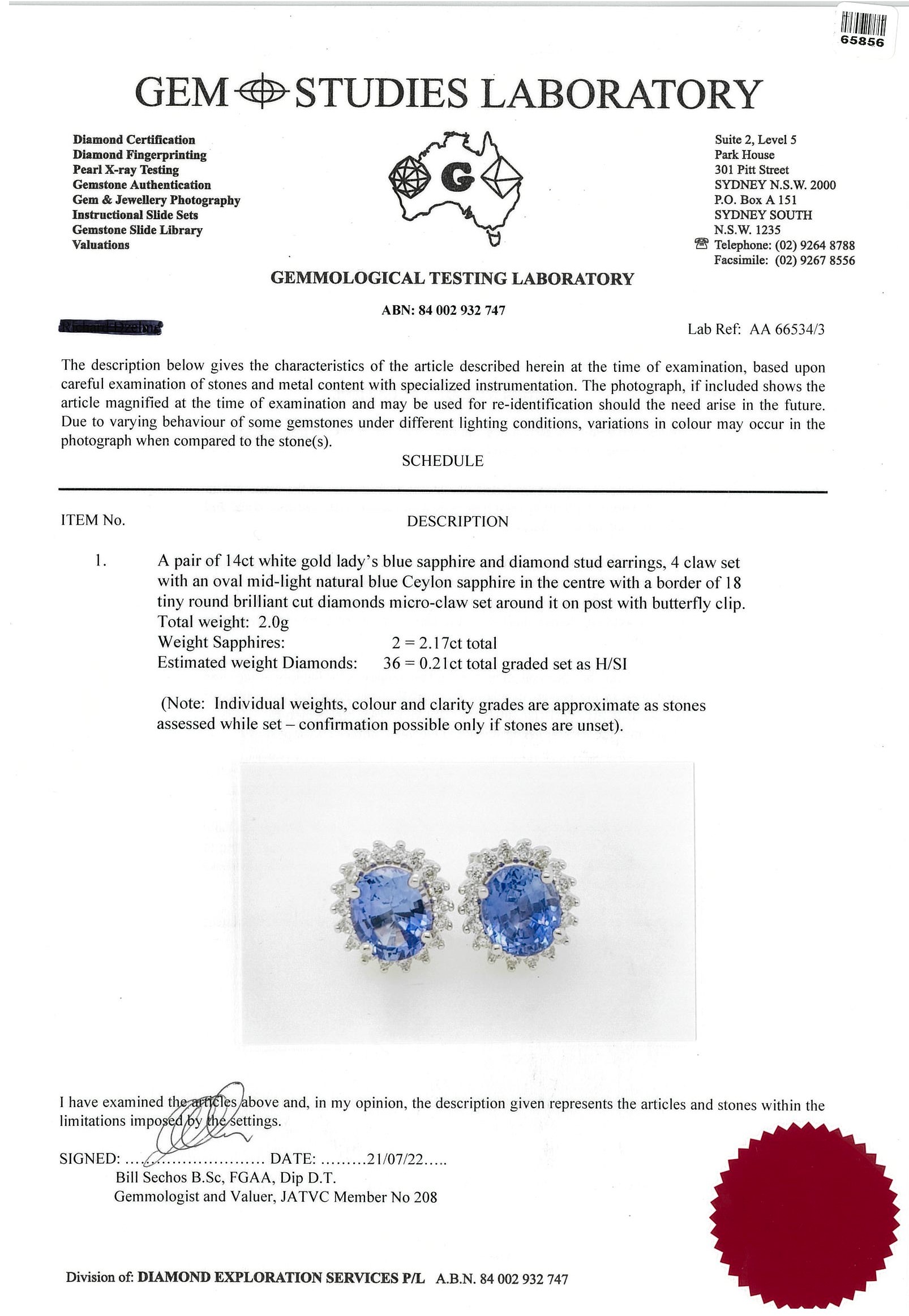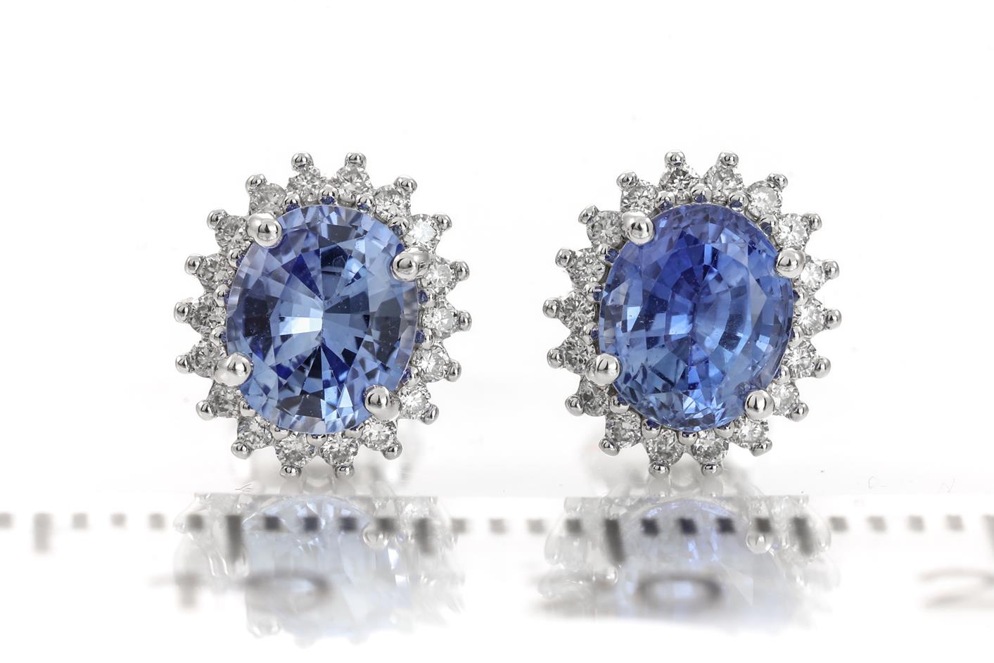 Sapphire and Diamond earrings with oval cut blue Ceylon Sapphires totalling 2.17cts and round Diamonds totalling 0.21cts. 14ct white gold. Weight: 2.0g. With GSL Description Certificate #AA66534/3. (Pre-owned)