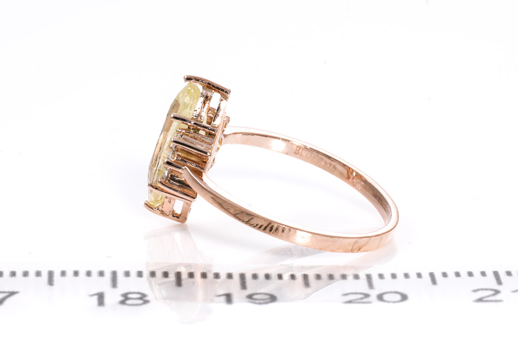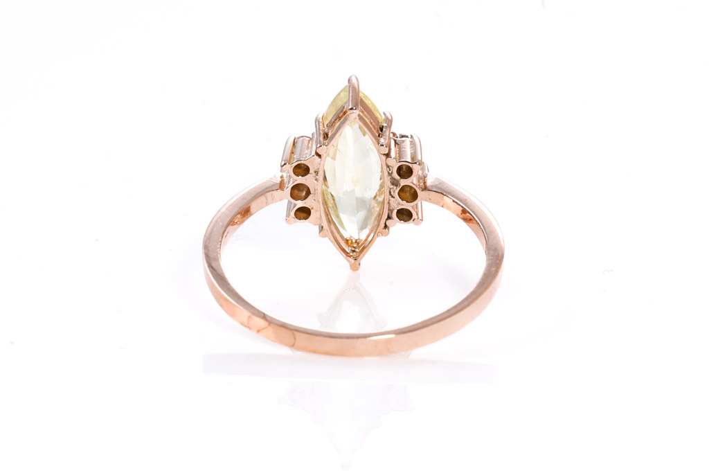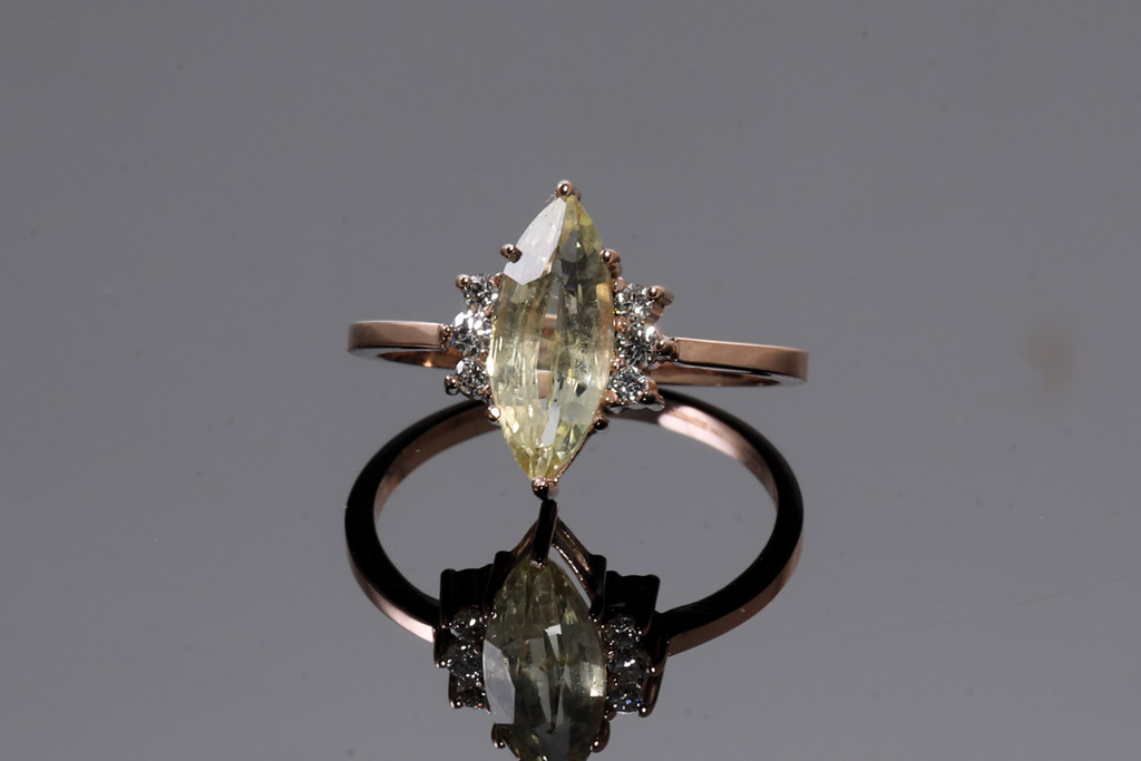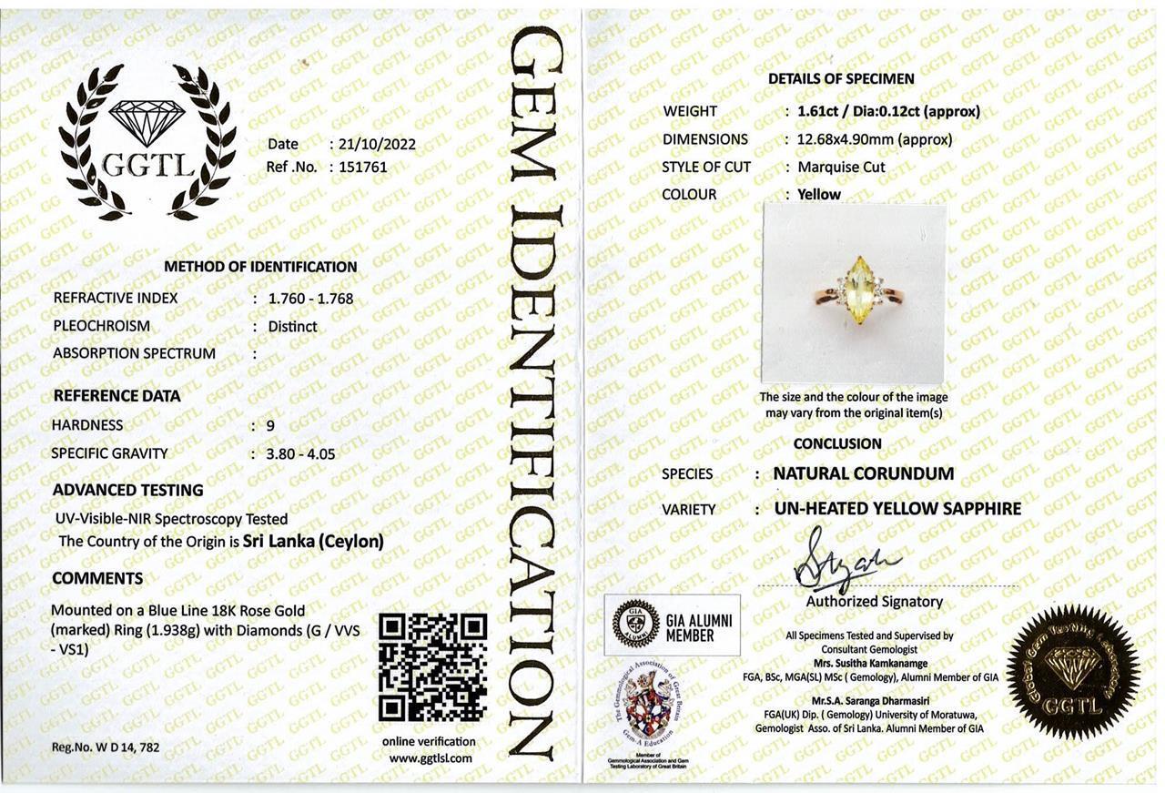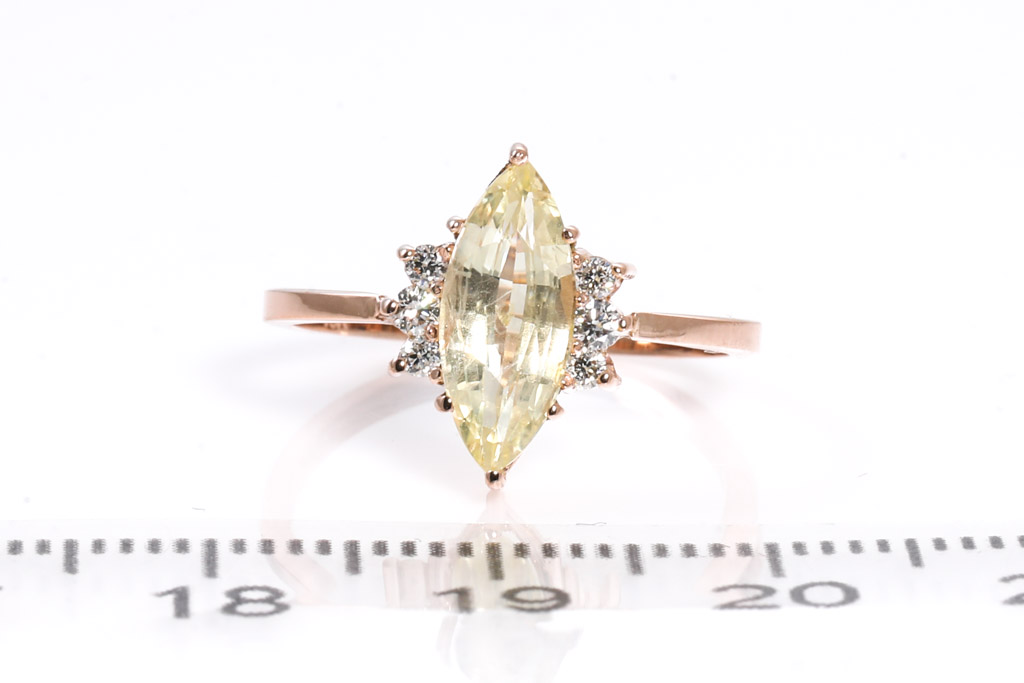 Sapphire and Diamond ring with marquis cut un-heated Ceylon yellow Sapphire of 1.61ct and round Diamonds totalling approximately 0.12cts. 18ct rose gold. Ring size J1/2. Weight 1.9g. With Gem report #151761. (As New)