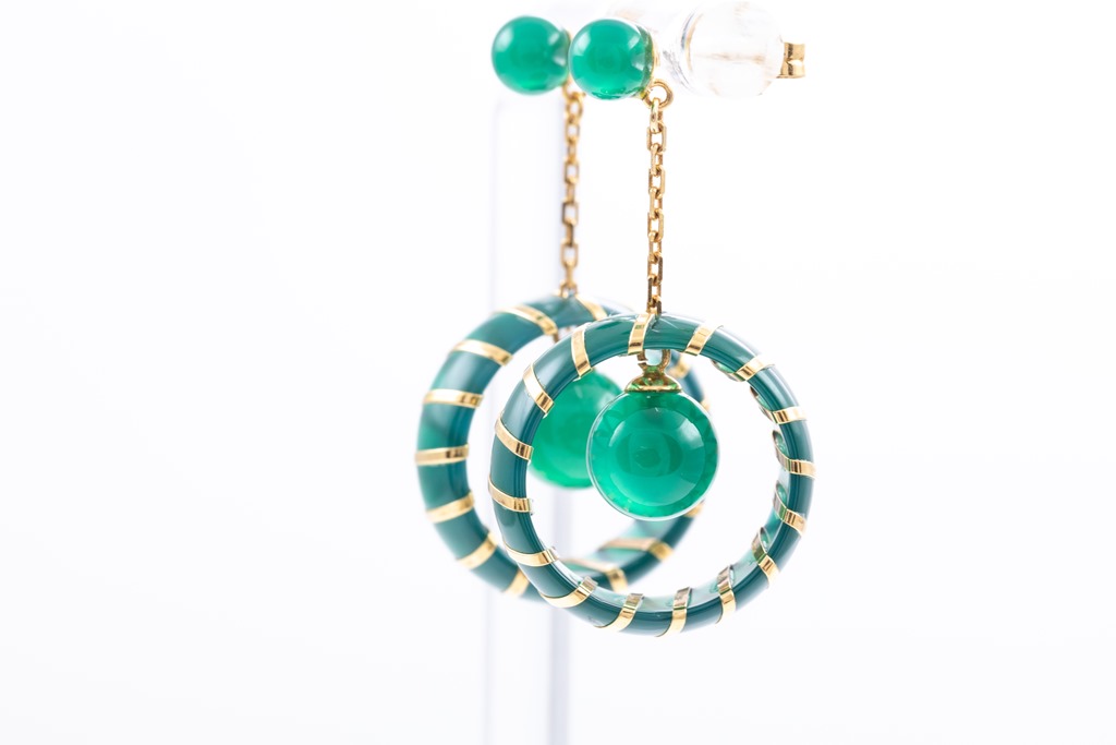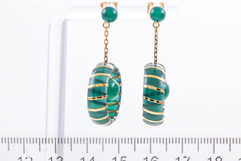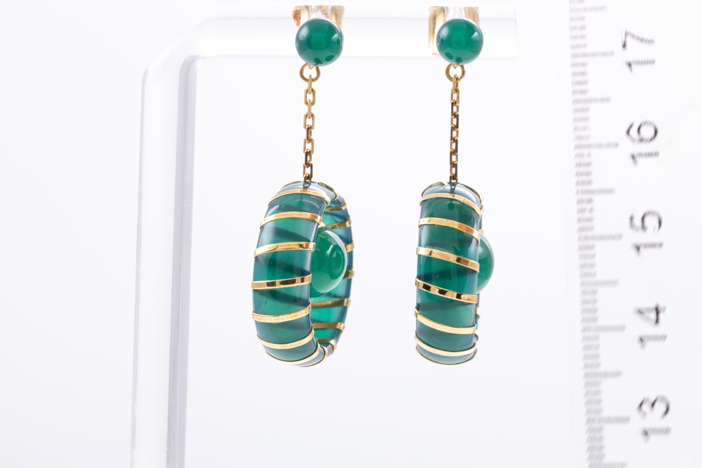 Chalcedony earrings with bead and circle feature. 18ct yellow gold. Weight: 6.2g. (Pre-owned)