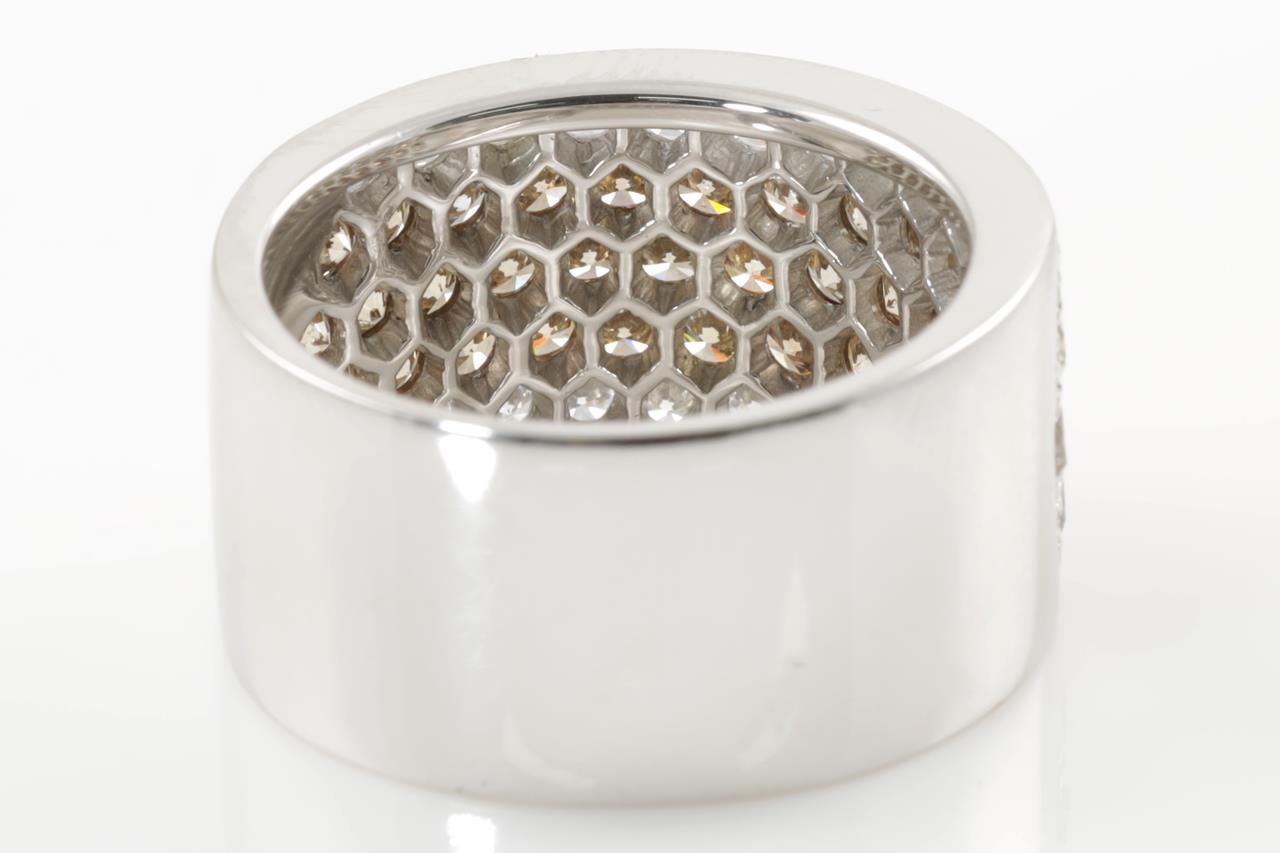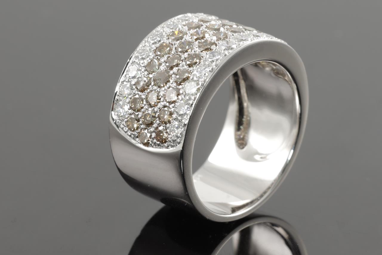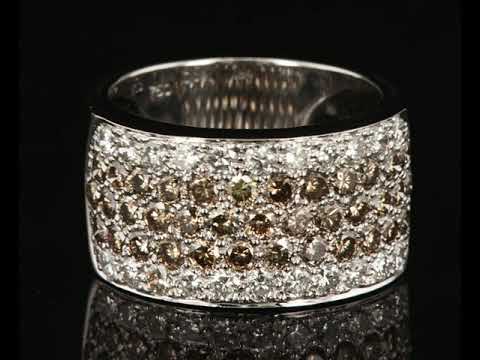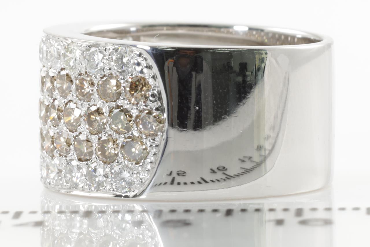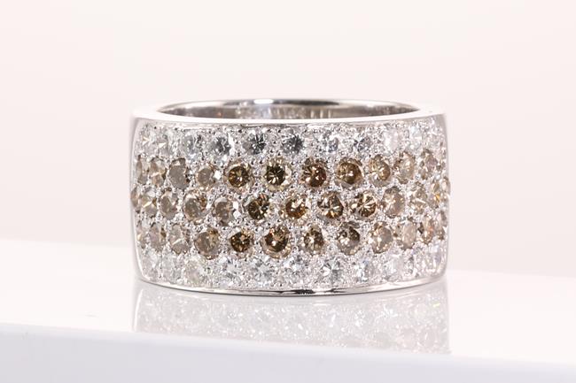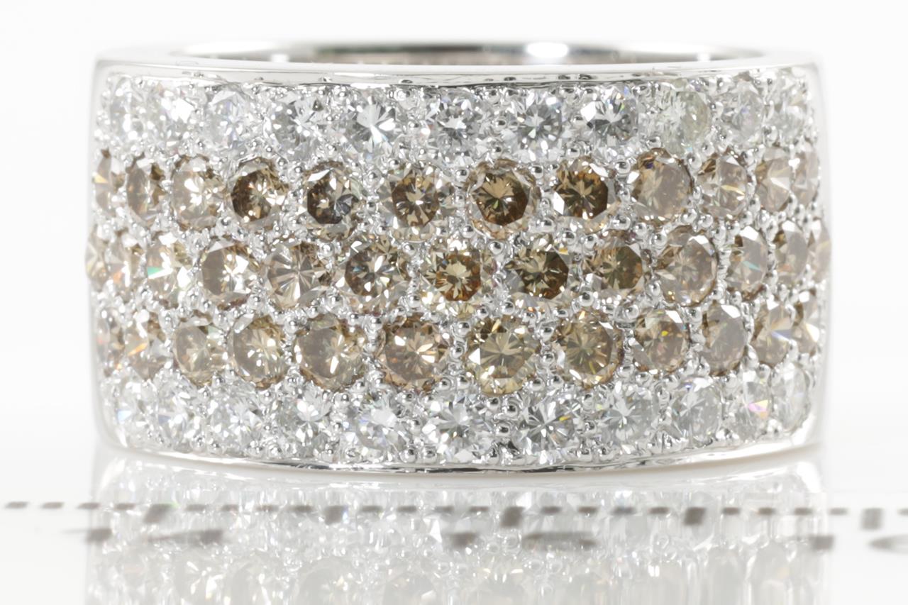 Diamond 5 row ring with round Natural Champagne Diamonds totalling 1.84cts (Estimated grading: C VS-SI) and white Diamonds totalling 0.91cts (Estimated grading: H VS-SI). 18ct white gold. Ring size O - ring resizing is not recommended. Weight: 11.1g (Pre-owned)