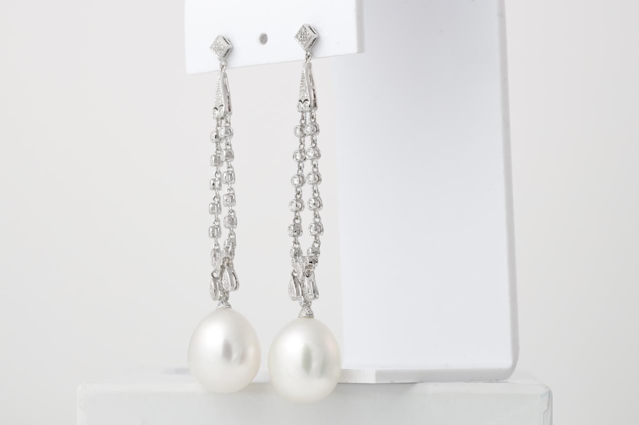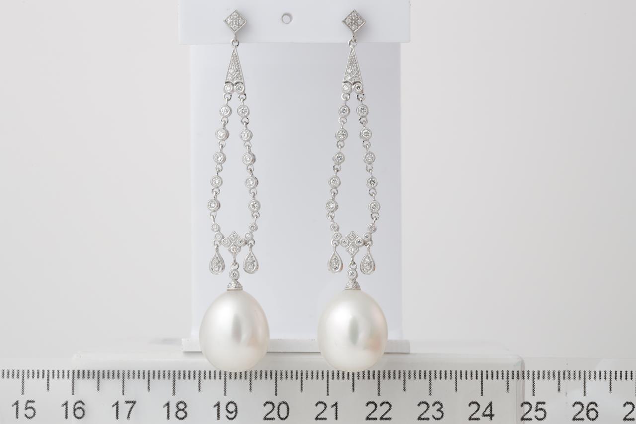 Diamond Earrings, Chandelier Style with white oval South Sea Pearls of 13mm and round Diamonds totalling approximately 0.66cts (Estimated grading: G-H SI). 18ct white gold. Weight 15.5g. (As New)