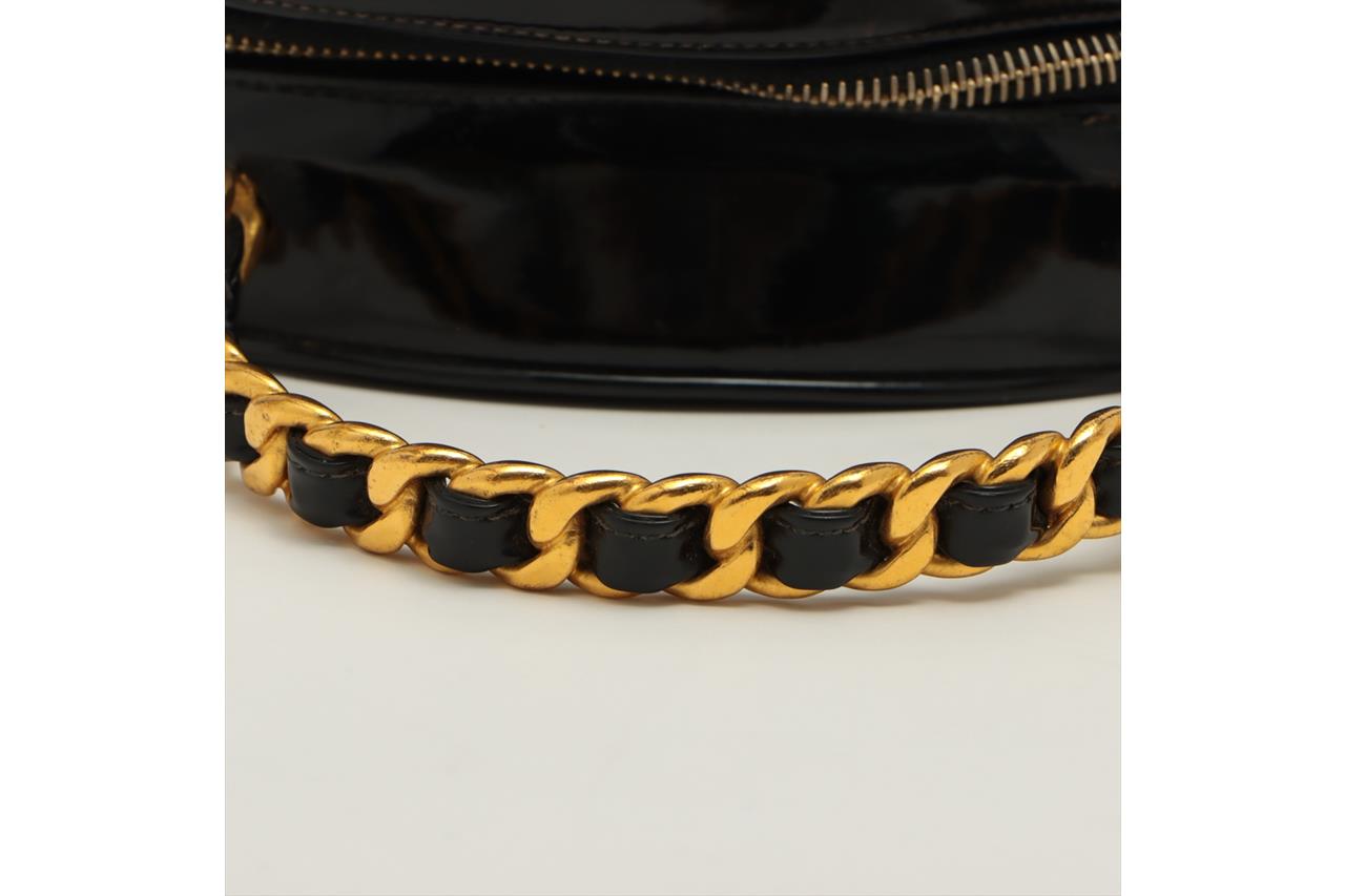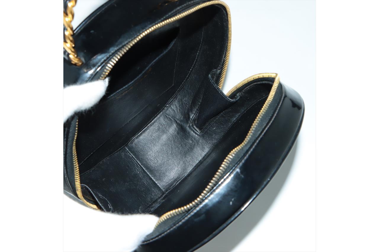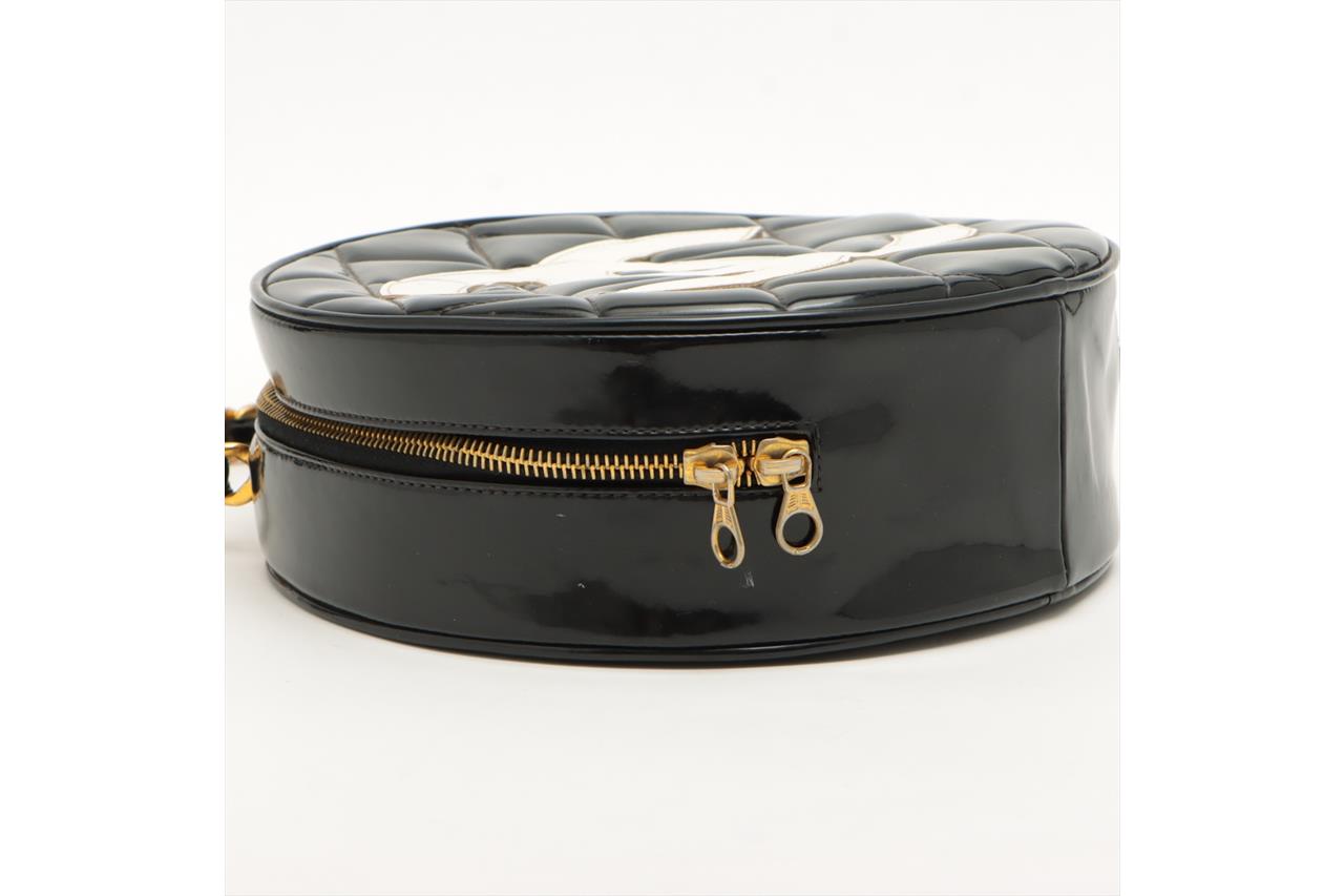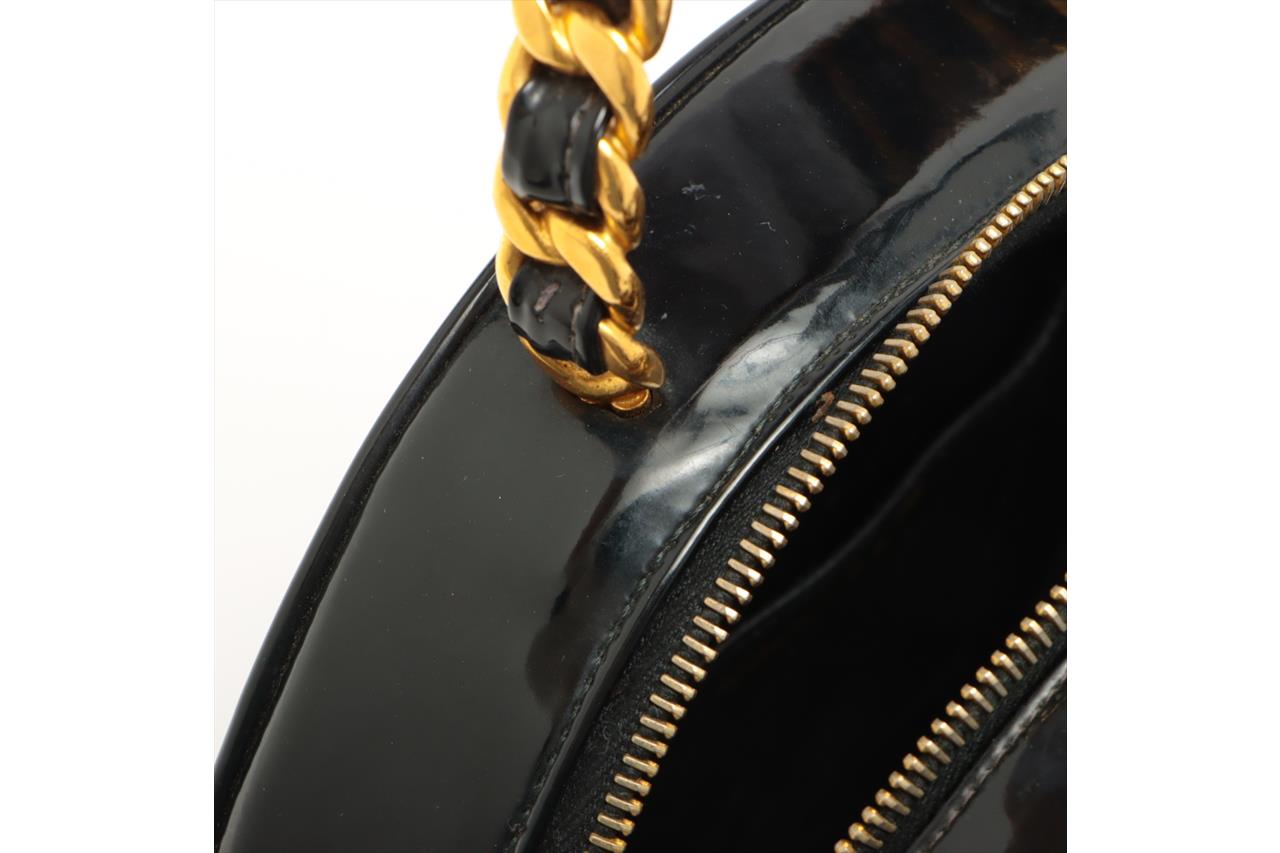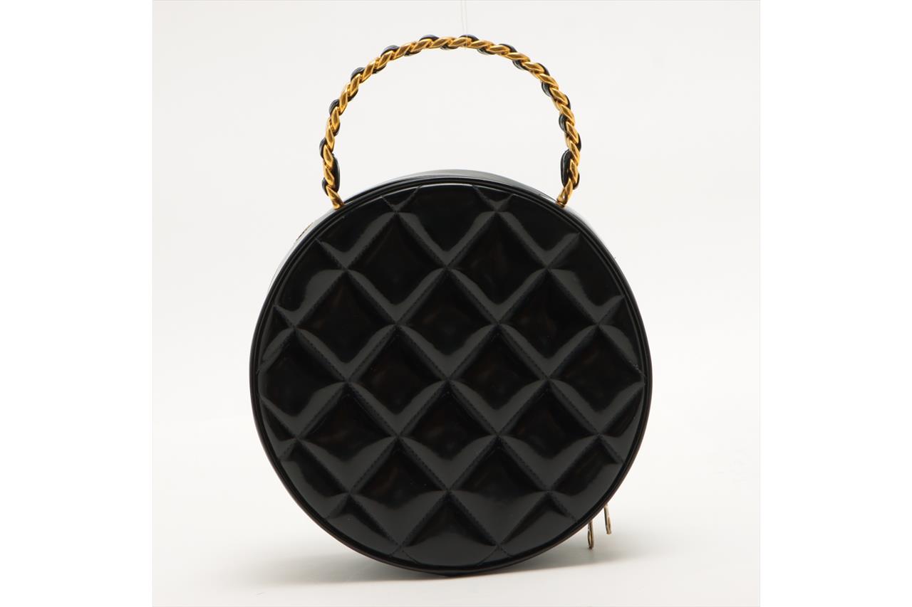 Chanel 1995 CC Diamond-Quilted Round Vanity Bag. Featuring in black diamond-quilted patent leather, gold-toned hardware, interlocking CC logo on front, leather & chain link top handle, one main compartment with single slip pocket, two-way zip closure. Approximate dimensions: 22cm(L) x 22cm(H) x 8cm(D), 8cm handle height. Note: the serial sticker was peeled off. Accompanied by Chanel certificate card and dust bag. With Entrupy Certificate of Authenticity. (Pre-owned)