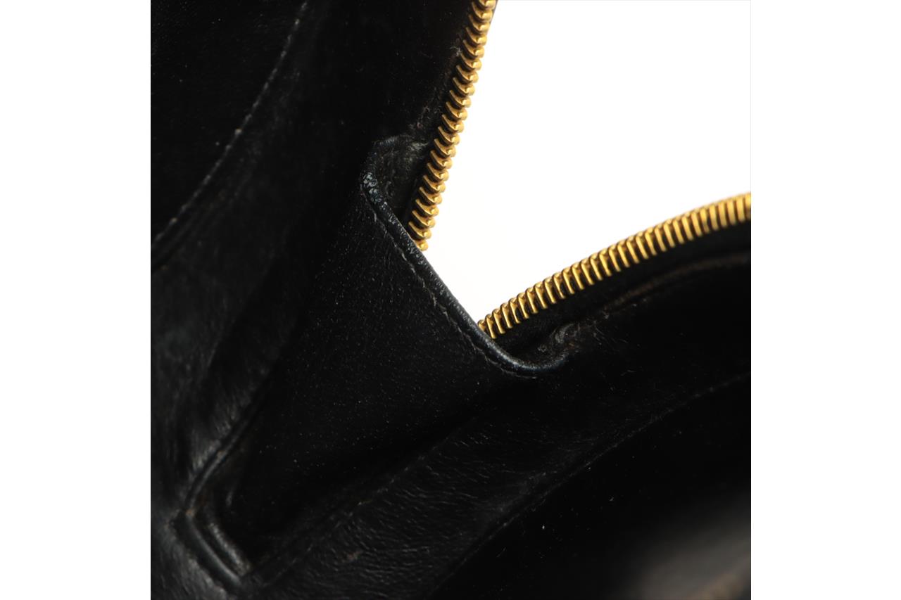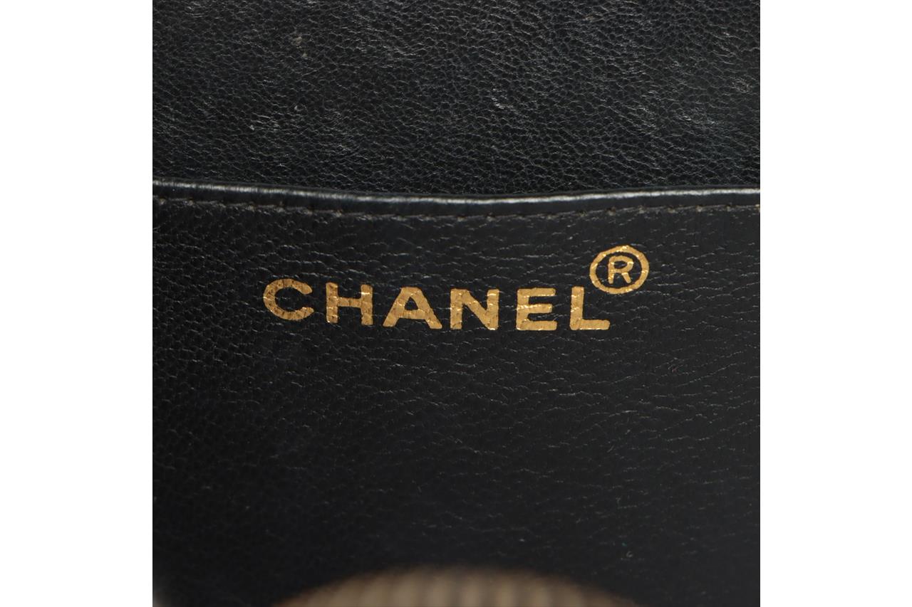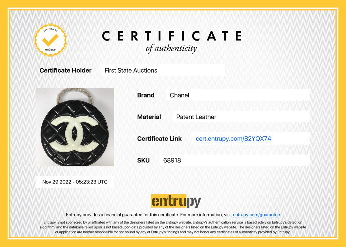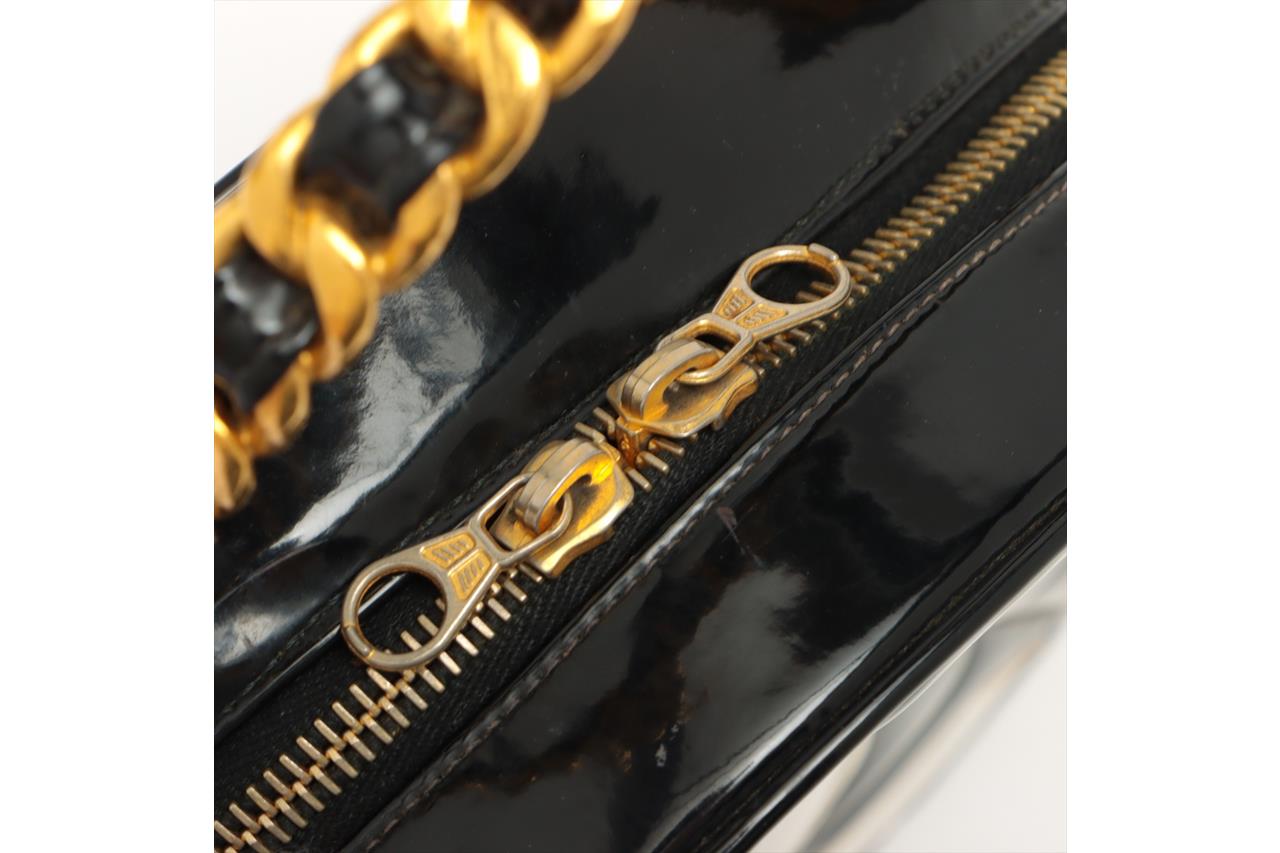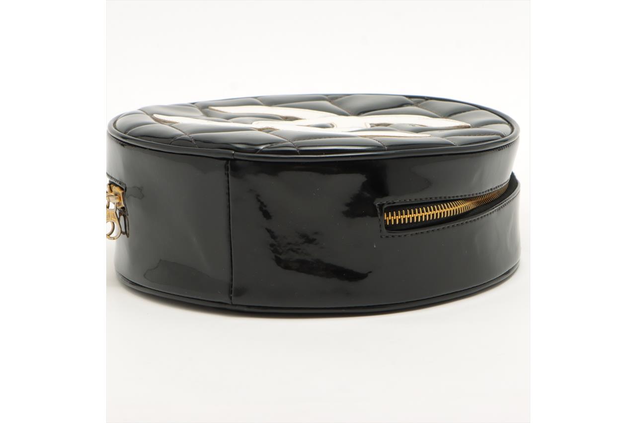 Chanel 1995 CC Diamond-Quilted Round Vanity Bag. Featuring in black diamond-quilted patent leather, gold-toned hardware, interlocking CC logo on front, leather & chain link top handle, one main compartment with single slip pocket, two-way zip closure. Approximate dimensions: 22cm(L) x 22cm(H) x 8cm(D), 8cm handle height. Note: the serial sticker was peeled off. Accompanied by Chanel certificate card and dust bag. With Entrupy Certificate of Authenticity. (Pre-owned)