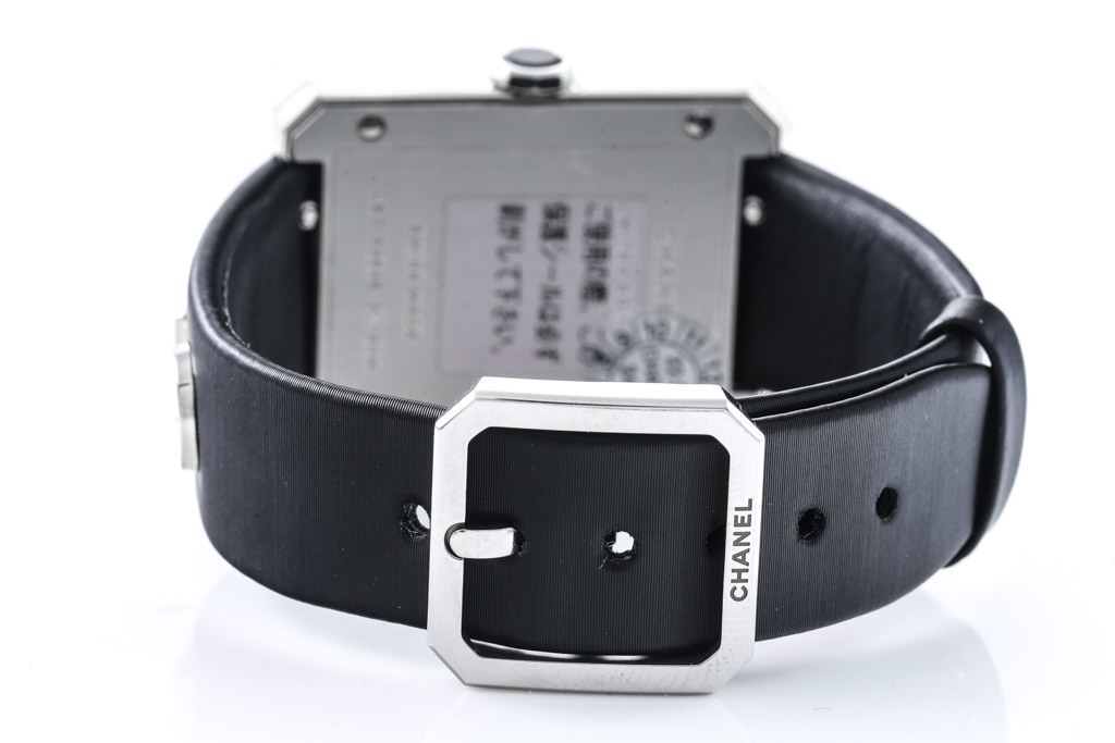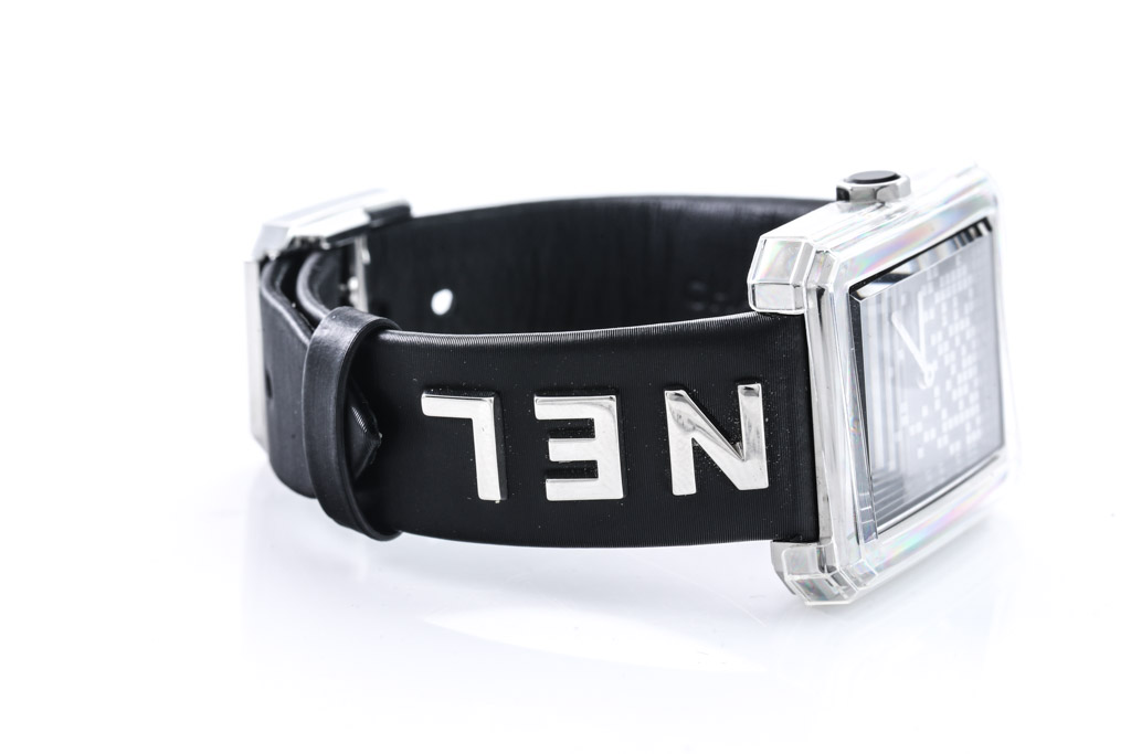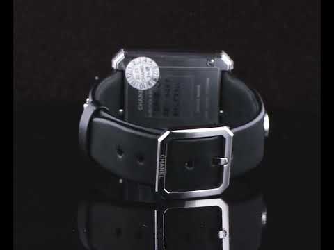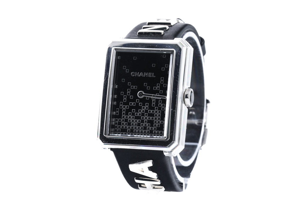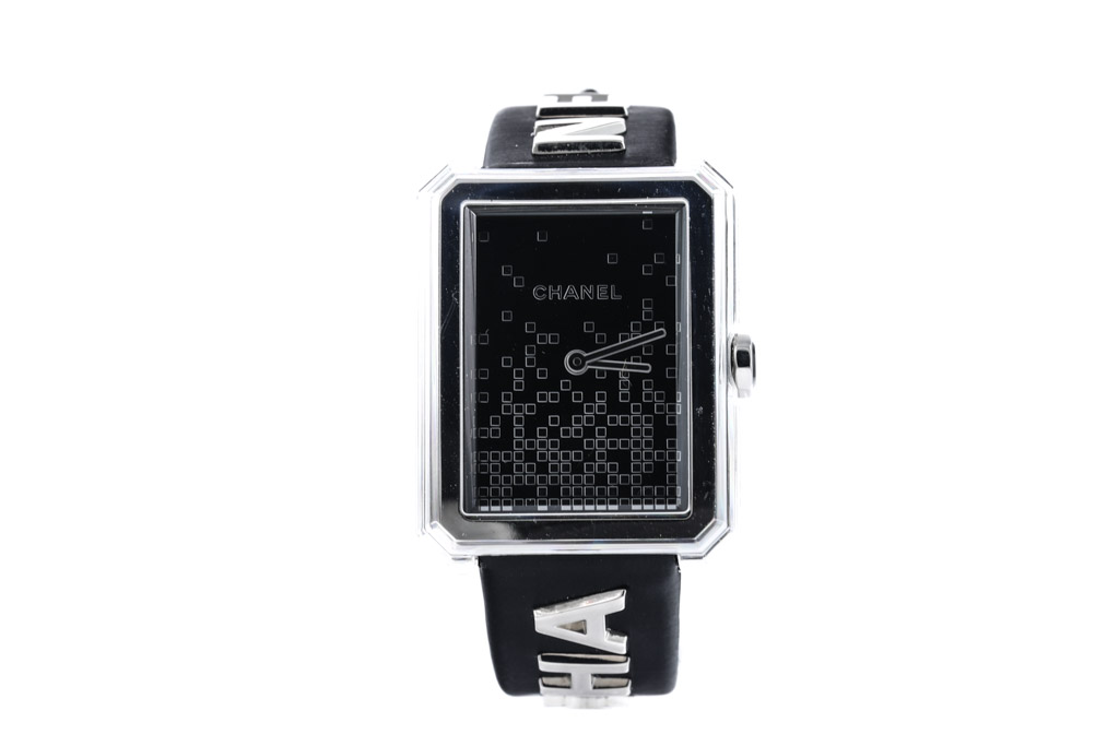 Chanel Boyfriend Limited Edition stainless steel quartz ladies watch. Black pixel patterned dial, case diameter: 34.6mm x 26.7mm, wrist length: 18cm, Swiss made. Ref# H7470. With Chanel black leather strap and buckle. With Certificate of Authenticity. 3 month FSA warranty. (Pre-owned)