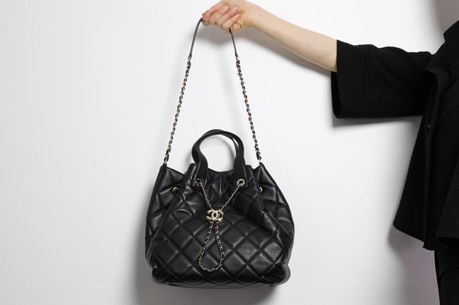 Chanel Bucket Drawstring Hobo Bag in Quilted Matelassé Black Leather. Gold-tone hardware. Approximate dimensions: 26cm (L) x 25cm (H) x 18cm (D). With approximate 17cm and 53cm handle drop. With Chanel dust bag and Entrupy Certificate of Authenticity. (Pre-owned)