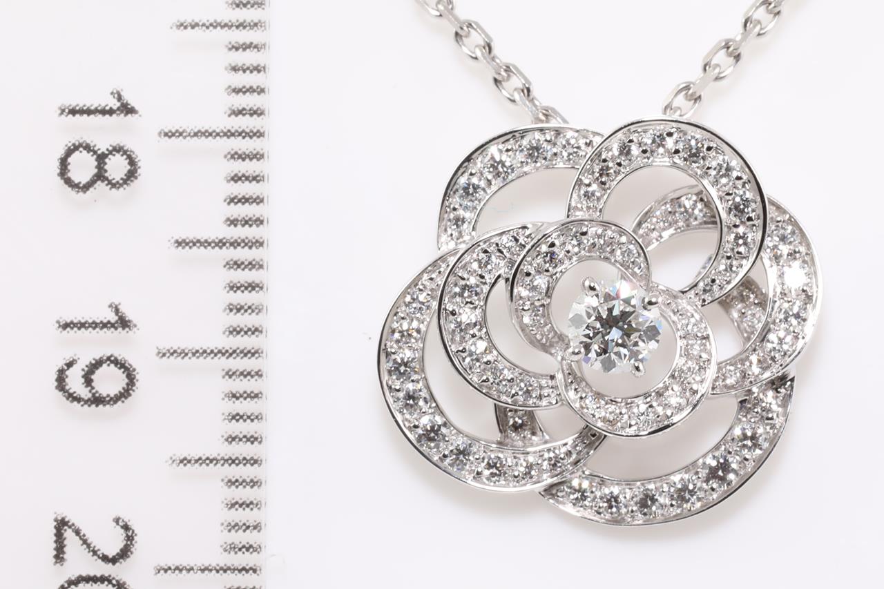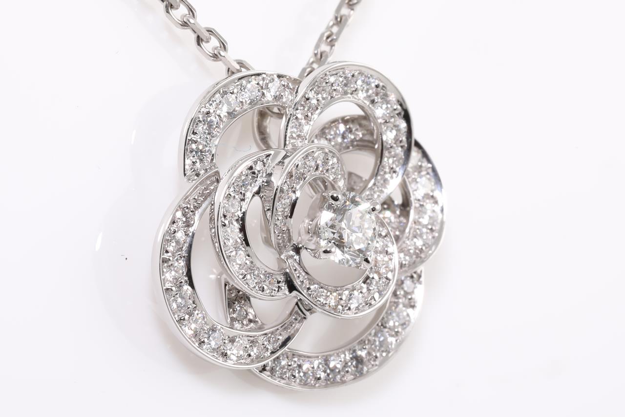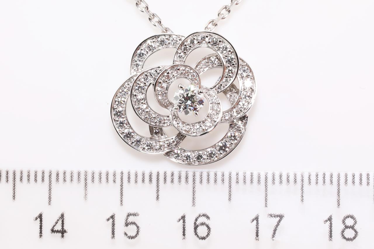 Chanel Fil de Camelia necklace small version with Diamonds totalling approximately 65cts (Estimated grading: F VS). Design ref# J2580. 18ct white gold with adjustable 45cm chain (note no brand stamp on chain). Weight: 7.8g. With certificate #414449. (Pre-owned)