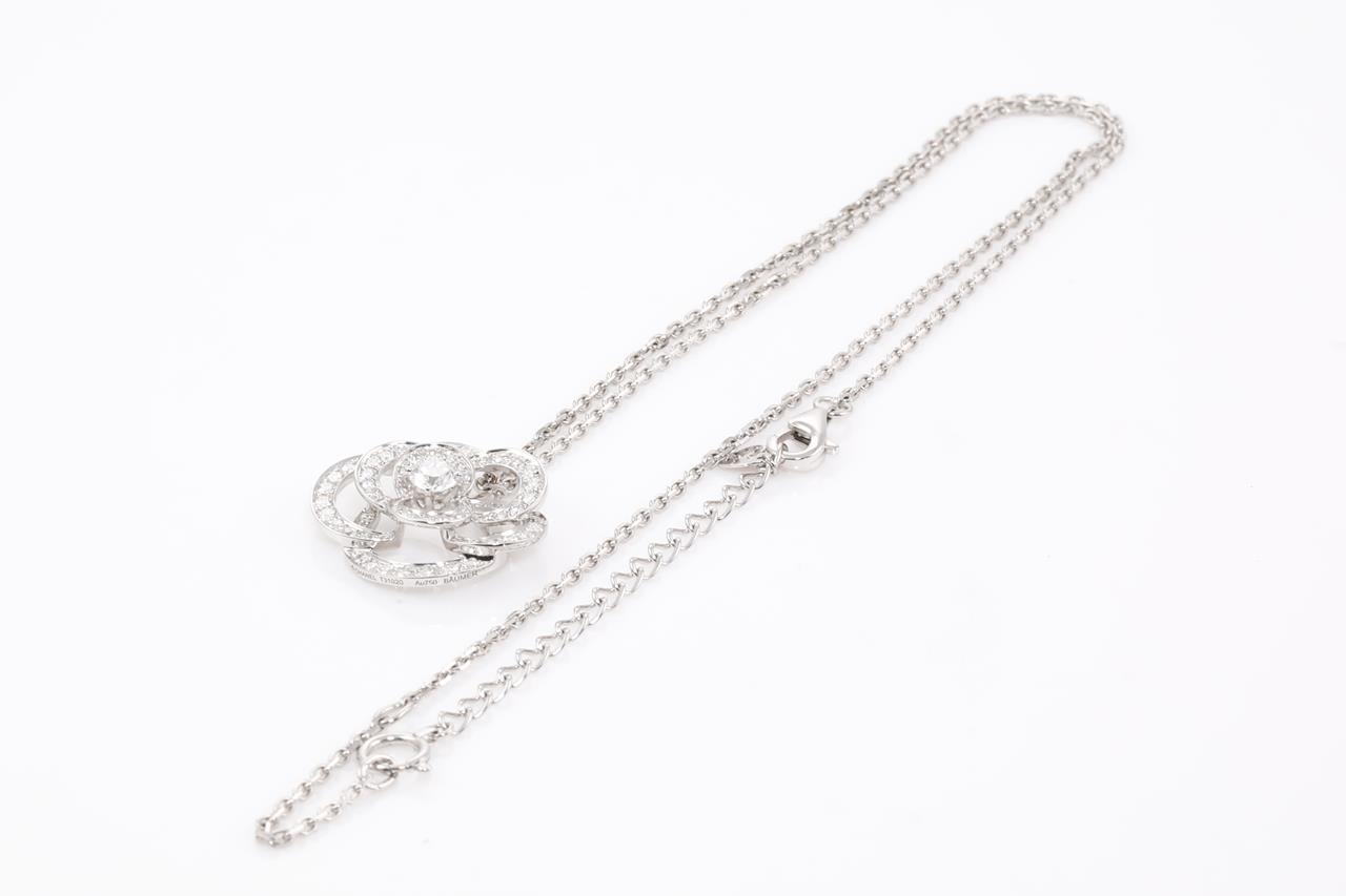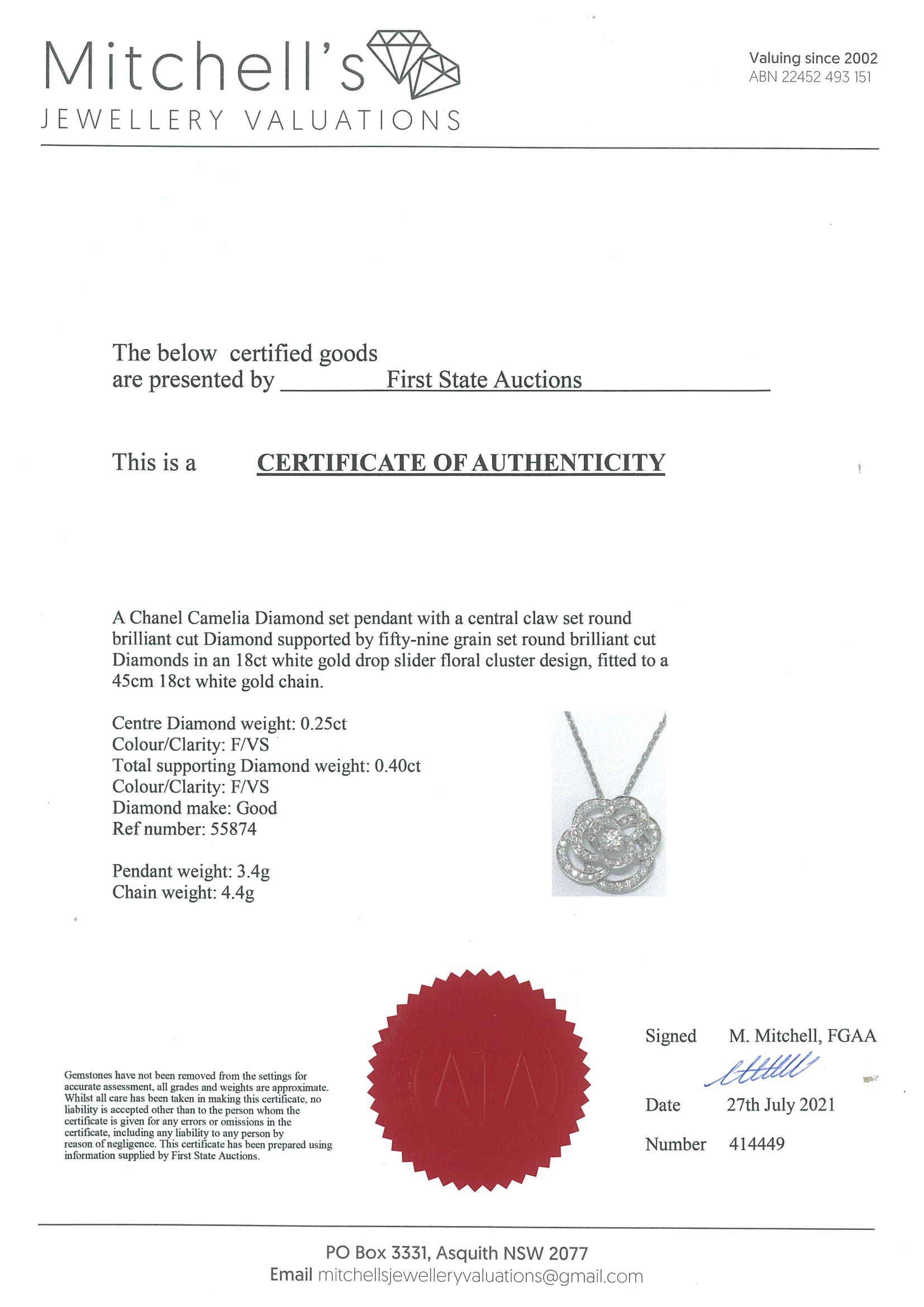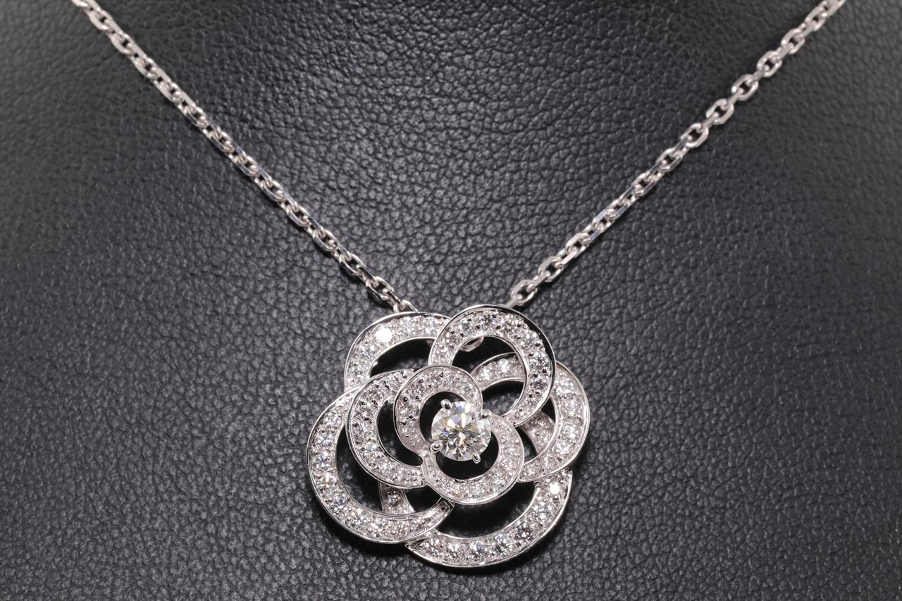 Chanel Fil de Camelia necklace small version with Diamonds totalling approximately 65cts (Estimated grading: F VS). Design ref# J2580. 18ct white gold with adjustable 45cm chain (note no brand stamp on chain). Weight: 7.8g. With certificate #414449. (Pre-owned)