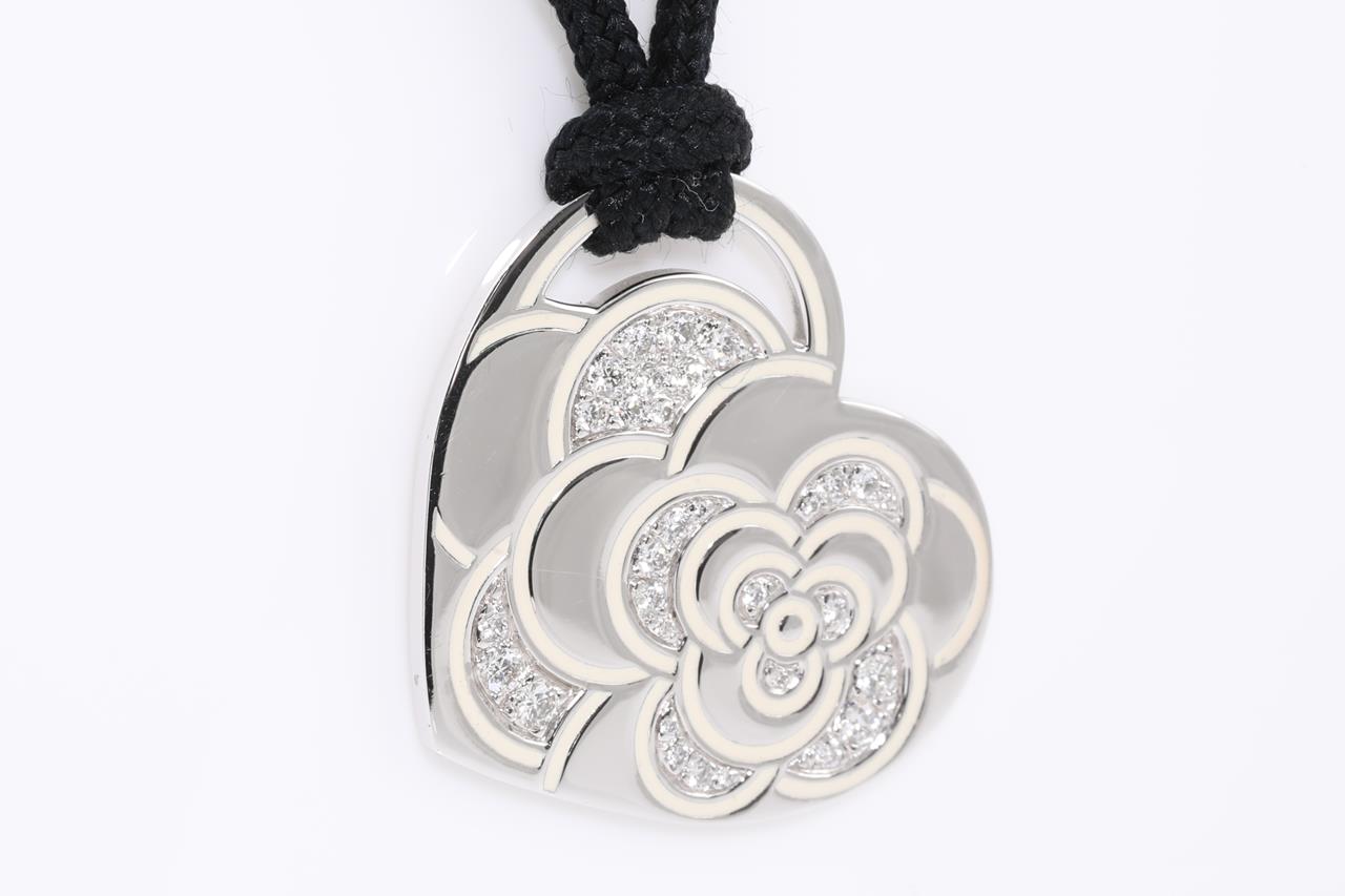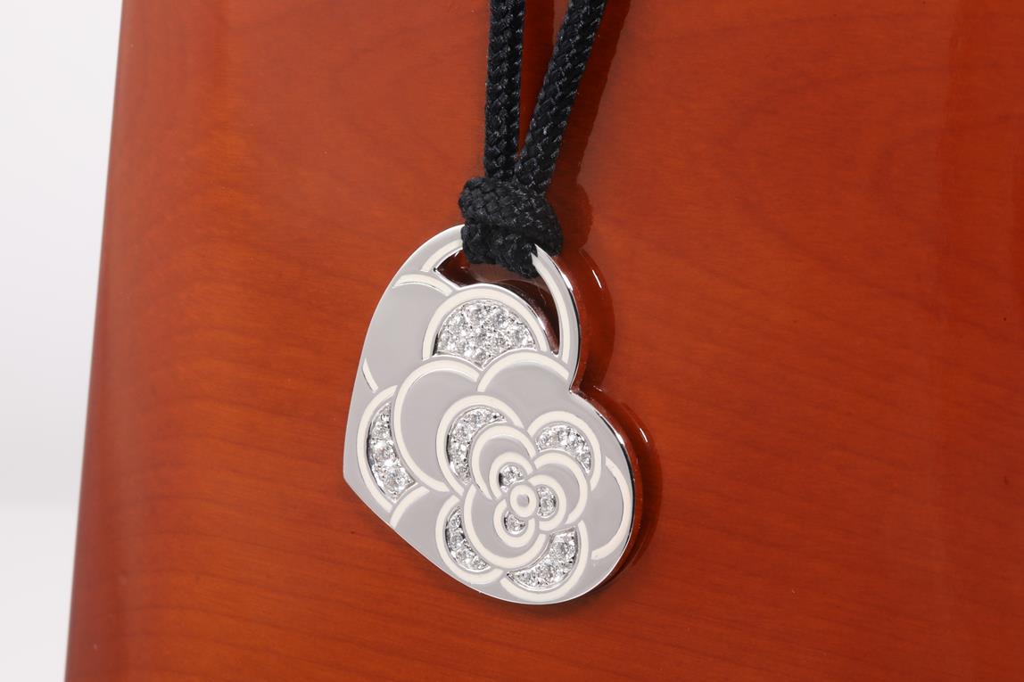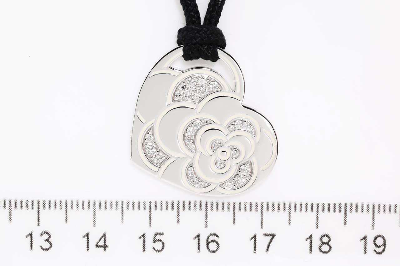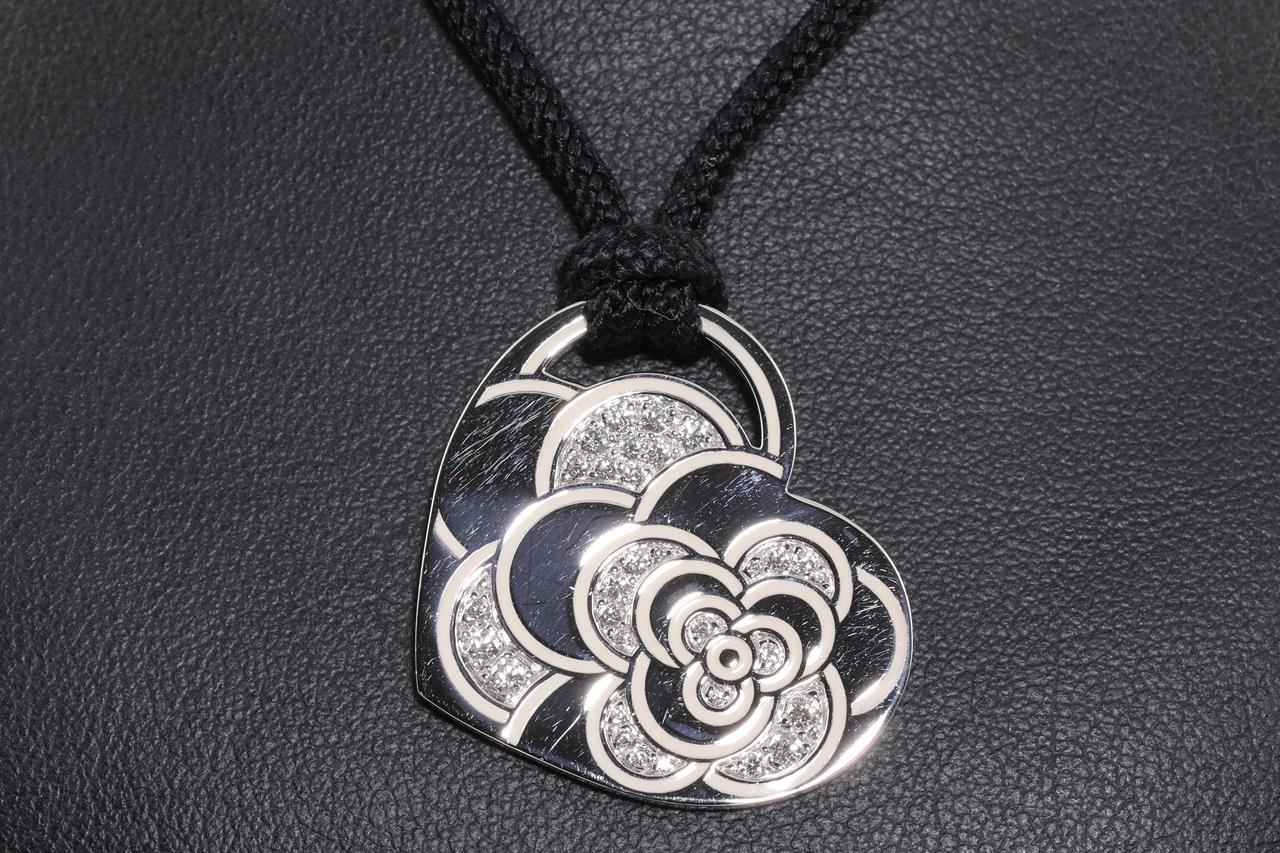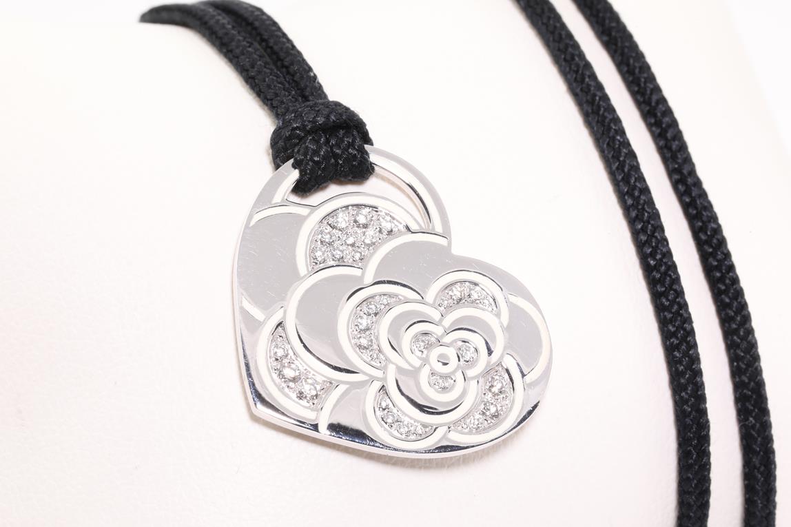 Chanel Camelia Heart Diamond pendant with 30 round Diamonds totalling 0.15cts. 18ct white gold with black cord. Weight: 11.7g. With certificate #414593. (Pre-owned)