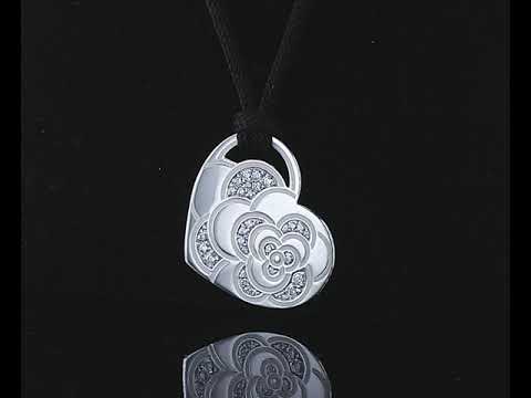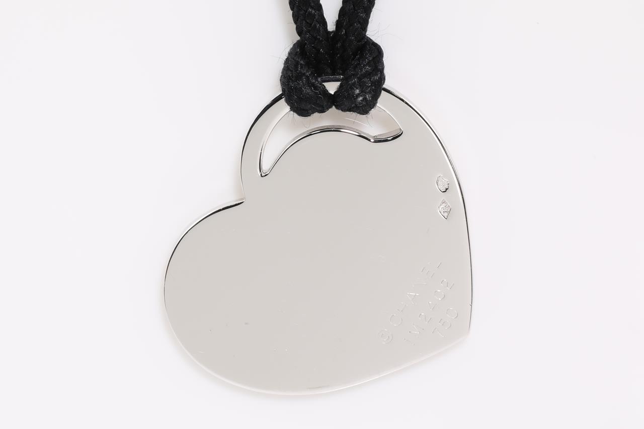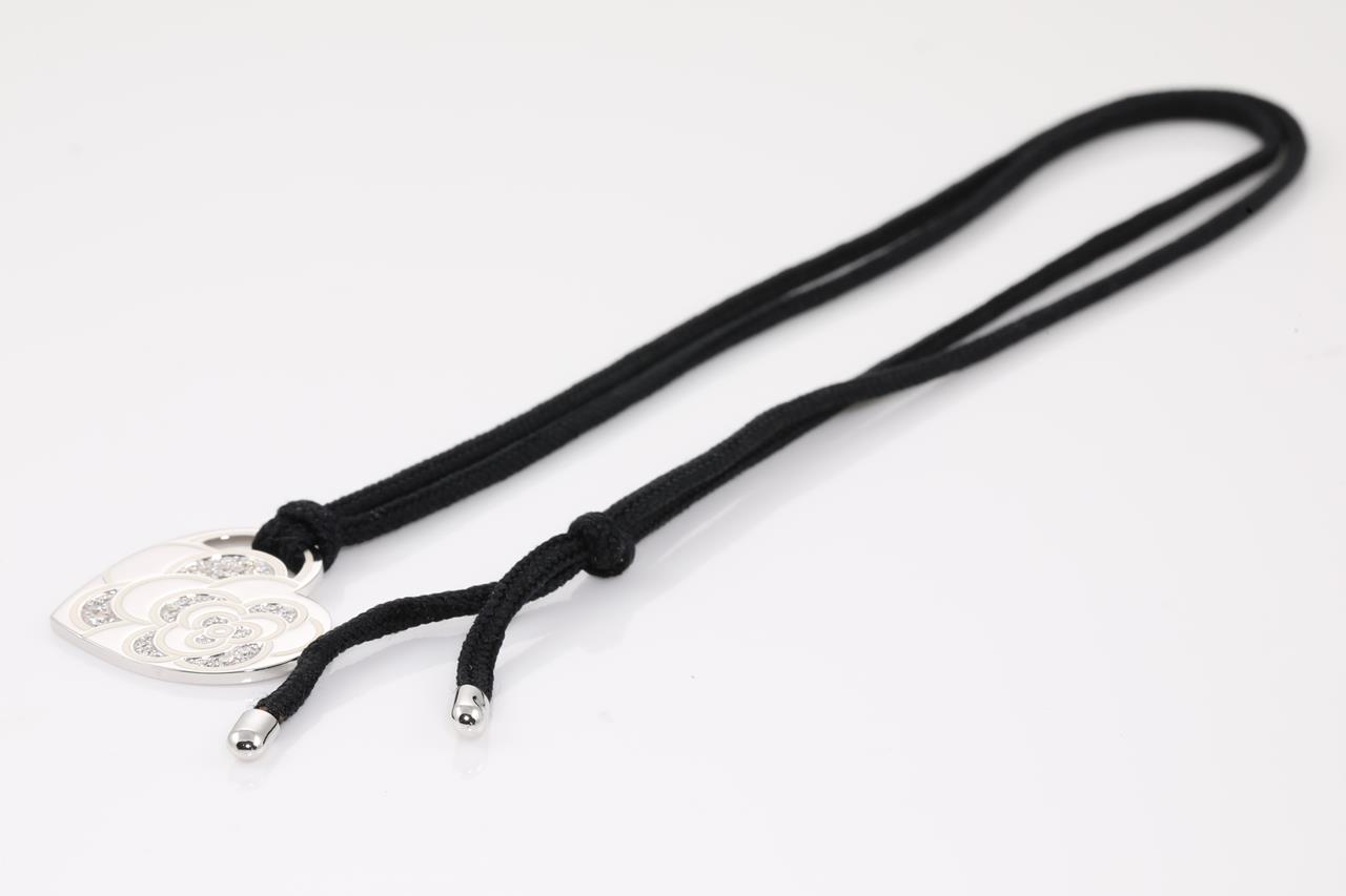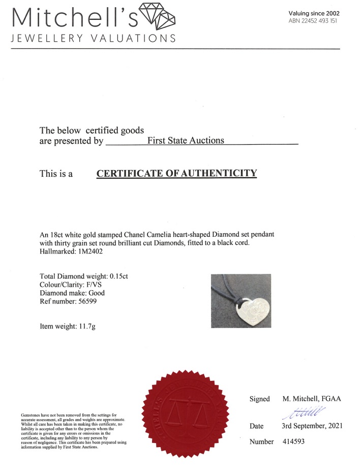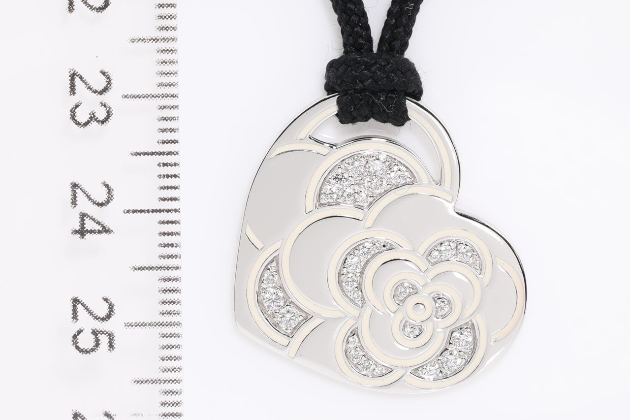 Chanel Camelia Heart Diamond pendant with 30 round Diamonds totalling 0.15cts. 18ct white gold with black cord. Weight: 11.7g. With certificate #414593. (Pre-owned)