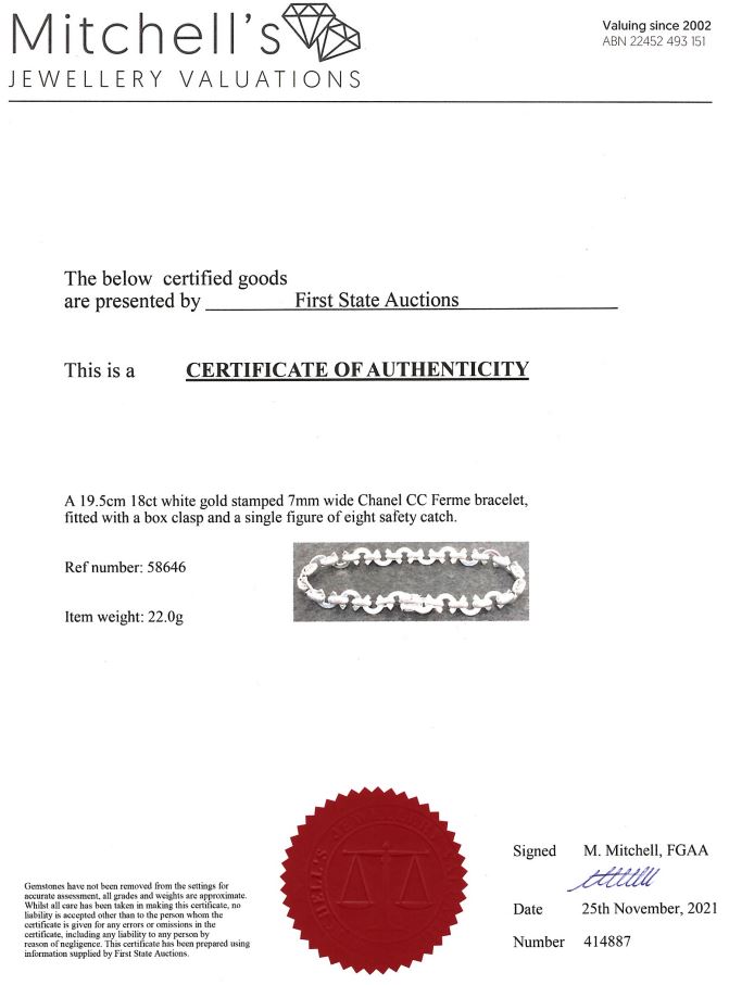 Chanel CC Ferme bracelet. 18ct white gold. Length: 19.5cm. Weight: 22g. With Certificate #414887. (Pre-owned)