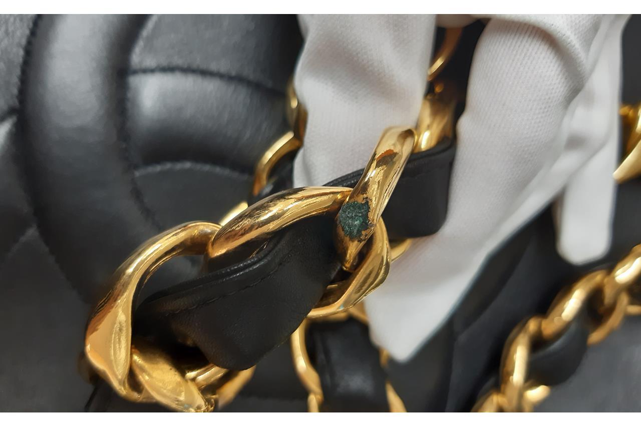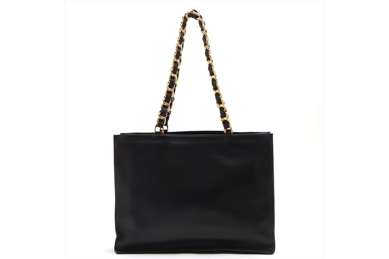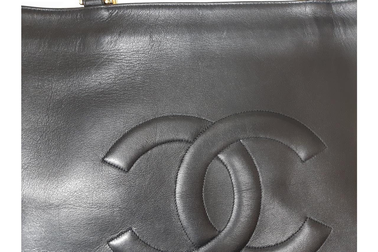 Chanel CC Jumbo Tote Bag in Black Ram Leather. Featuring gold-tone hardware, signature interlocking CC logo, open top, interior zip pocket, and leather-chain handles. Approximate dimensions: 41.5cm (L) x 31.5cm (H) x 11cm (D), and 30cm handle drop. Accompanied by Chanel certificate card and dust bag. With Entrupy Certificate of Authenticity. (Pre-owned)