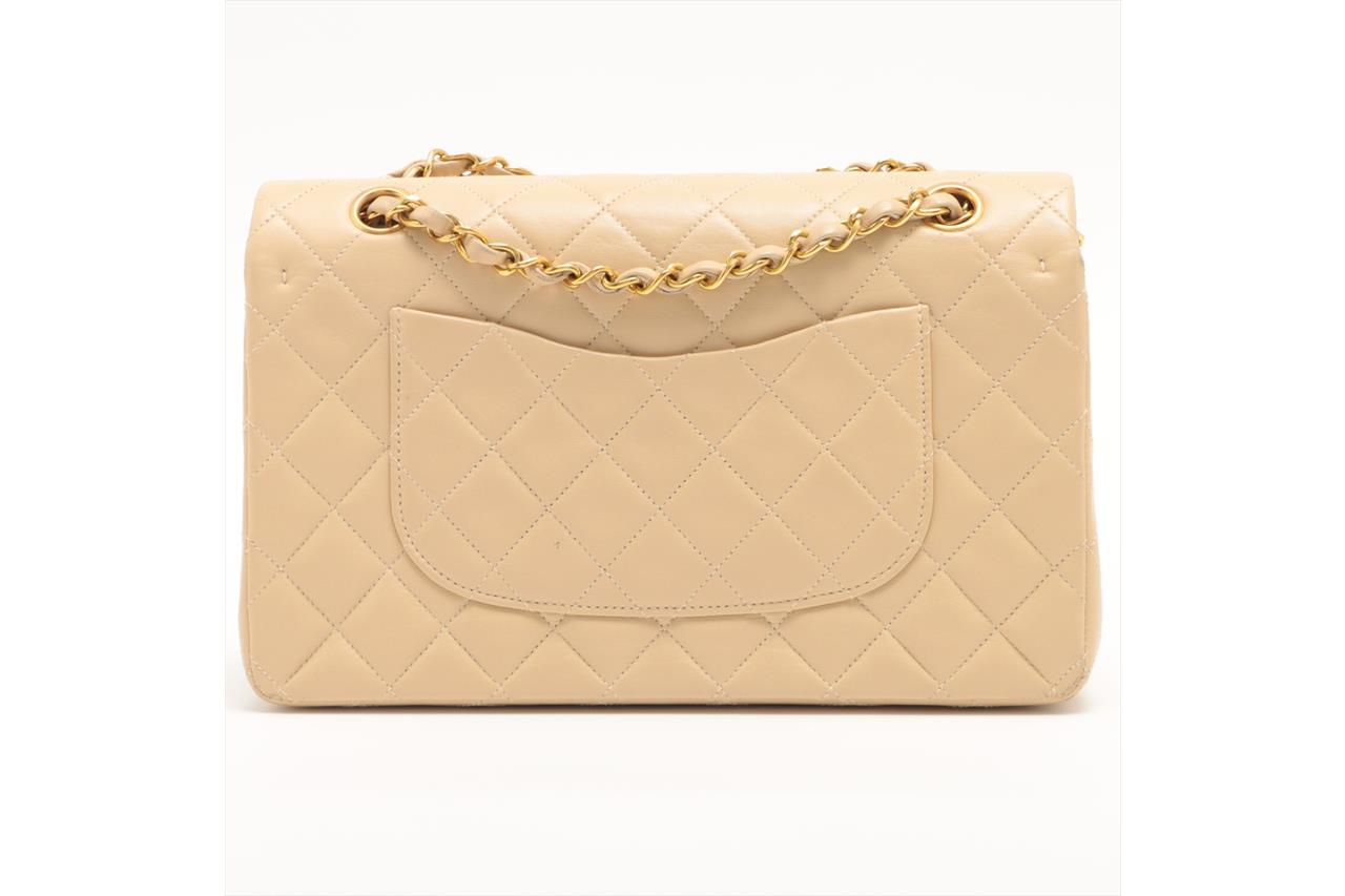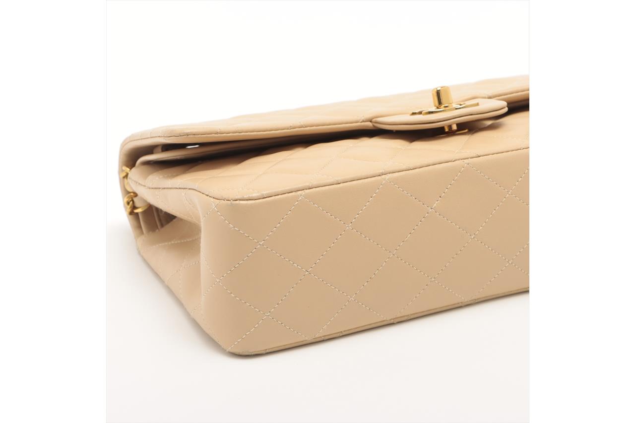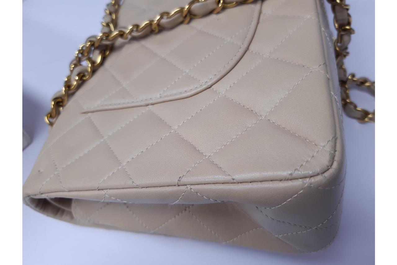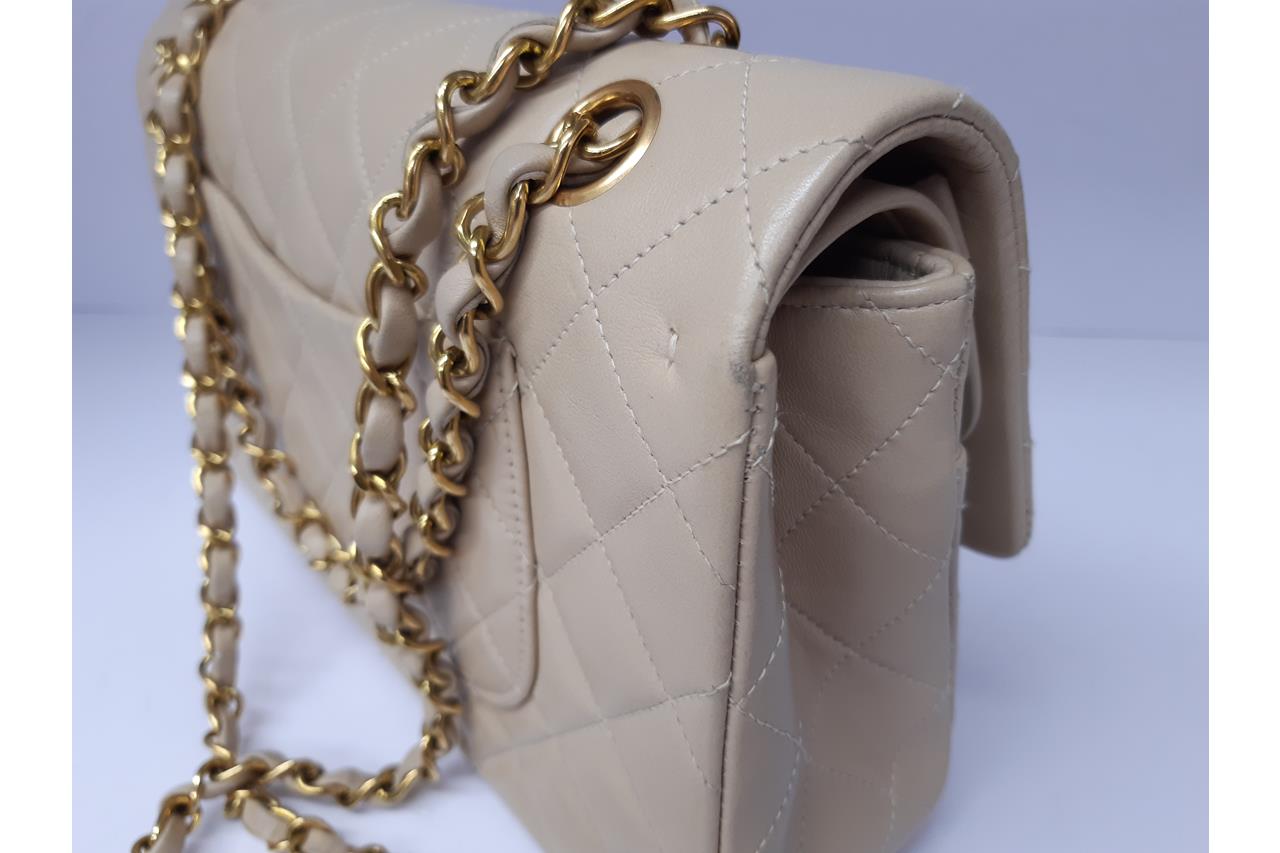 Chanel Classic Double Flap Bag. Featuring beige lambskin leather, gold-tone hardware, and double flaps with CC turn-lock on the front. Approximate dimensions: 25.5cm (L) x 16cm (H) x 6.5cm (D), and 42cm leather and chain strap. Accompanied by Chanel dust bag and box. With Entrupy Certificate of Authenticity. (Pre-owned)