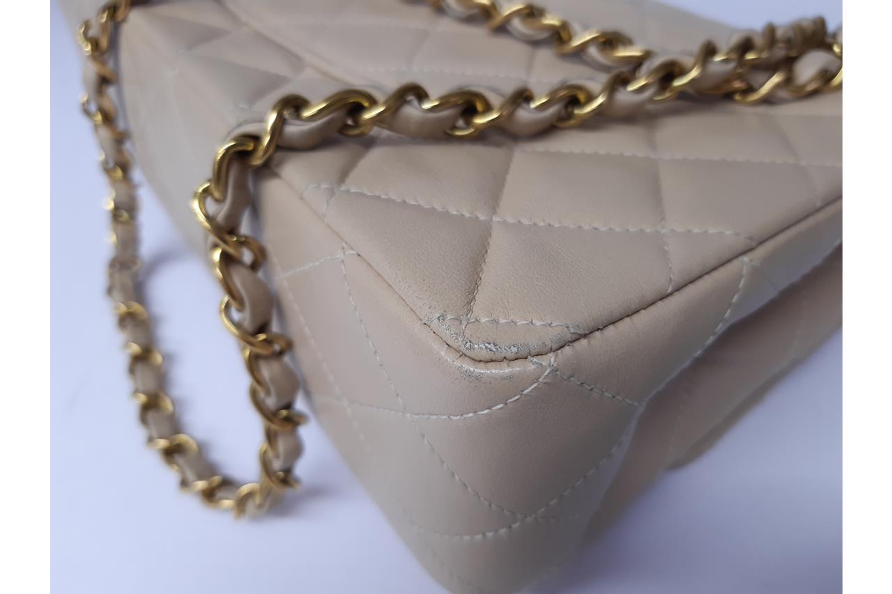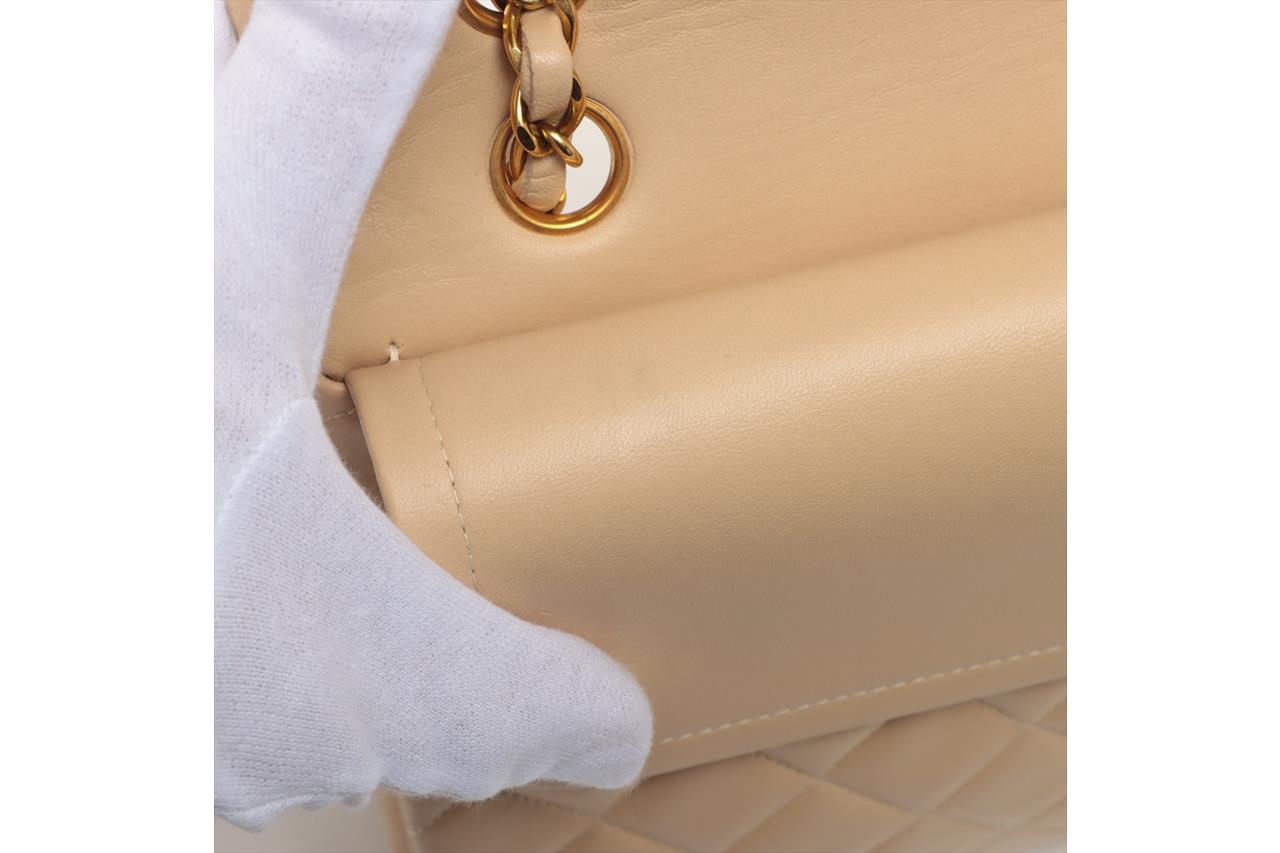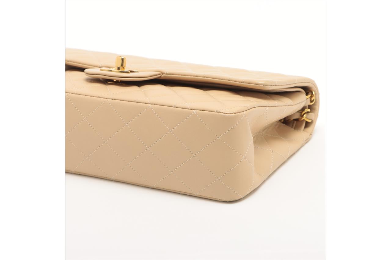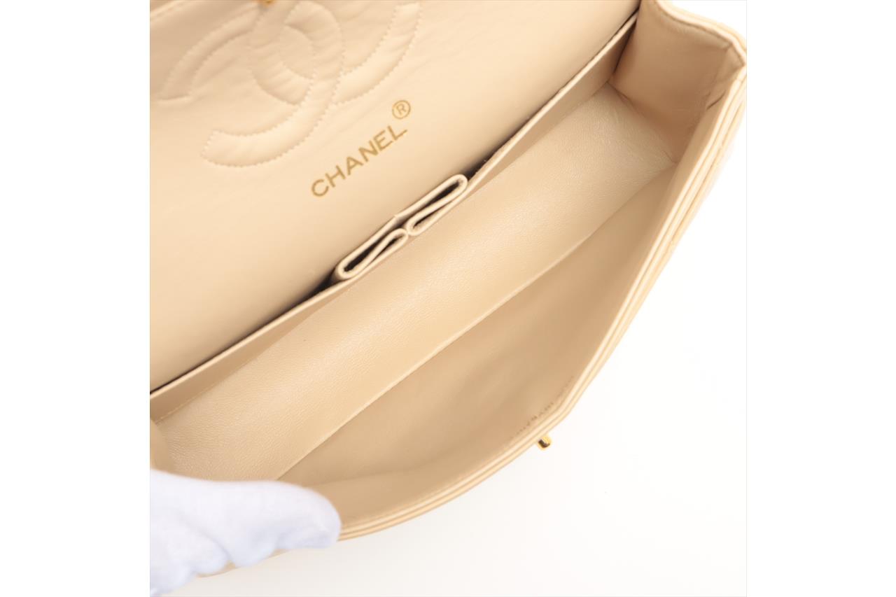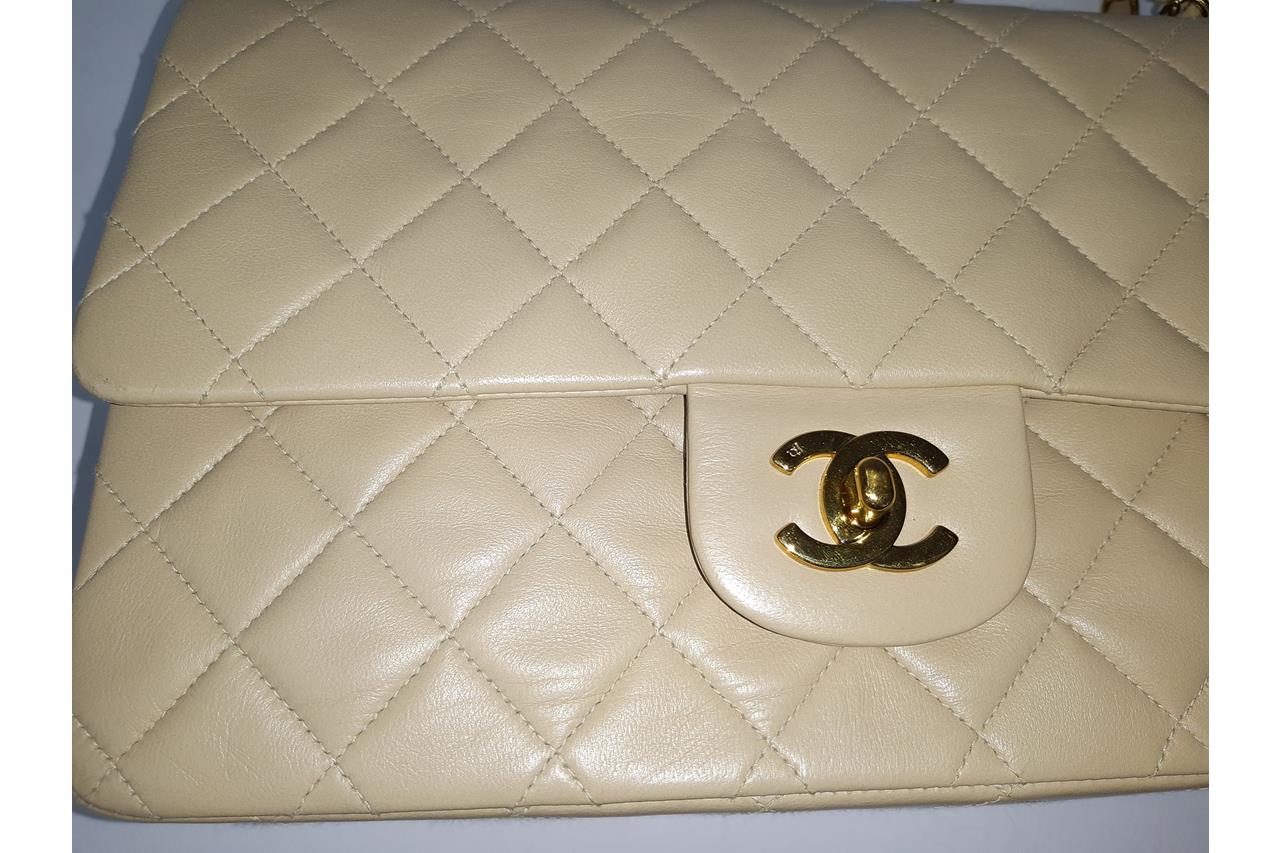 Chanel Classic Double Flap Bag. Featuring beige lambskin leather, gold-tone hardware, and double flaps with CC turn-lock on the front. Approximate dimensions: 25.5cm (L) x 16cm (H) x 6.5cm (D), and 42cm leather and chain strap. Accompanied by Chanel dust bag and box. With Entrupy Certificate of Authenticity. (Pre-owned)